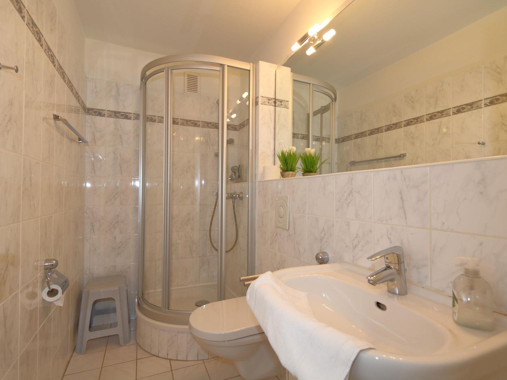 Badezimmer mit Dusche, WC, Waschtisch. Ausreichend Handtücher und Vorleger.