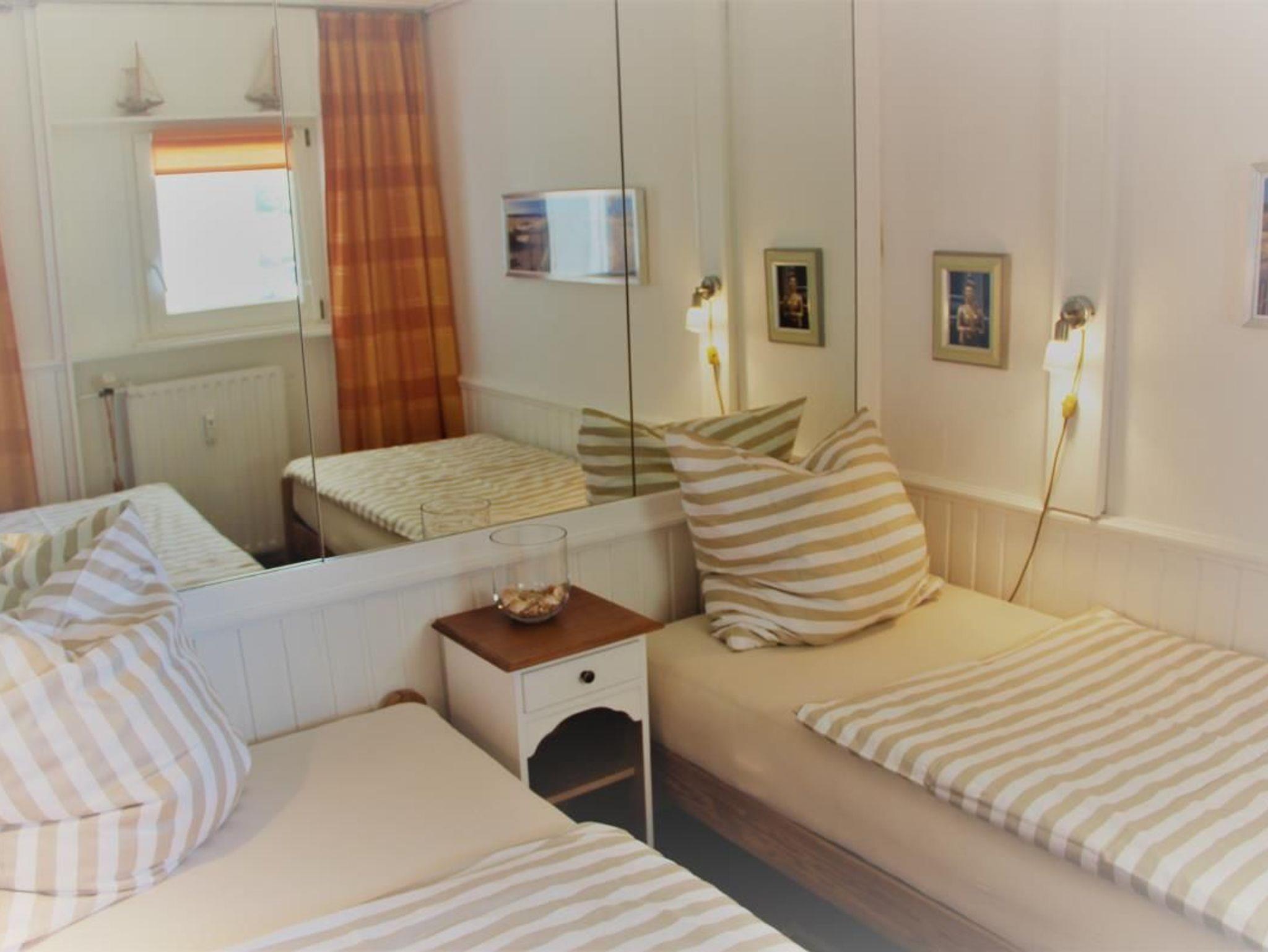 Ein Schlafzimmer mit 2 Einzelbetten, Einbauschränke im Flur.