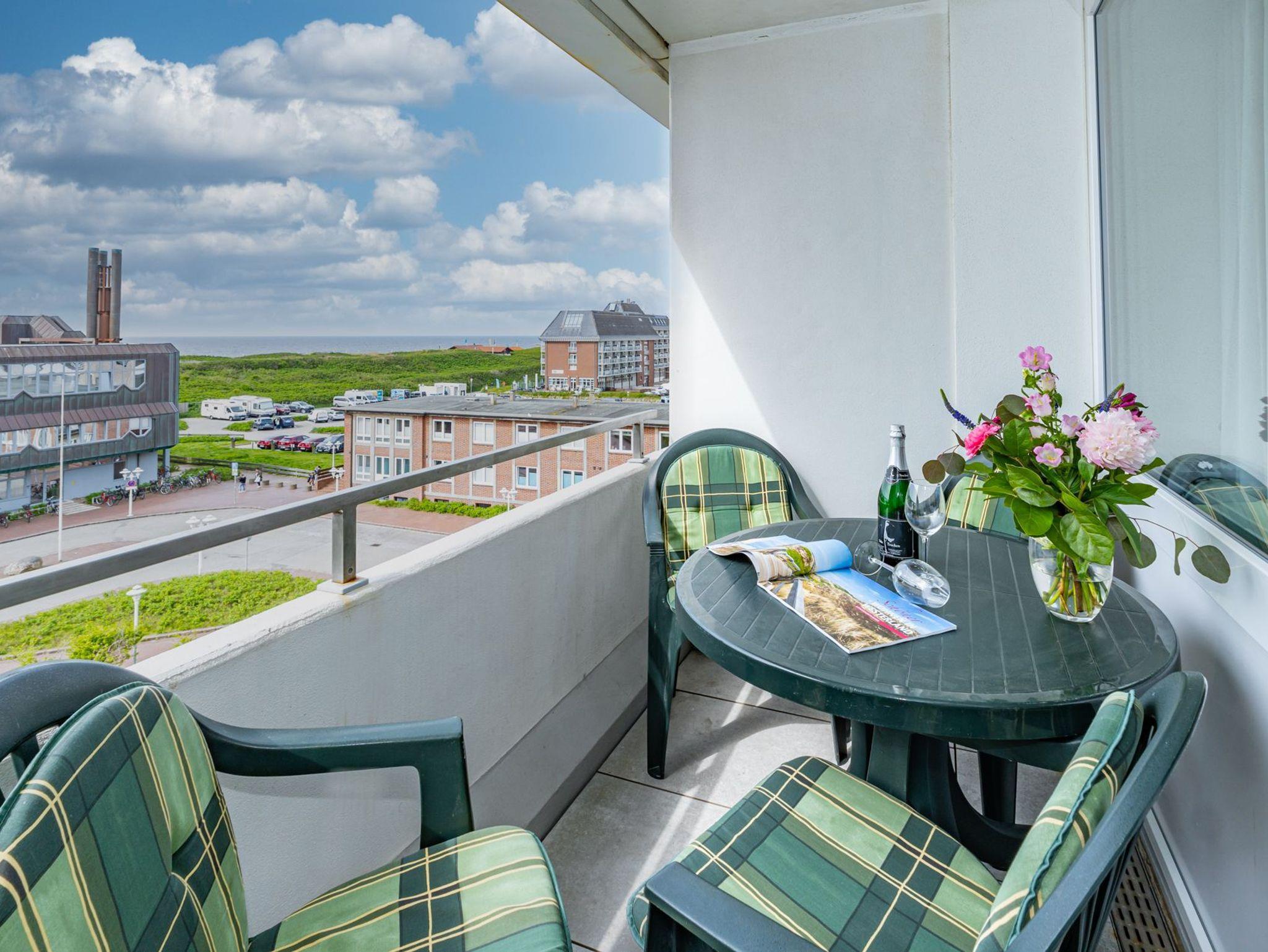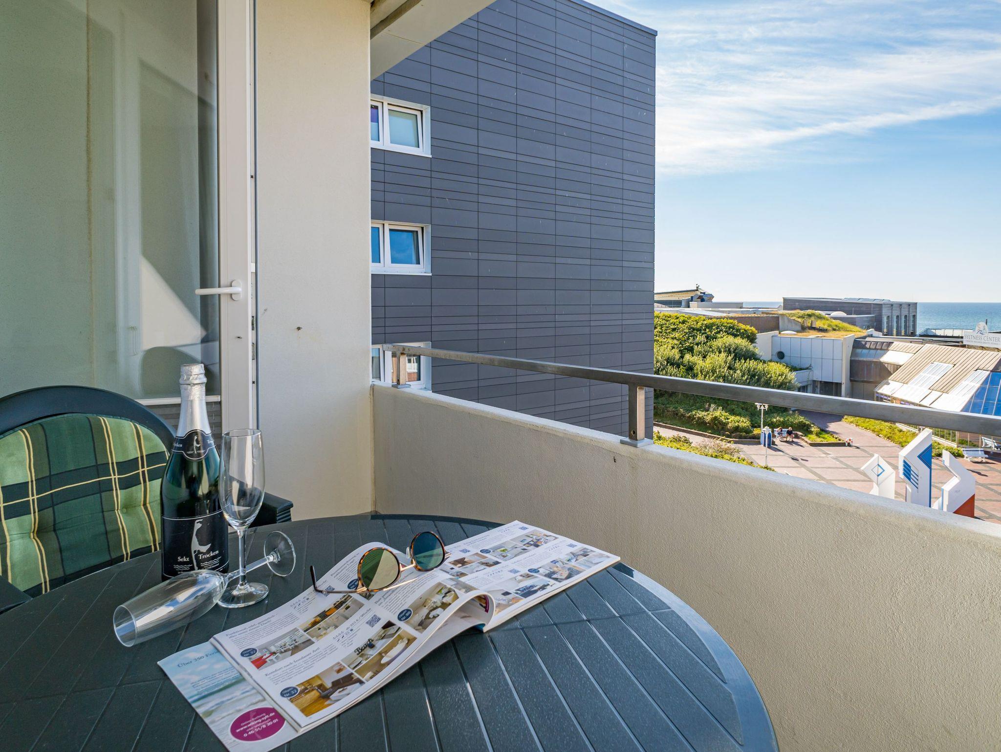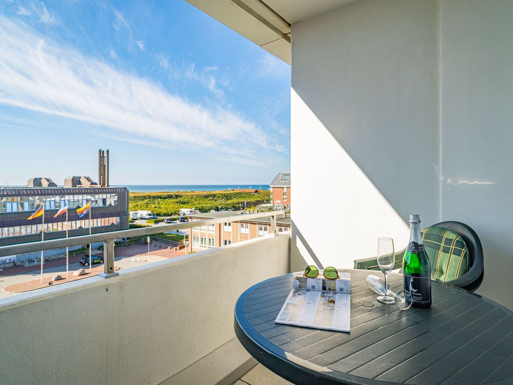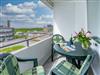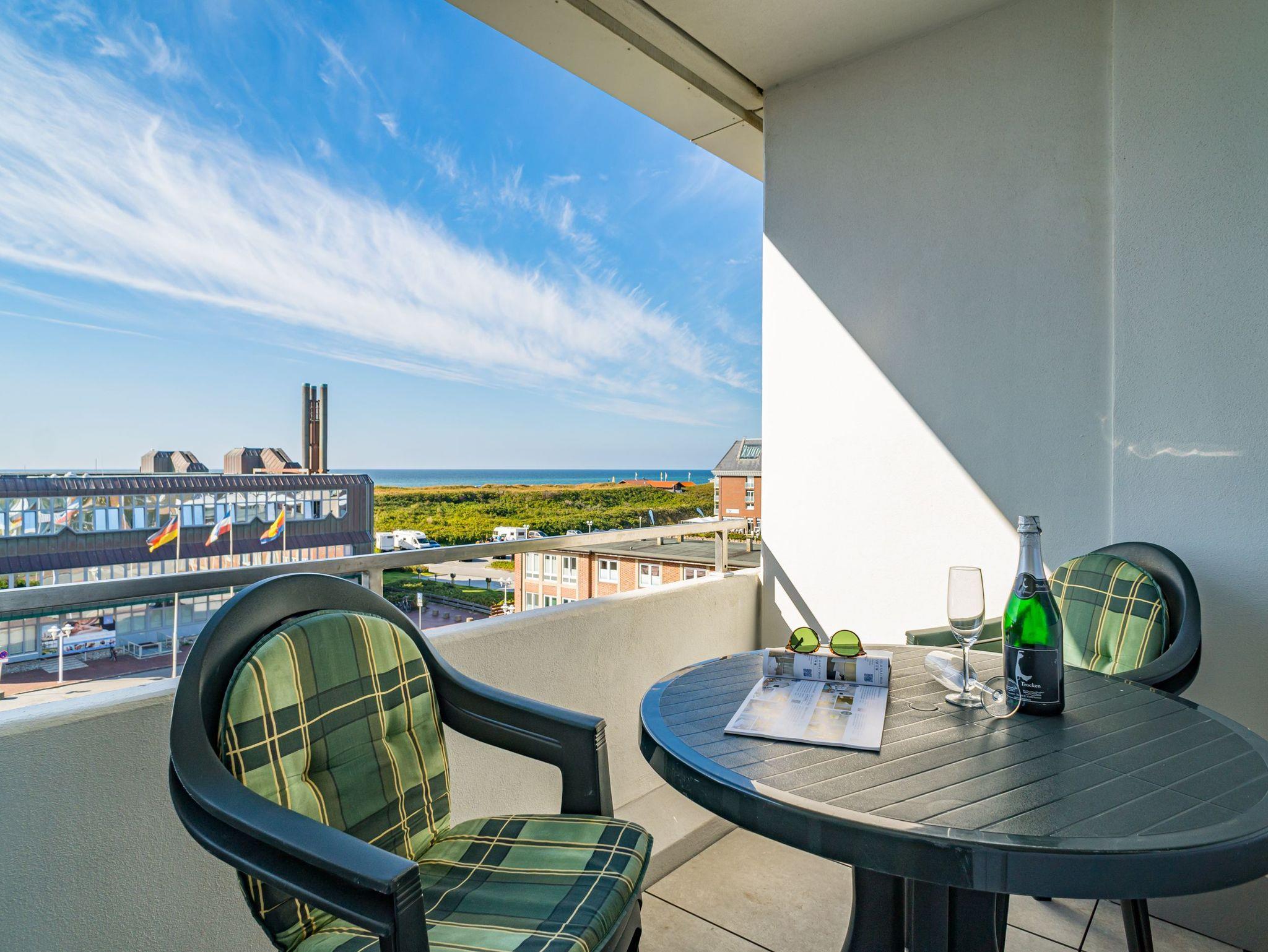 1-Zimmer-Nichtraucher-Ferienwohnung (ca. 25 qm) in der 4. Etage zur Seeseite mit Westloggia und Meerblick (Abendsonne, mit Balkonmöbeln und Auflagen) für max. 2 Personen.