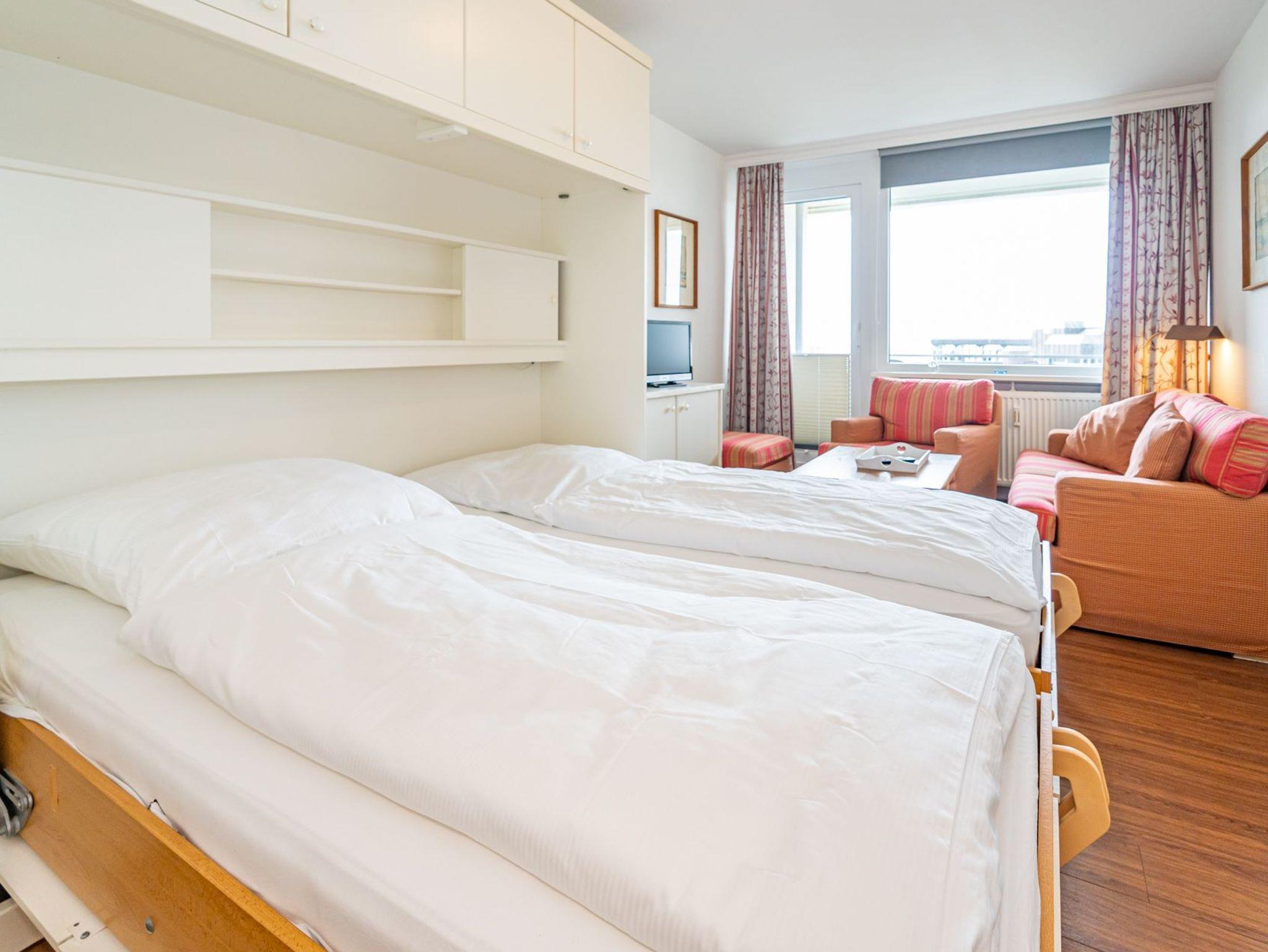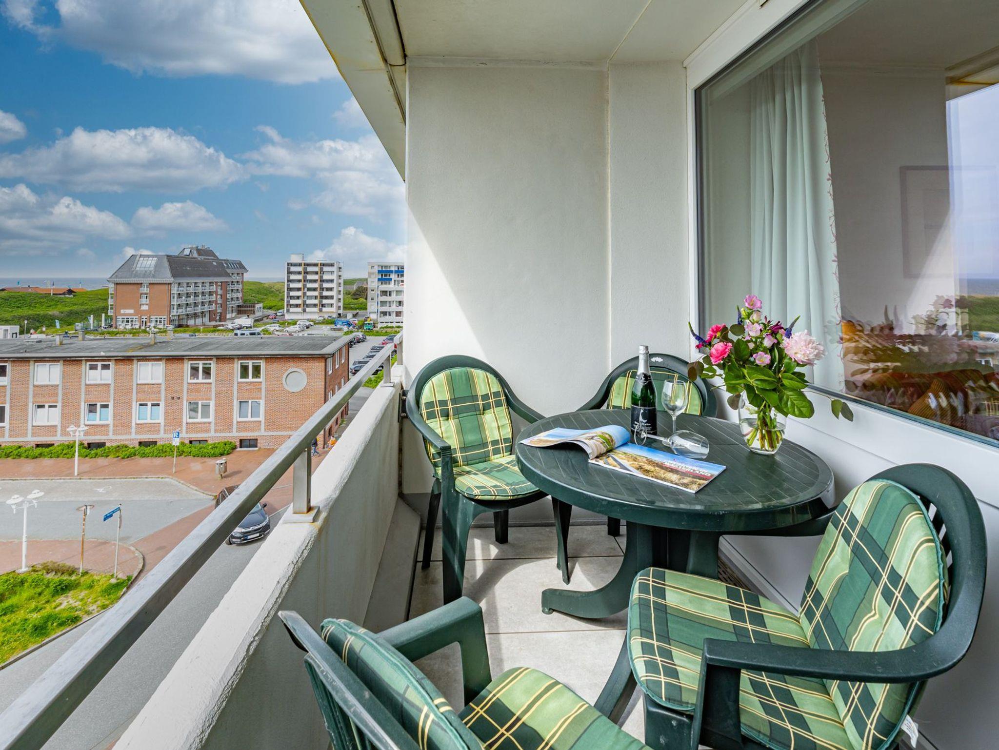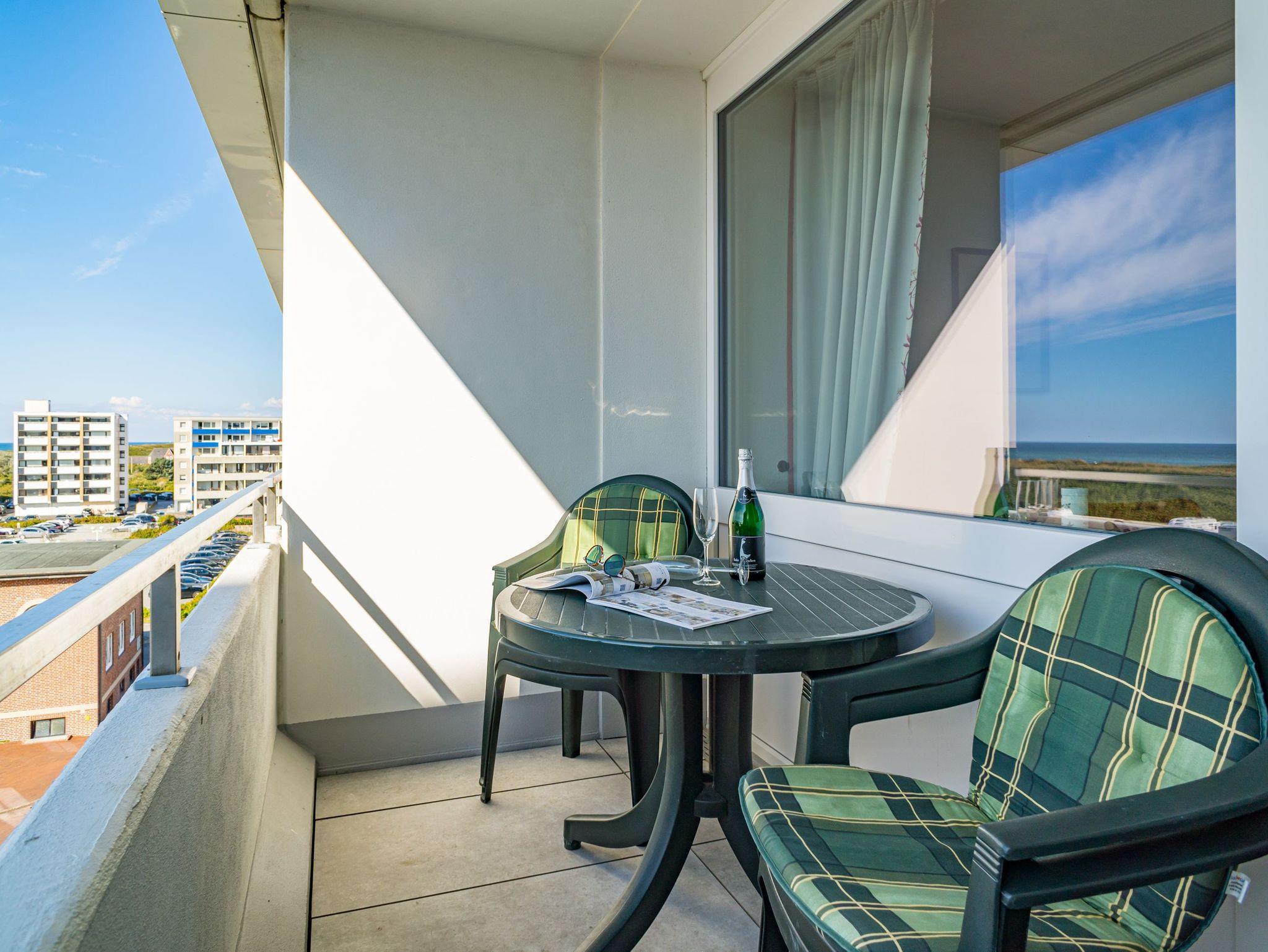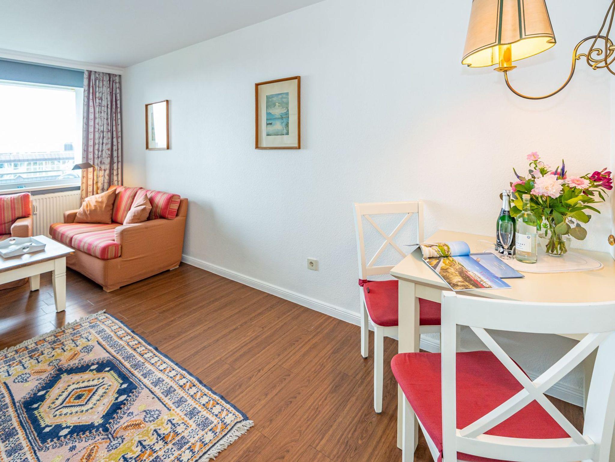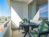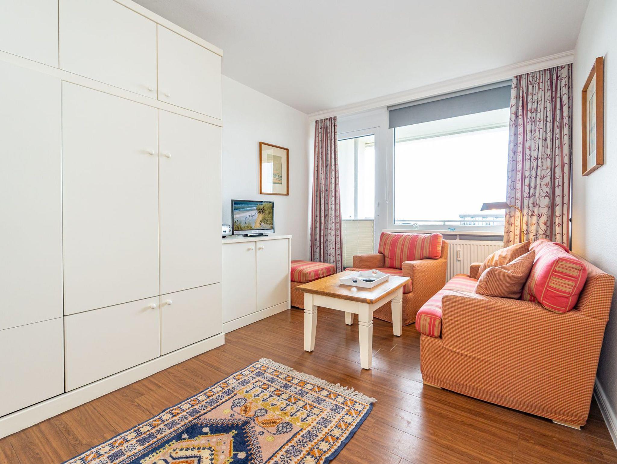 1-Zimmer-Nichtraucher-Ferienwohnung (ca. 25 qm) in der 4. Etage zur Seeseite mit Westloggia und Meerblick (Abendsonne, mit Balkonmöbeln und Auflagen) für max. 2 Personen.