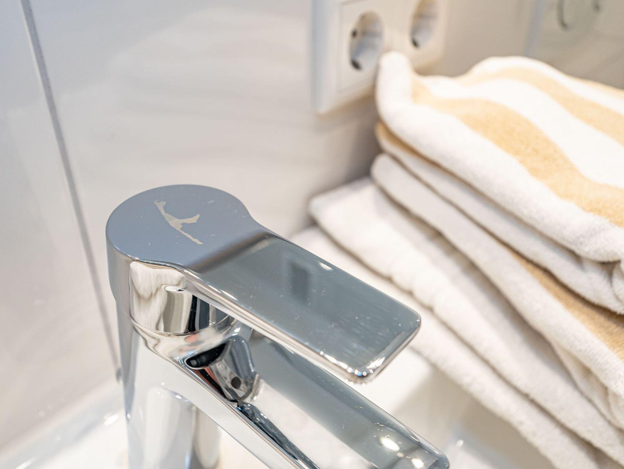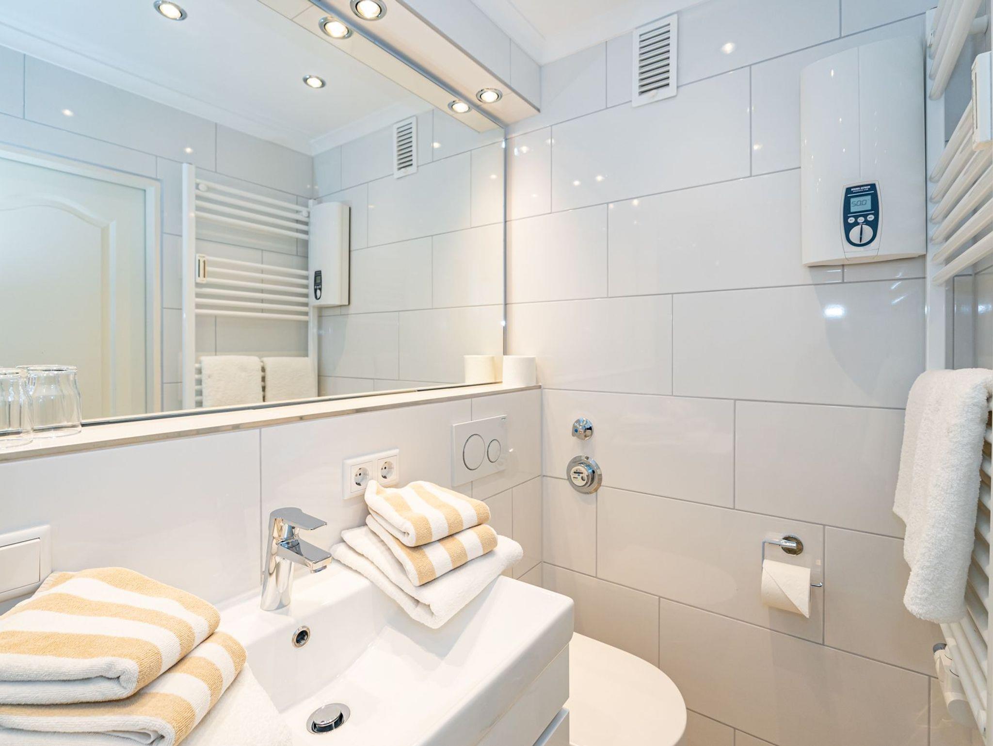 Im Bad befinden sich eine Dusche, ein WC und ein Waschtisch.