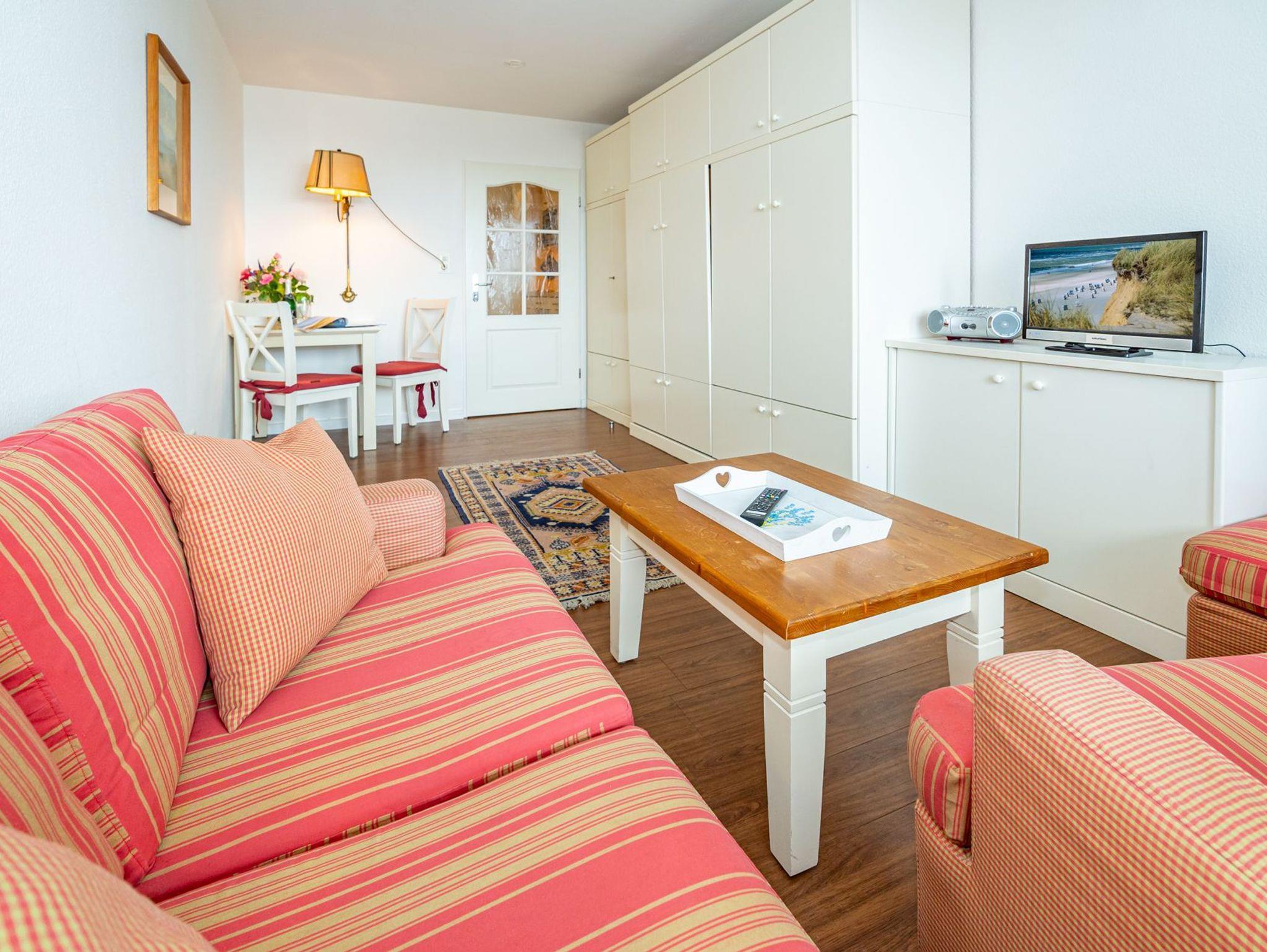 Der Wohn-/Schlafraum besteht aus einer Sitzgarnitur (Zweisitzer und Sessel), einem Essplatz, Doppelschrankbetten (einzeln aufklappbar), Kabel-Flachbild-TV, Radio.