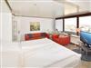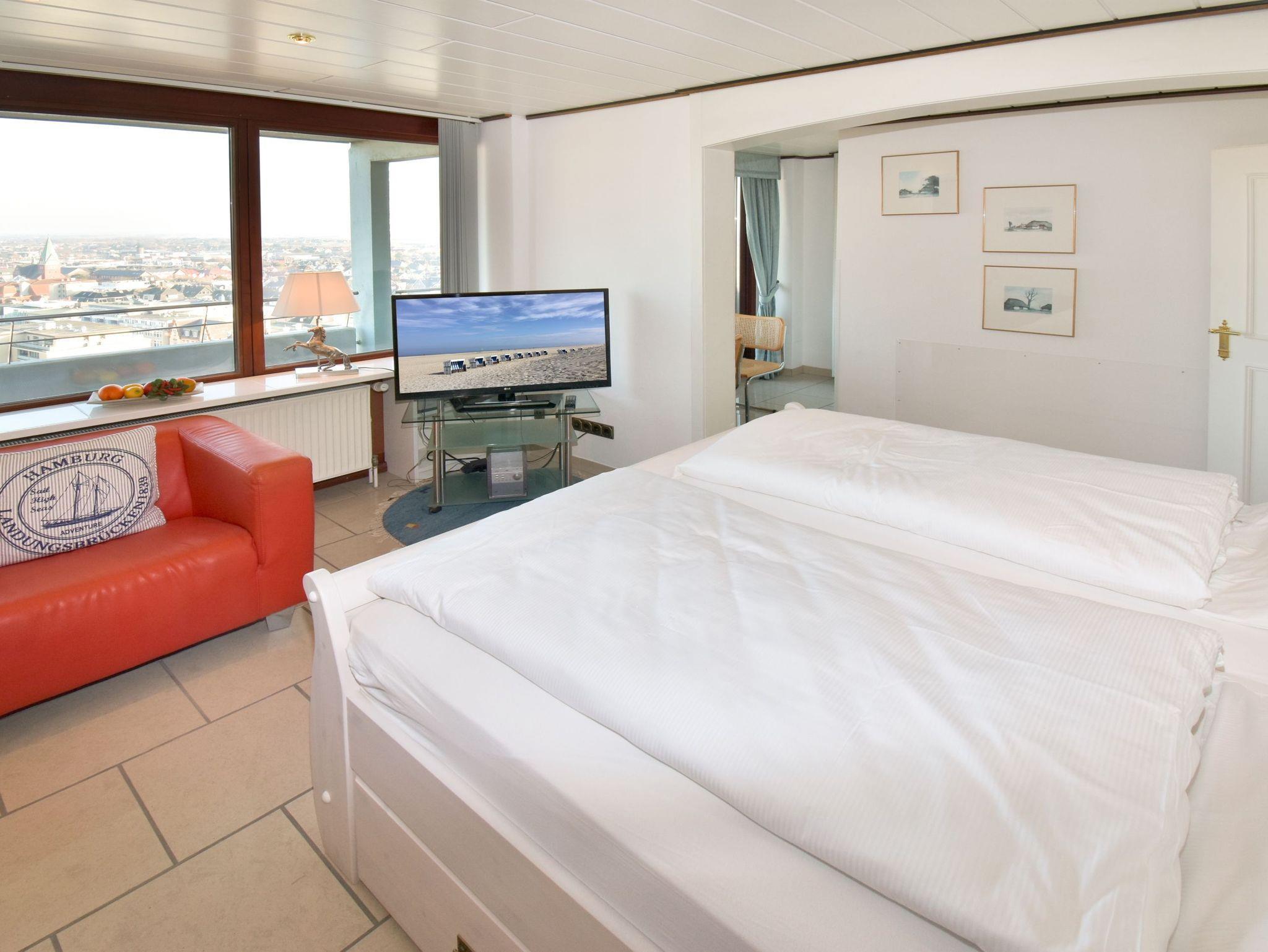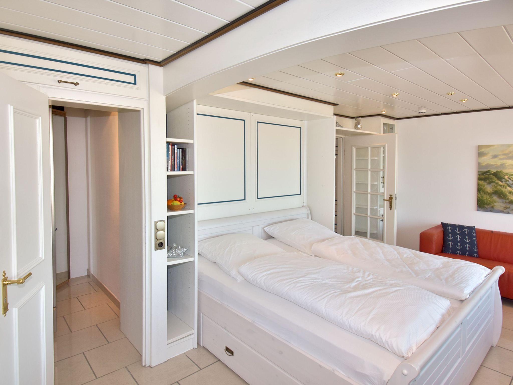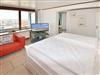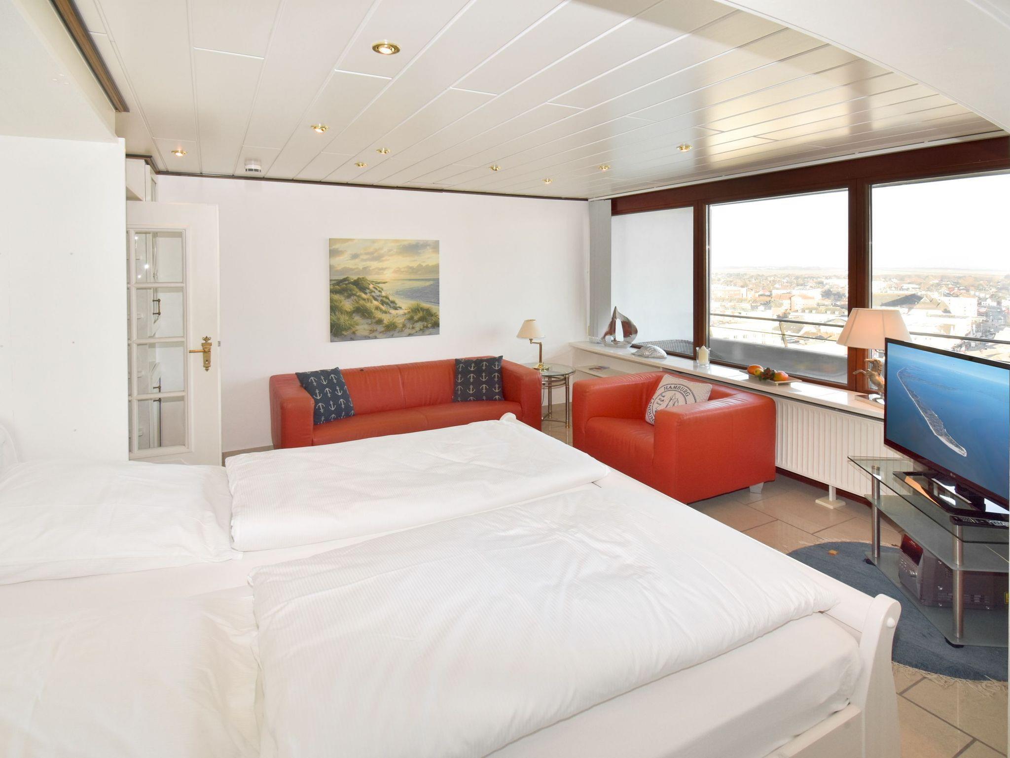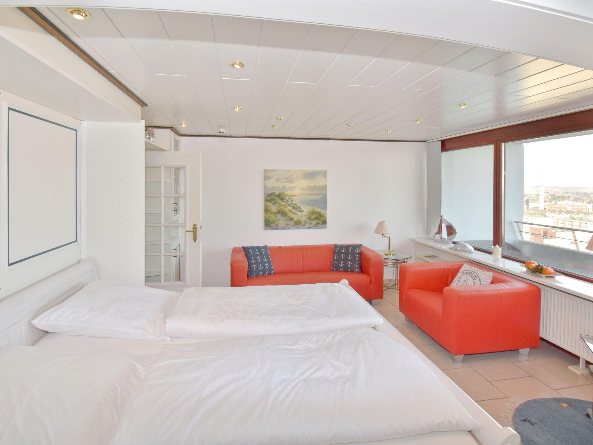 Im hellen Wohn- und Schlafbereich sorgt ein fest installiertes Doppelbett (0,90 x 2,00m - bestehend aus zwei Einzelmatratzen), für erholsame Nächte. Eine stilvolle, rote Leder-Couchgarnitur, ein separater Essplatz direkt am Fenster, ein großer Flachbildfernseher, sowie ein begehbarer Kleiderschrank runden das Ambiente perfekt ab. Der direkte Zugang zum Ostbalkon ermöglicht zusätzlichen Raum für entspannte Stunden.