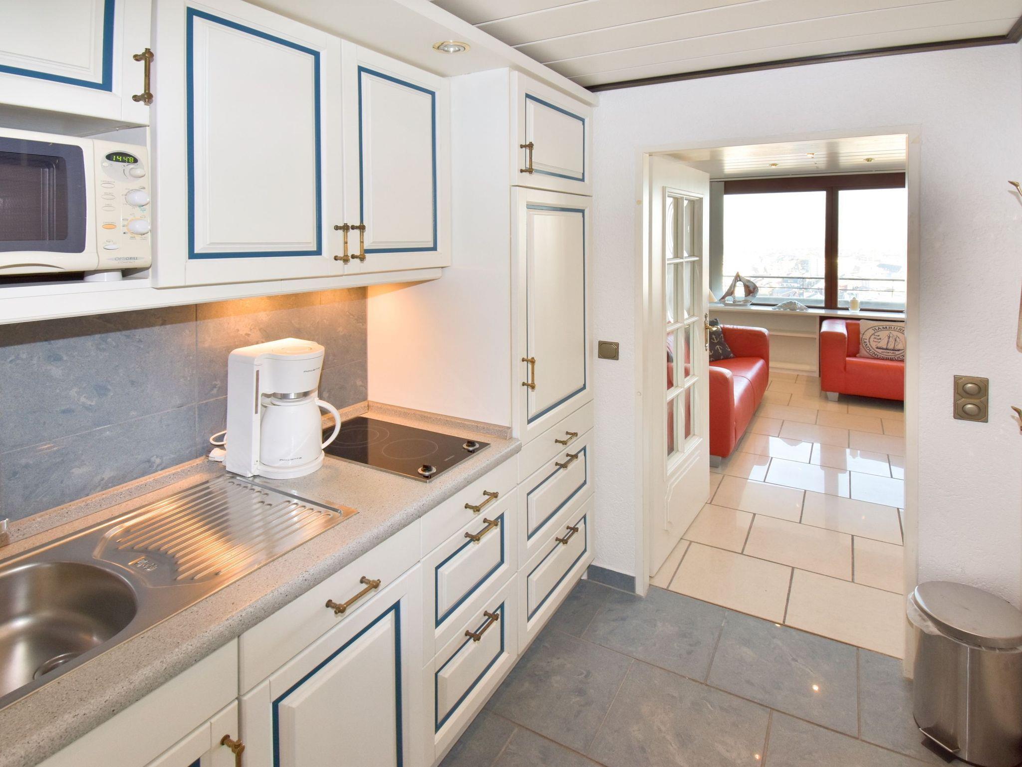 Die offene Küche ist mit einem 2-Platten-Ceranfeld, einer Mikrowelle, einem Kühlschrank, einem Eierkocher und einem Stabmixer gut ausgestattet. Kaffeemaschine, Wasserkocher und Toaster gehören ebenfalls zur Grundausstattung.