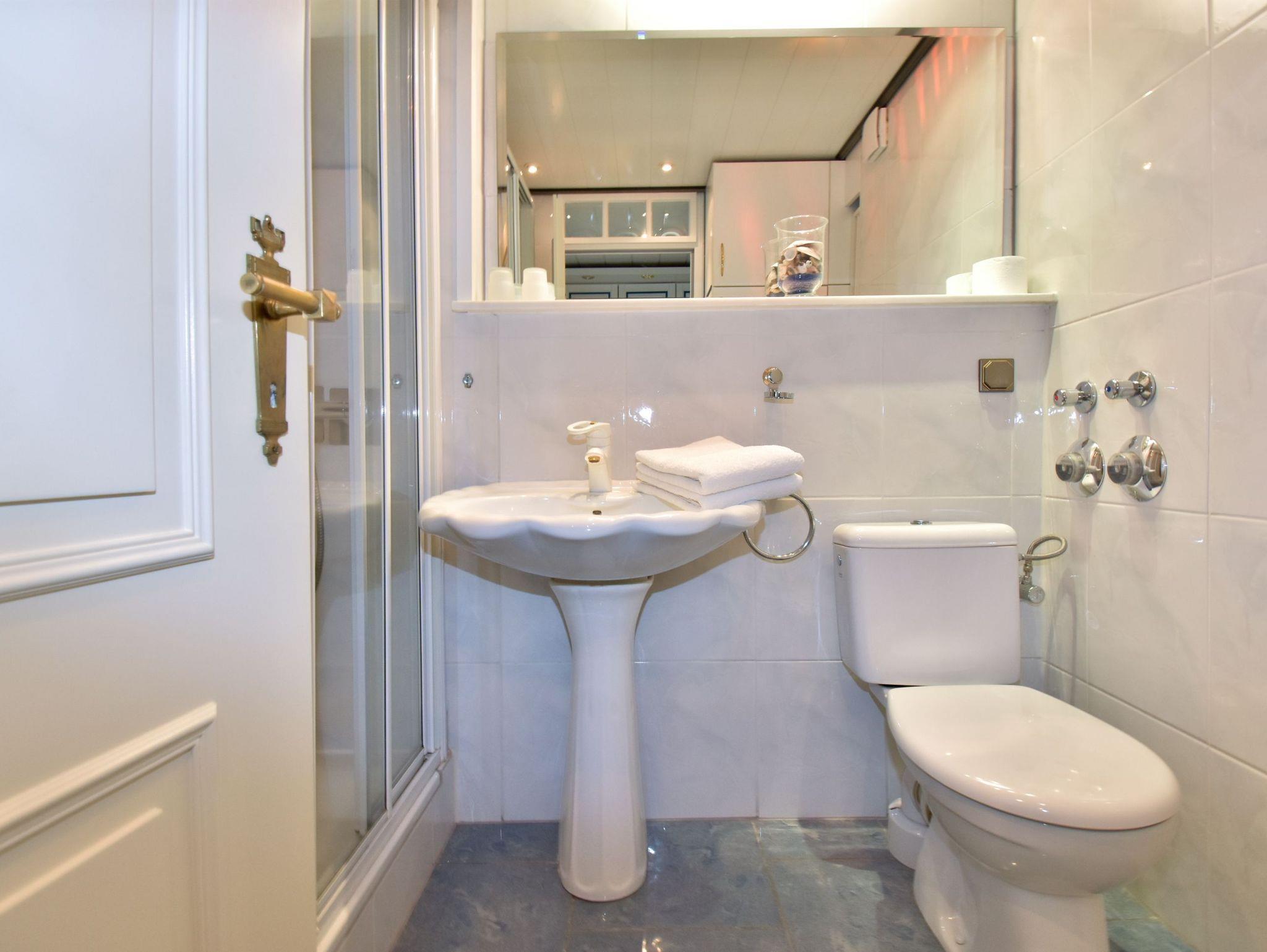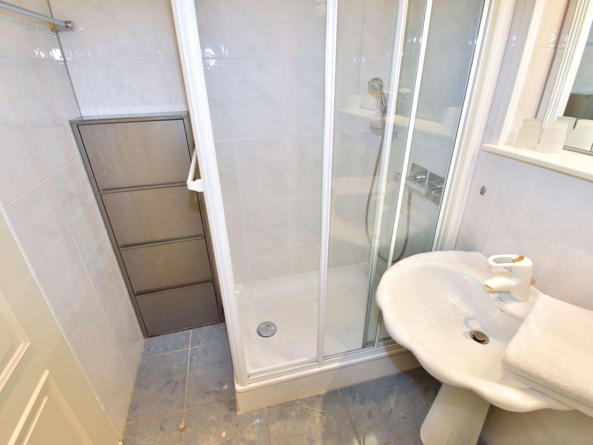 Das Duschbad ist ausgestattet mit einer Dusche, einem Waschtisch und einem WC.