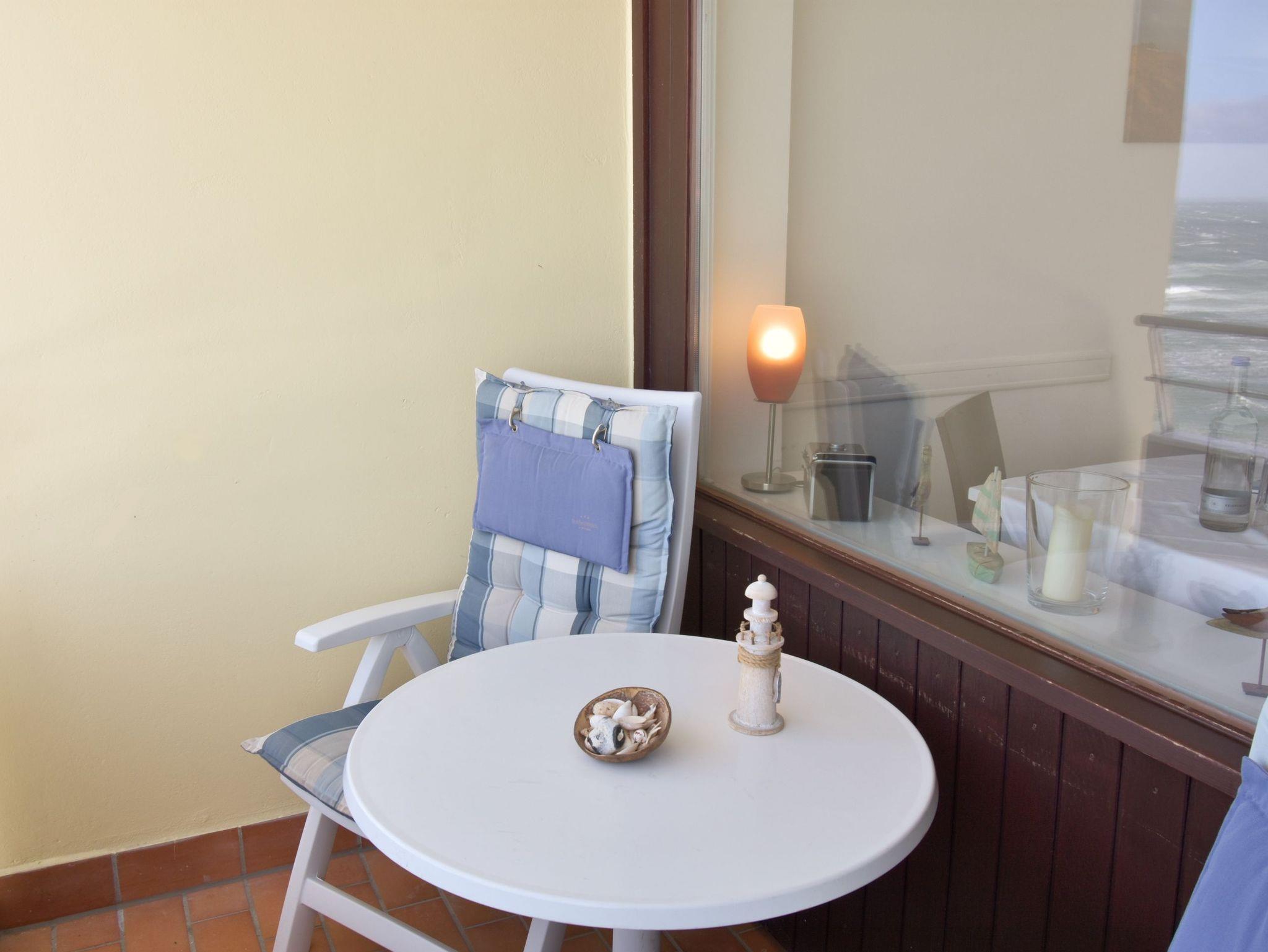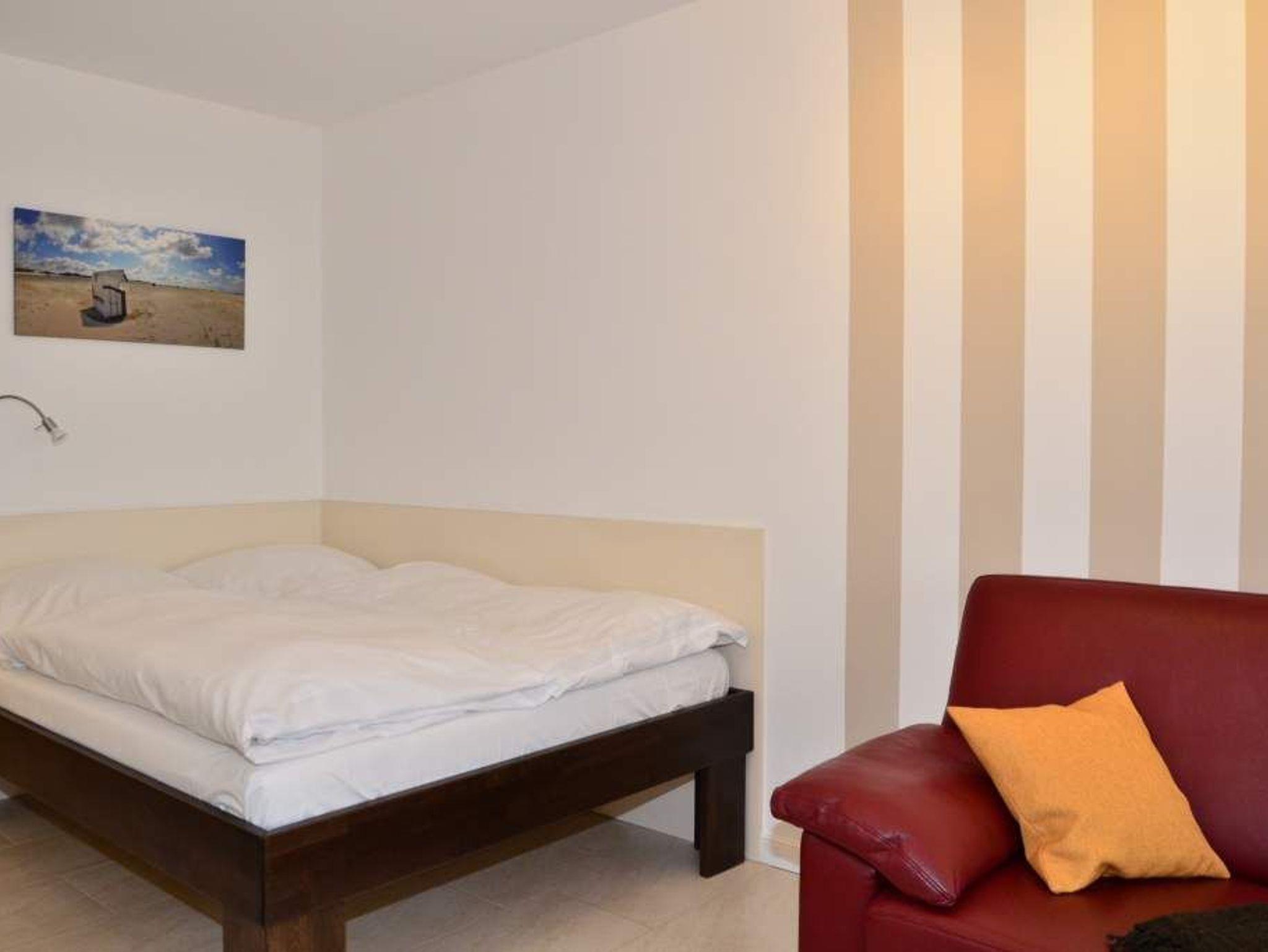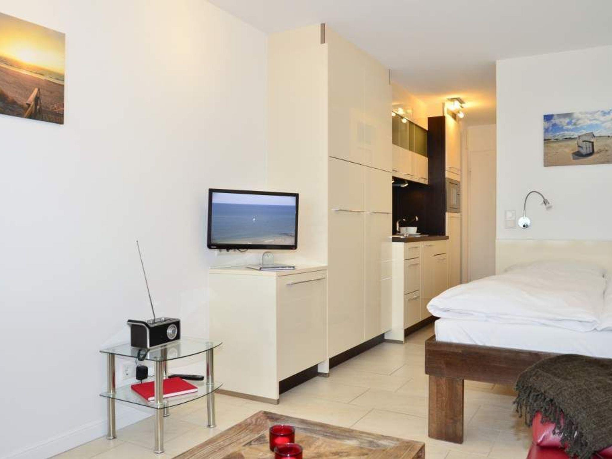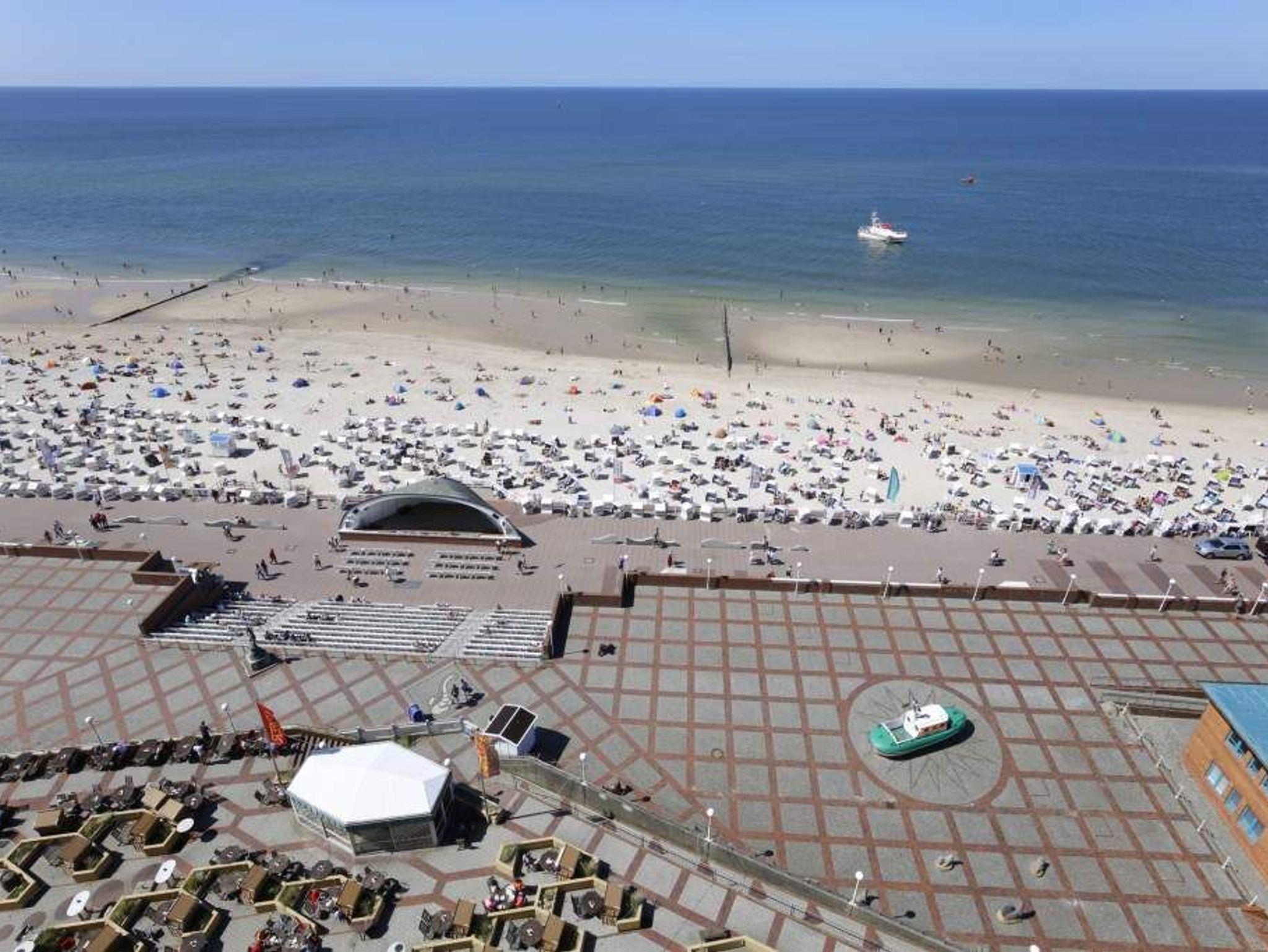 Wohn-/Schlafzimmer: angenehmer Schlaf durch erhöhtes Komfortbett (1,40 x 2,00), aus massivem Holz mit 7-Zonen-Kaltschaummatratze und hochwertiger, stufenlos verstellbarer Lattenrost. Beschichtete Plissees dunkeln den Raum ab und ermöglichen ein angenehmes Schlafen. Das erhöhte Bett bietet die Möglichkeit unter diesem Gepäck zu verstauen. Hochwertige italienische 2-Sitzer-Leder-Couch mit Federkern. Essplatz mit Blick auf die Nordsee. Flachbild-TV mit integriertem CD/DVD, Radio, Westbalkon mit außergewöhnlichem Blick auf die offene Nordsee, den Strand, die Promenade, die unendliche Weite; genießen Sie von hier das Schauspiel der untergehenden Sonne. Balkonmöbel.