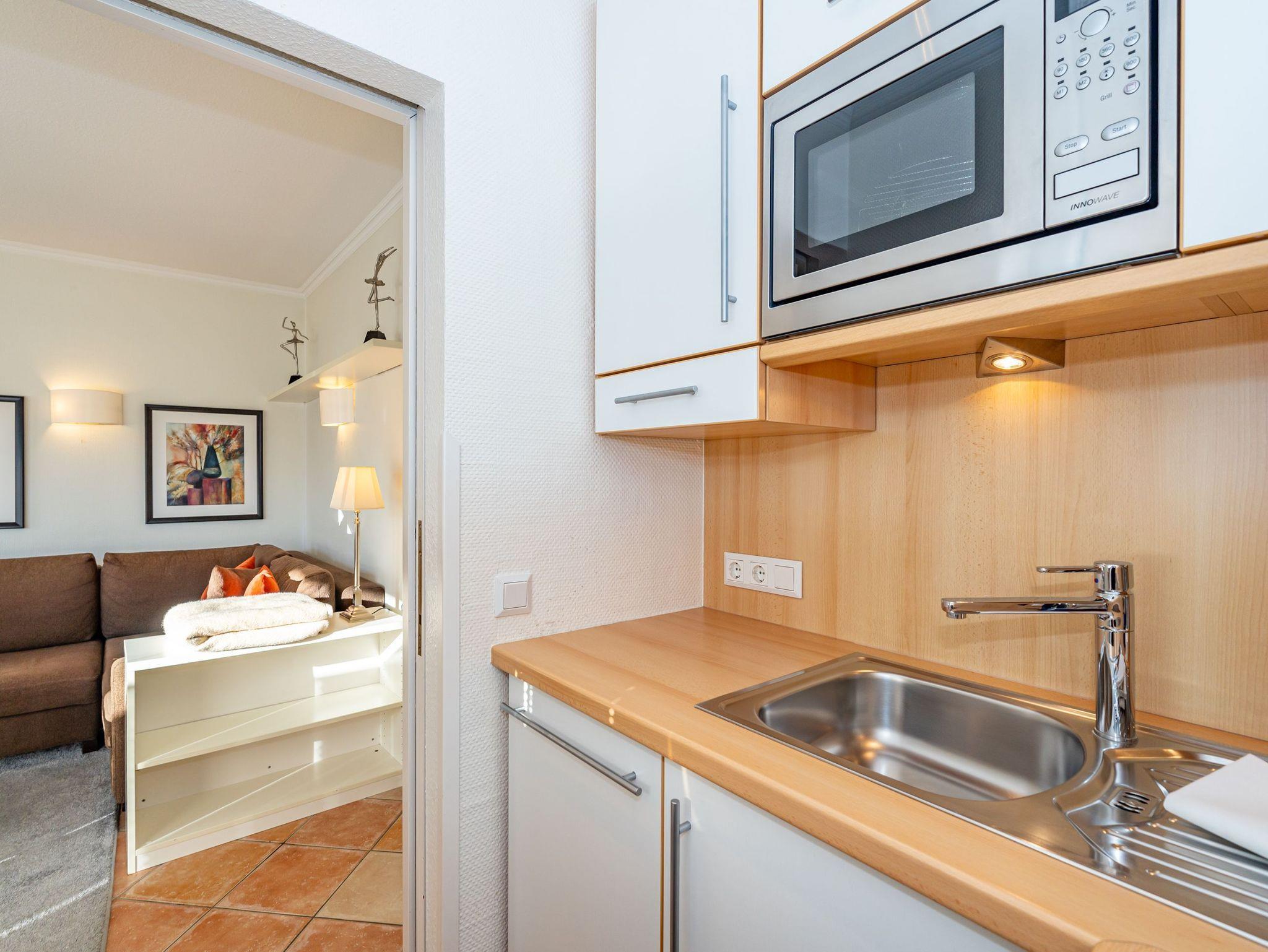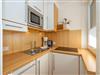 Die separate Küche mit Fenster und Tür ist kompakt und praktisch gestaltet. Sie ist ausgestattet mit einem Geschirrspüler, einer Mikrowelle sowie einem Kühlschrank mit Gefrierfach. Zur Grundausstattung gehören außerdem eine Kaffeemaschine, ein Wasserkocher und ein Toaster. Das ruhige Schlafzimmer bietet ein komfortables Doppelbett, einen geräumigen Kleiderschrank sowie einen weiteren Flachbild-TV für entspannte Abendstunden. Das moderne Badezimmer überzeugt mit einer Dusche, einem Waschtisch, einem Handtuchtrockner und einem WC.
