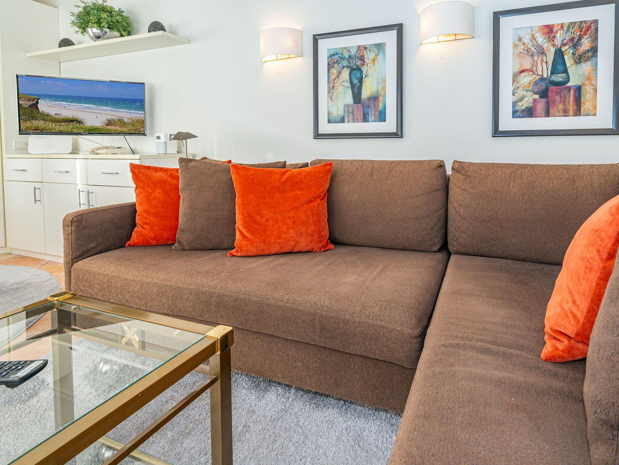 Beim Betreten der Wohnung gelangen Sie über einen einladenden Vorflur in das lichtdurchflutete Wohnzimmer, die separate Küche, das Schlafzimmer sowie das moderne Duschbad/WC. Das stilvolle Wohnzimmer verfügt über eine gemütliche Eckcouch mit Schlaffunktion (Liegefläche. 160x 200 cm), einen Essplatz am Fenster sowie moderne Unterhaltungstechnik mit Kabel-Flachbild-TV, Telefon und WLAN (ohne Gewähr). Vom Wohnbereich haben Sie direkten Zugang zum großzügigen Süd-West-Balkon, der in der Nachmittagssonne mit gemütlichen Sitzmöglichkeiten zum Verweilen einlädt.