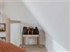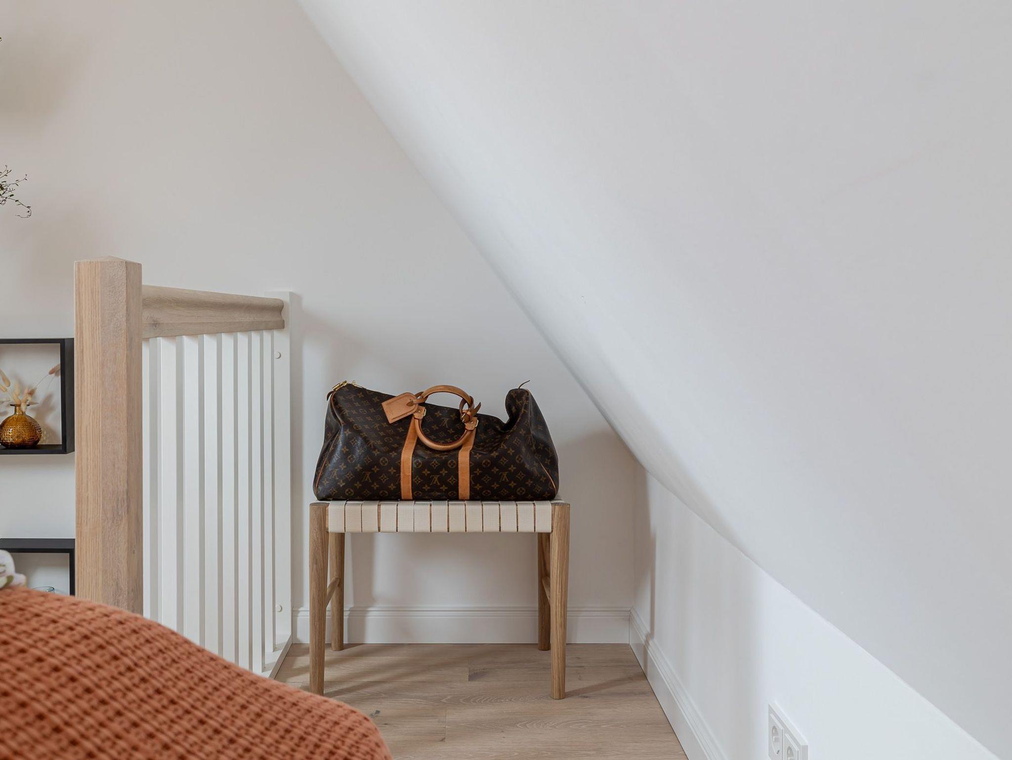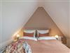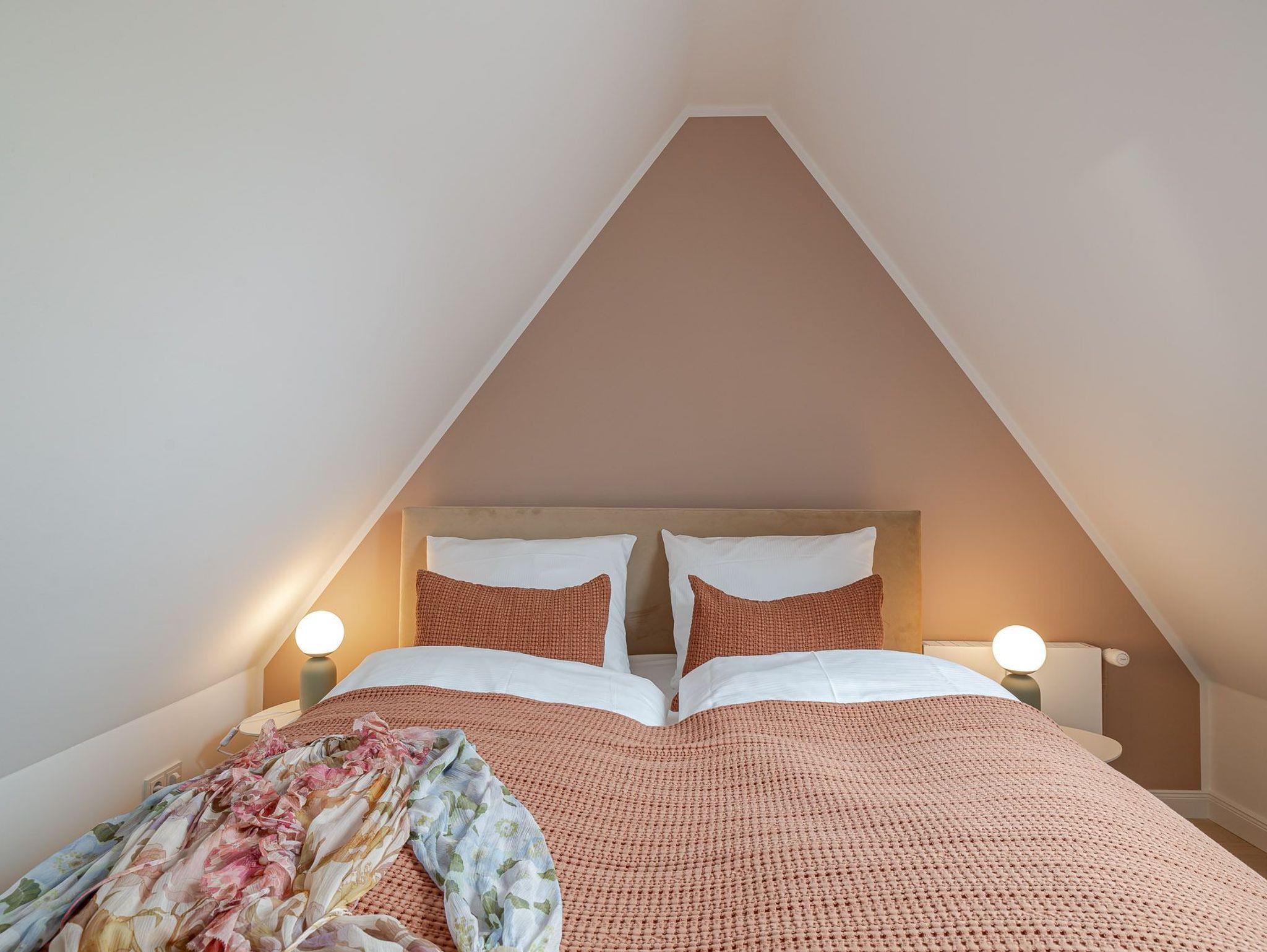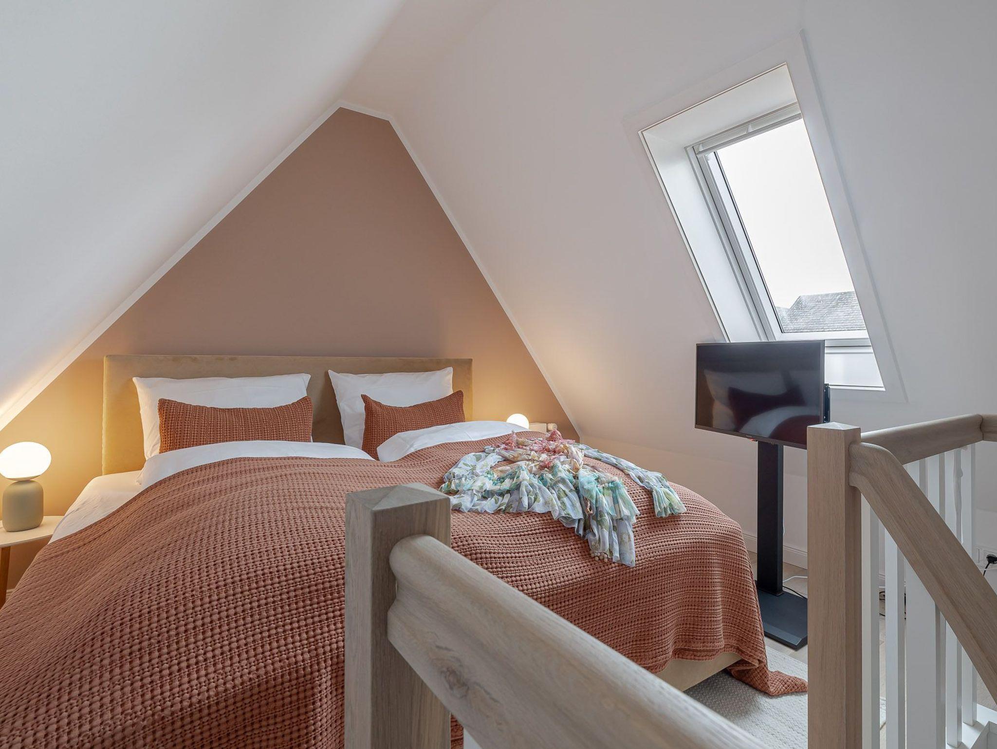 Zum gemütlichen Schlafzimmer gelangen Sie über die Treppe. Dort angekommen, erwartet Sie ein herrlich komfortables Boxspringbett der Marke Schramm, in dem Sie Kraft für den nächsten Urlaubstag tanken können.