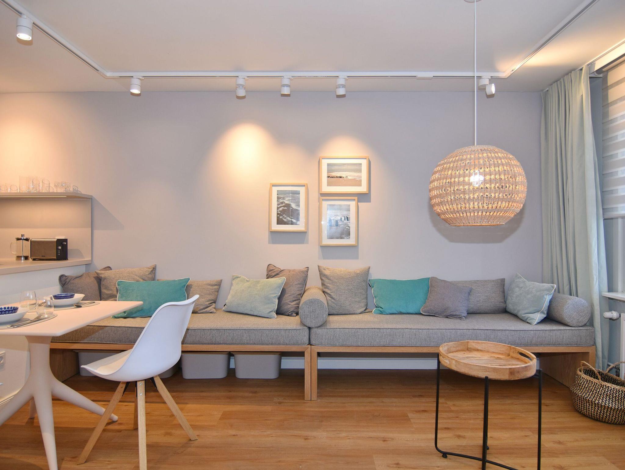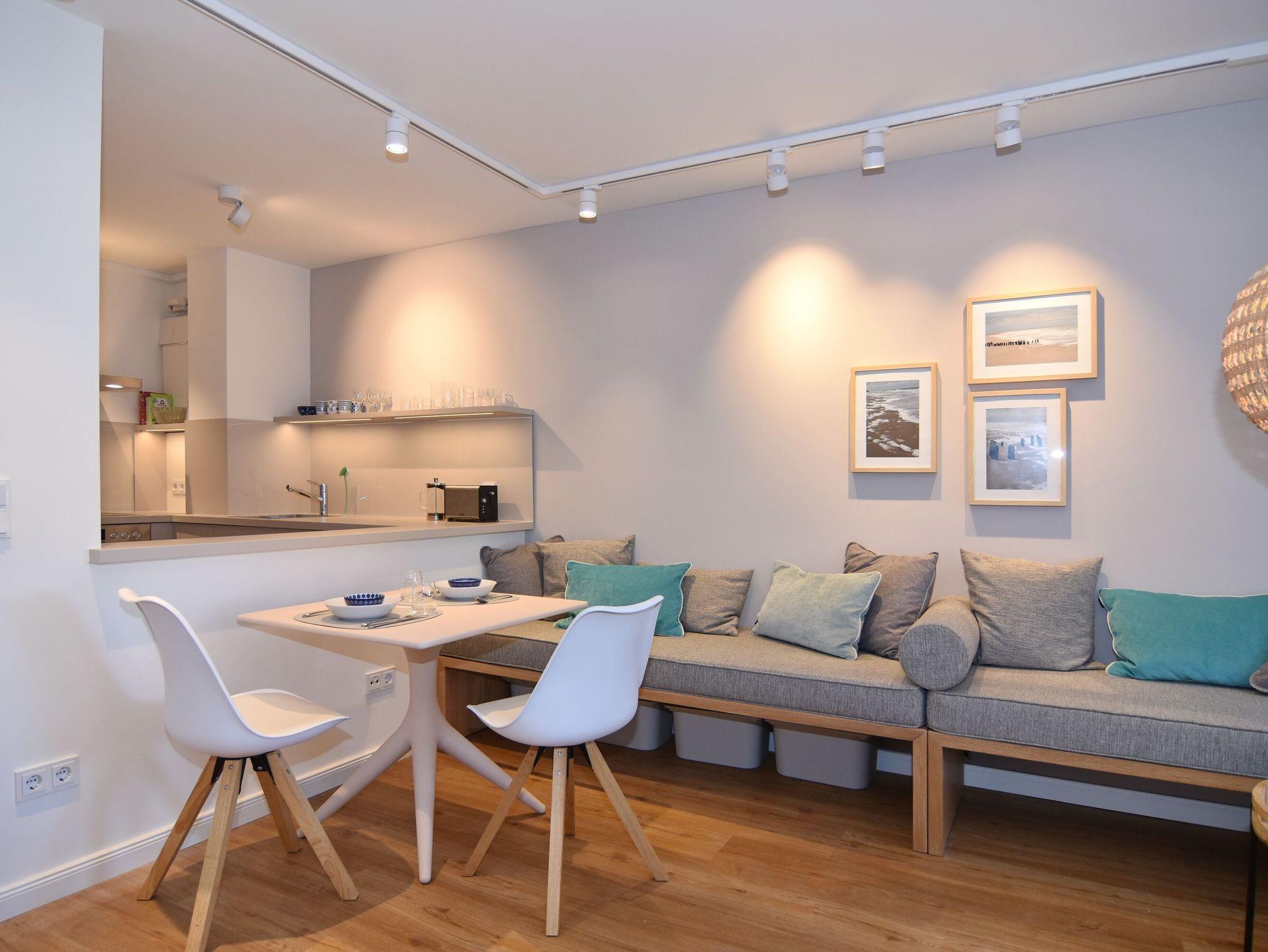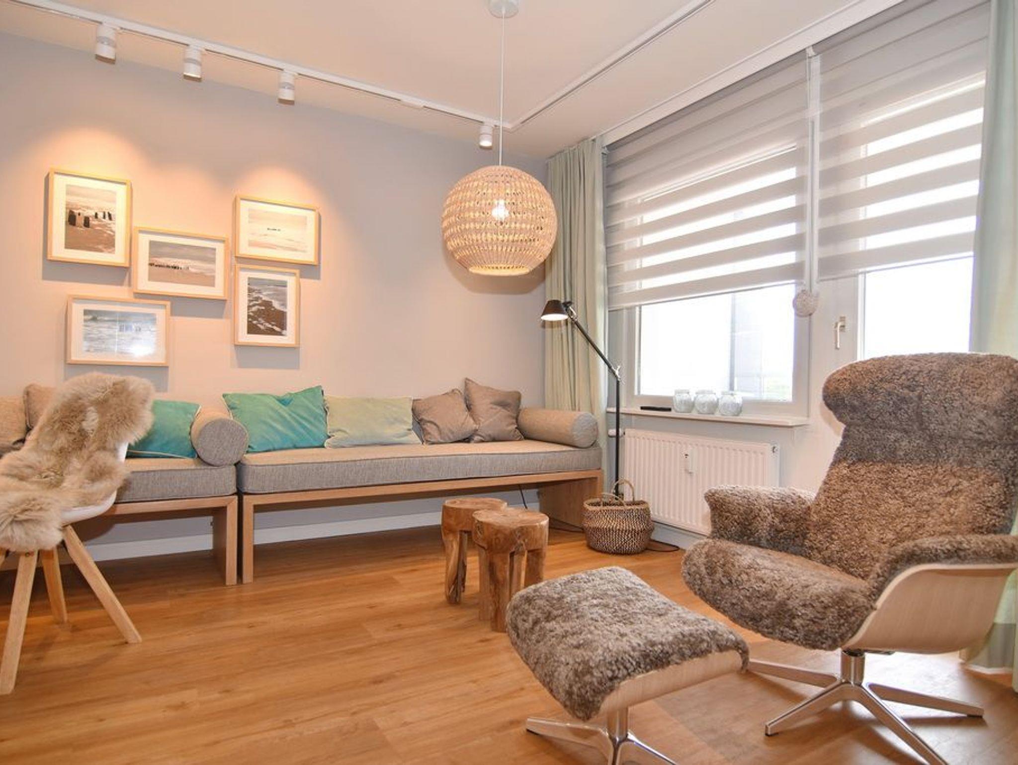 Moderne 2-Zimmer-Wohnung im Herzen von Westerland. Alle Einkaufsmöglichkeiten und der Strand sind bequem und in direkter Nähe fußläufig zu erreichen. Das Wohnzimmer verfügt über eine lange, gepolsterte Eichen-Sitzbank, einem Relaxsessel mit Fusshocker sowie einem Essplatz. Von hier aus gelangen Sie auf den geschützten Westbalkon oder ins geräumige Schlafzimmer mit Doppelbett, TV und Aufbewahrungsmöglichkeiten für Ihre Kleidung. Vom großen Flur mit Garderobe und Spiegel geht es in die 2024 neu gestaltete offene Küche mit 4-Platten-Cerandherd und Backofen und in das helle Bad mit Wanne und Duschvorrichtung. Wlan ist (ohne Gewähr) vorhanden. Zu der Wohnung gehört der Tiefgaragenstellplatz Nr. 54 (ca. 2 m breit, Durchfahrtshöhe 1,80m). Die Garage ist über das Treppenhaus erreichbar. Der Fahrstuhl beginnt im Erdgeschoss. Im Haus befindet sich eine gemeinschaftliche Waschküche mit Münzautomaten. Bettwäsche und Handtücher sind zur Anreise aufgezogen. In der Wohnung ist das Rauchen und Tierhaltung nicht gestattet.