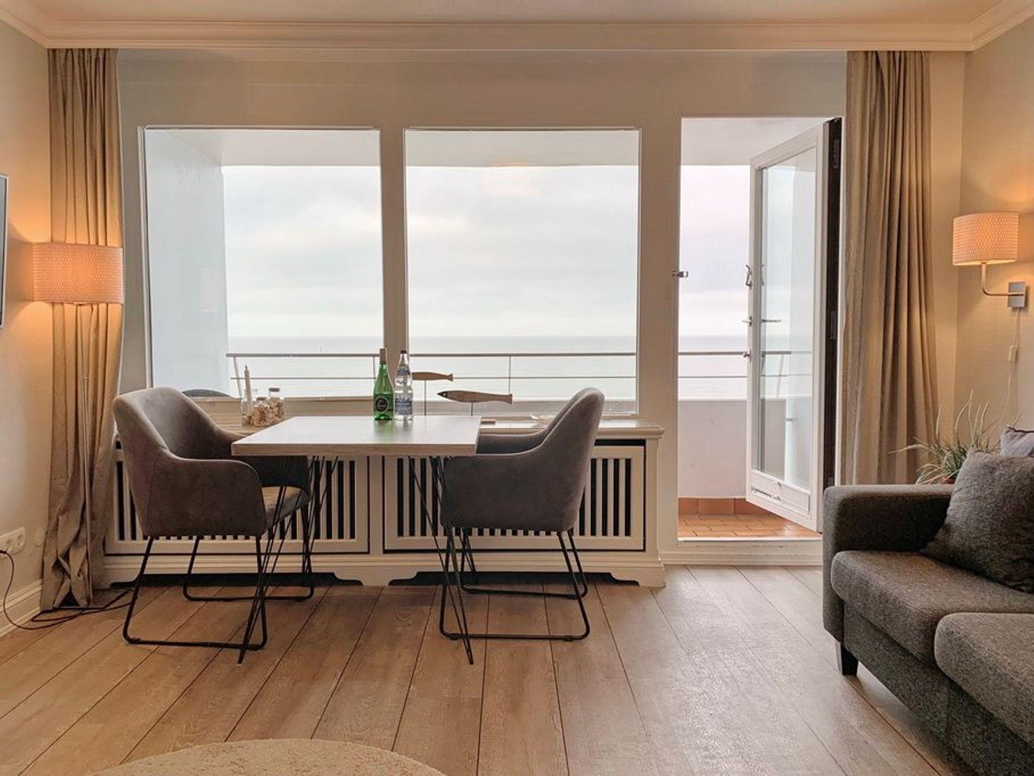 Schicke 1-Zimmer-Ferienwohnung im 10. OG im Haus Metropol zur Seeseite. Freier Meeresblick. Großer Westbalkon mit Balkonmöbeln. Ca. 34 qm . Kombinierter Wohn- / Schlafraum mit Doppelbett (160x200), Essplatz am Fenster, 2-Sitzercouch mit Beistelltisch, Flat-TV, WLAN (ohne Gewähr). Küchenzeile im Flurbereich mit Geschirrspüler. Duschbad/WC. Nichtraucher! Keine Haustiere! Bettwäsche und Handtücher sind zur Anreise aufgezogen. Ein PKW-Stellplatz kann kostenpflichtig zugebucht werden.