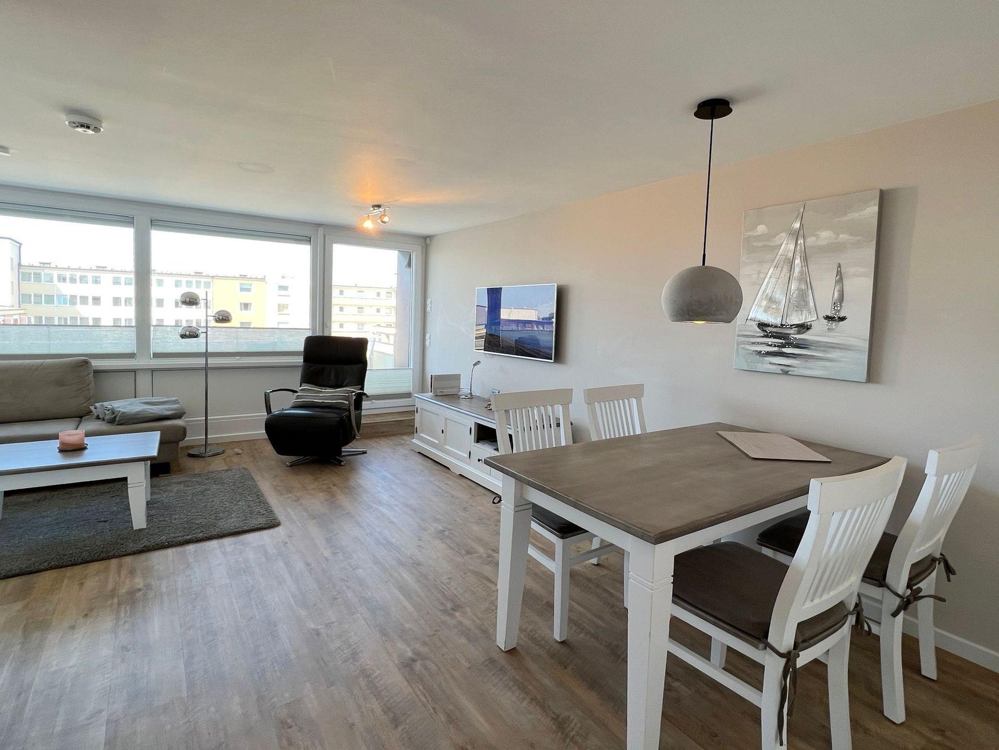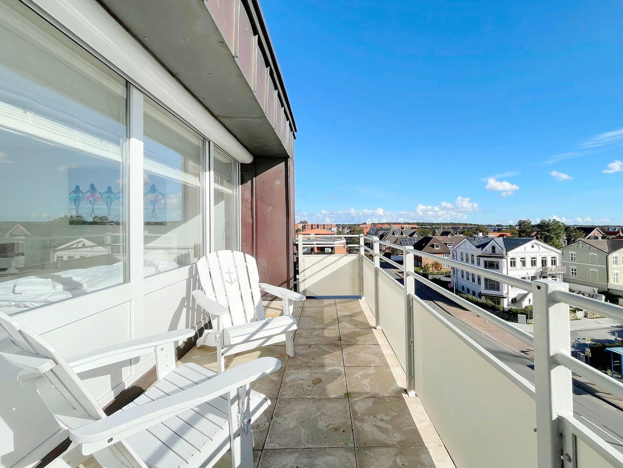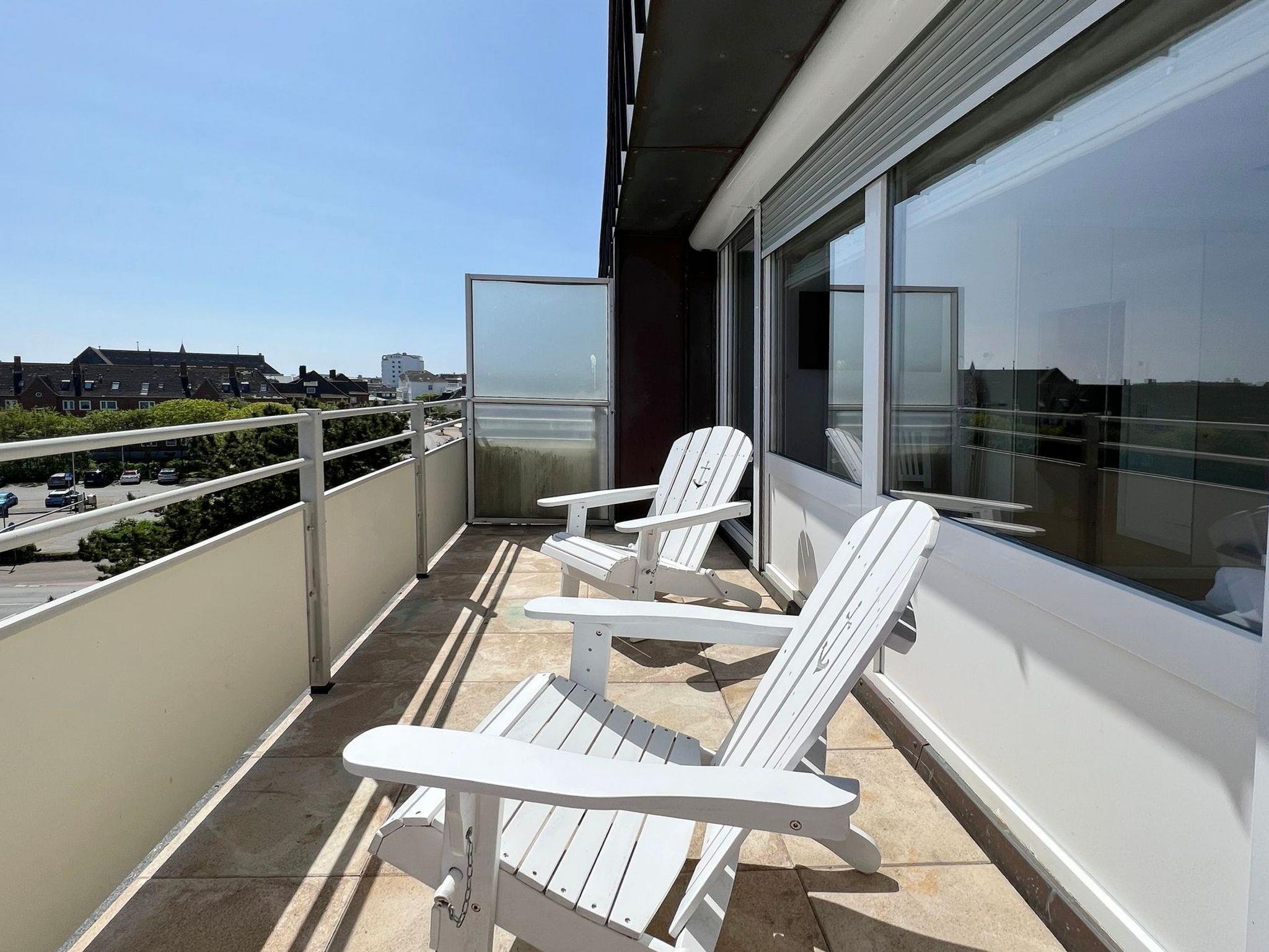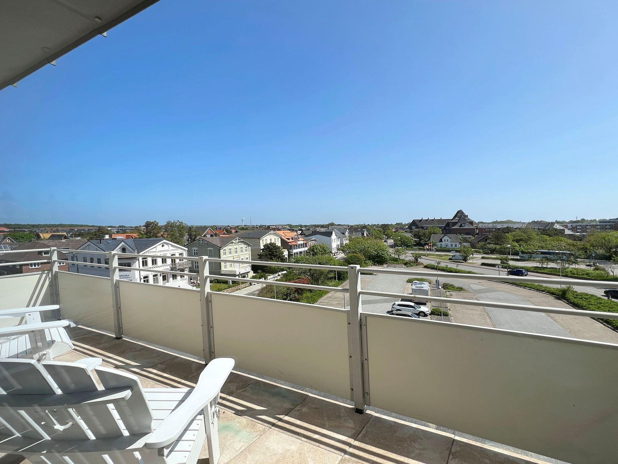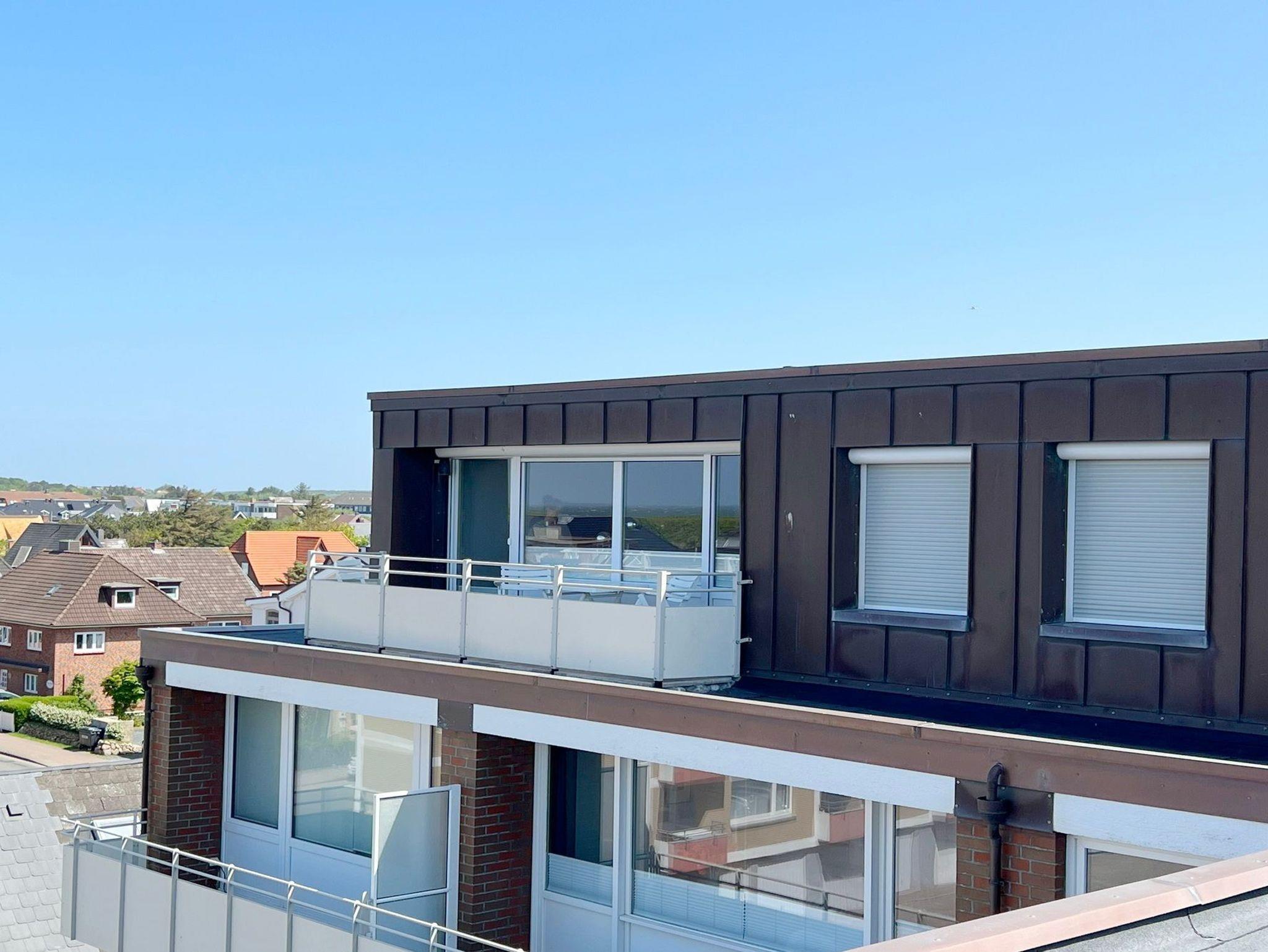 Penthouse-Ferienwohnung im Haus Germania. Modernes Wohnzimmer mit offener Küchezeile, Essecke, Couch zum Relaxen und West-Balkon mit kleinem Meerblick. Schlafzimmer mit Doppelbett und zweitem Balkon nach Osten. Zweites Schlafzimmer mit 2 Einzelbetten, Flur und Duschbad ( mit Oberlicht ) mit WC und Waschbecken. Alle Räume befinden sich auf einer Ebene. Es steht Ihnen ein Fahrstuhl und ein eigener PKW-Stellplatz ( Nr. 35 ) zur Verfügung.