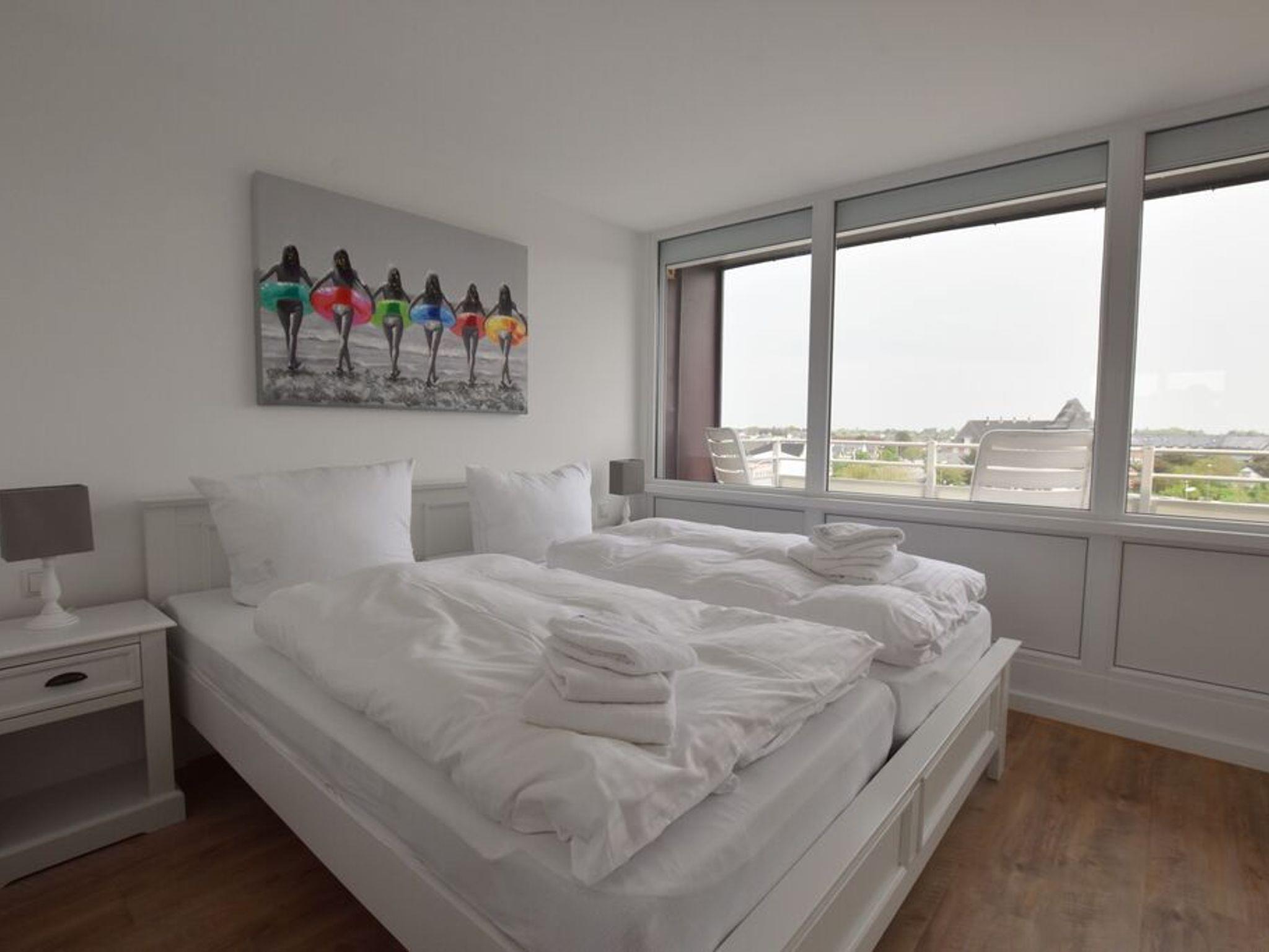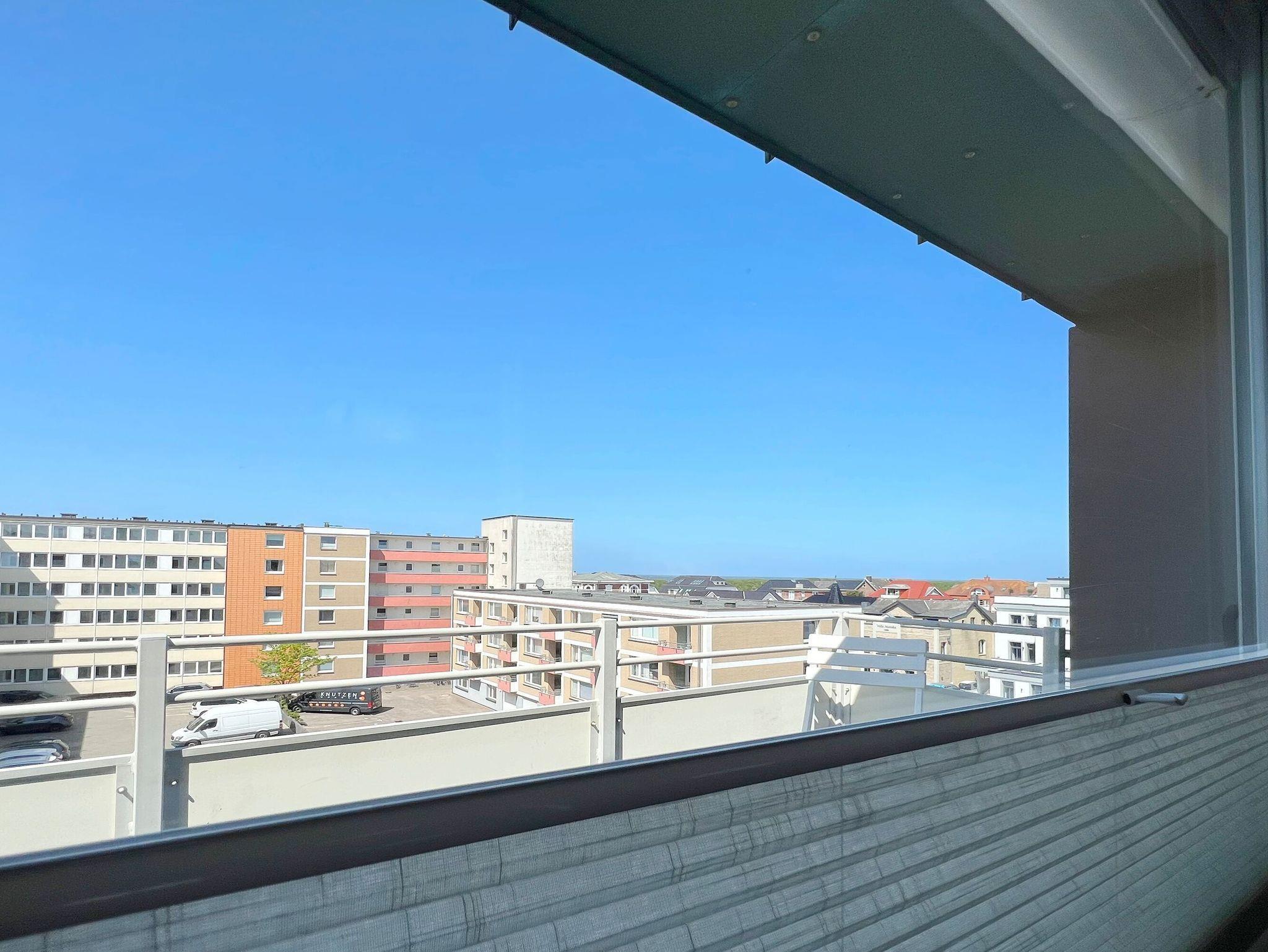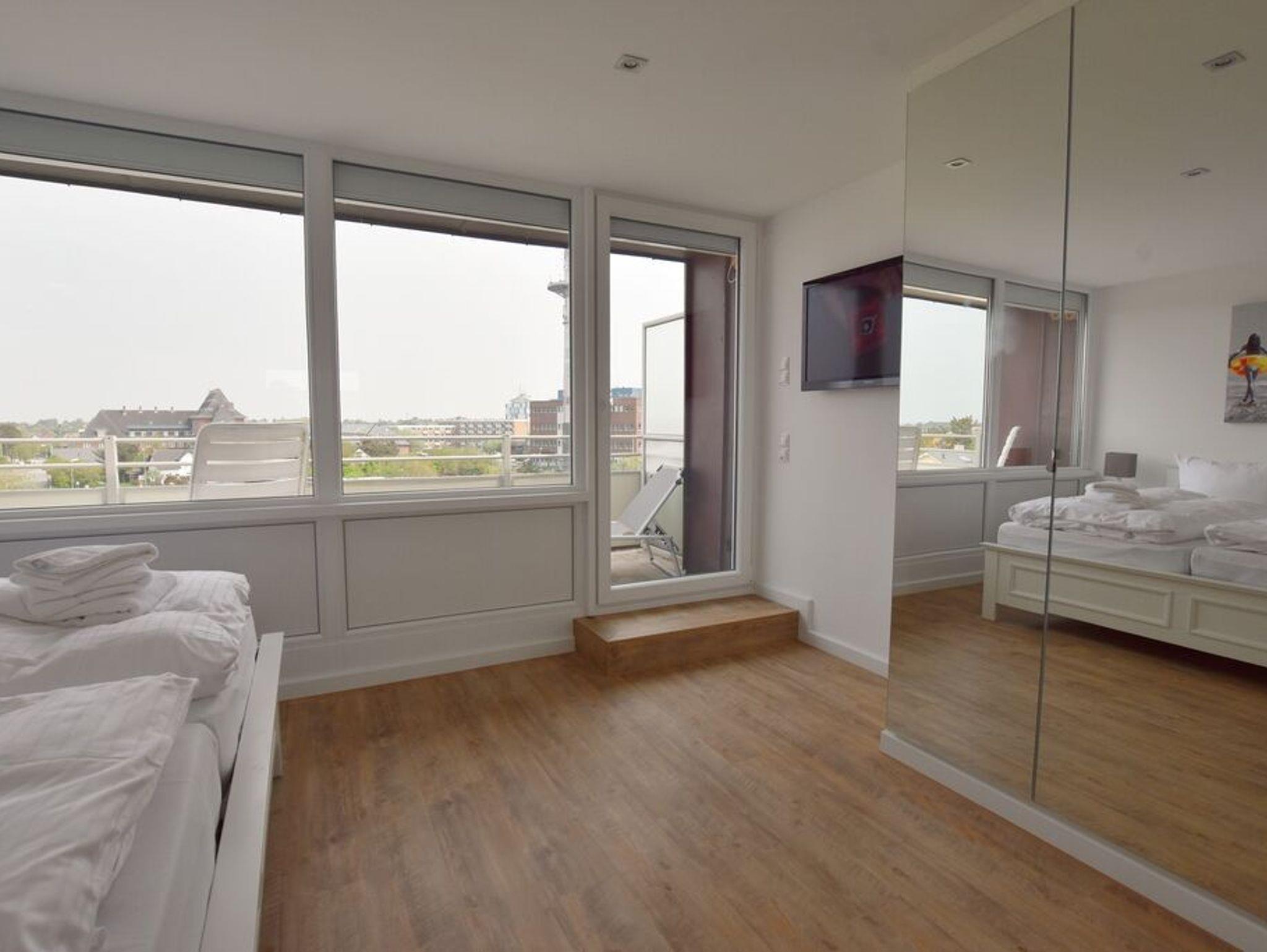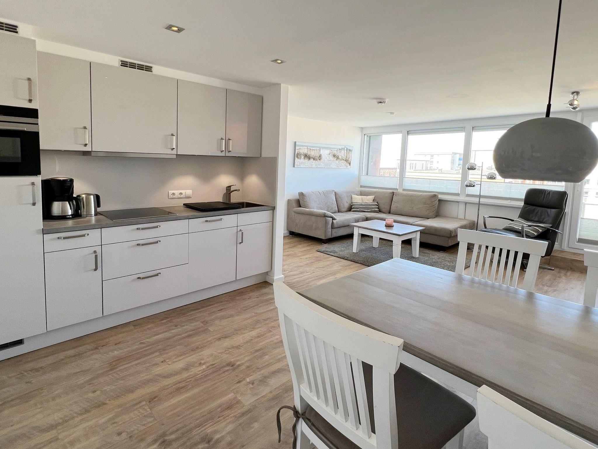 Penthouse-Ferienwohnung im Haus Germania. Modernes Wohnzimmer mit offener Küchezeile, Essecke, Couch zum Relaxen und West-Balkon mit kleinem Meerblick. Schlafzimmer mit Doppelbett und zweitem Balkon nach Osten. Zweites Schlafzimmer mit 2 Einzelbetten, Flur und Duschbad ( mit Oberlicht ) mit WC und Waschbecken. Alle Räume befinden sich auf einer Ebene. Es steht Ihnen ein Fahrstuhl und ein eigener PKW-Stellplatz ( Nr. 35 ) zur Verfügung.