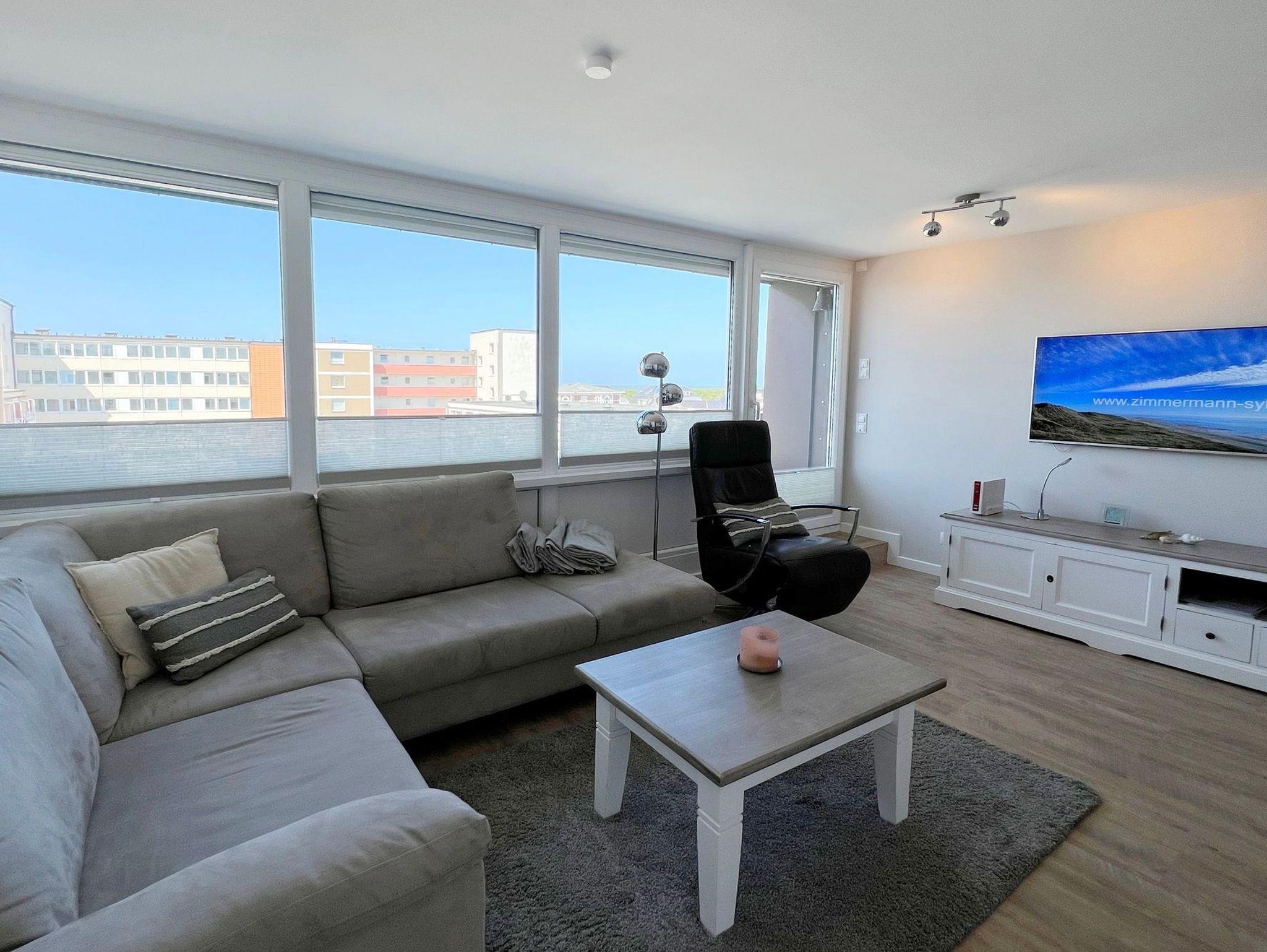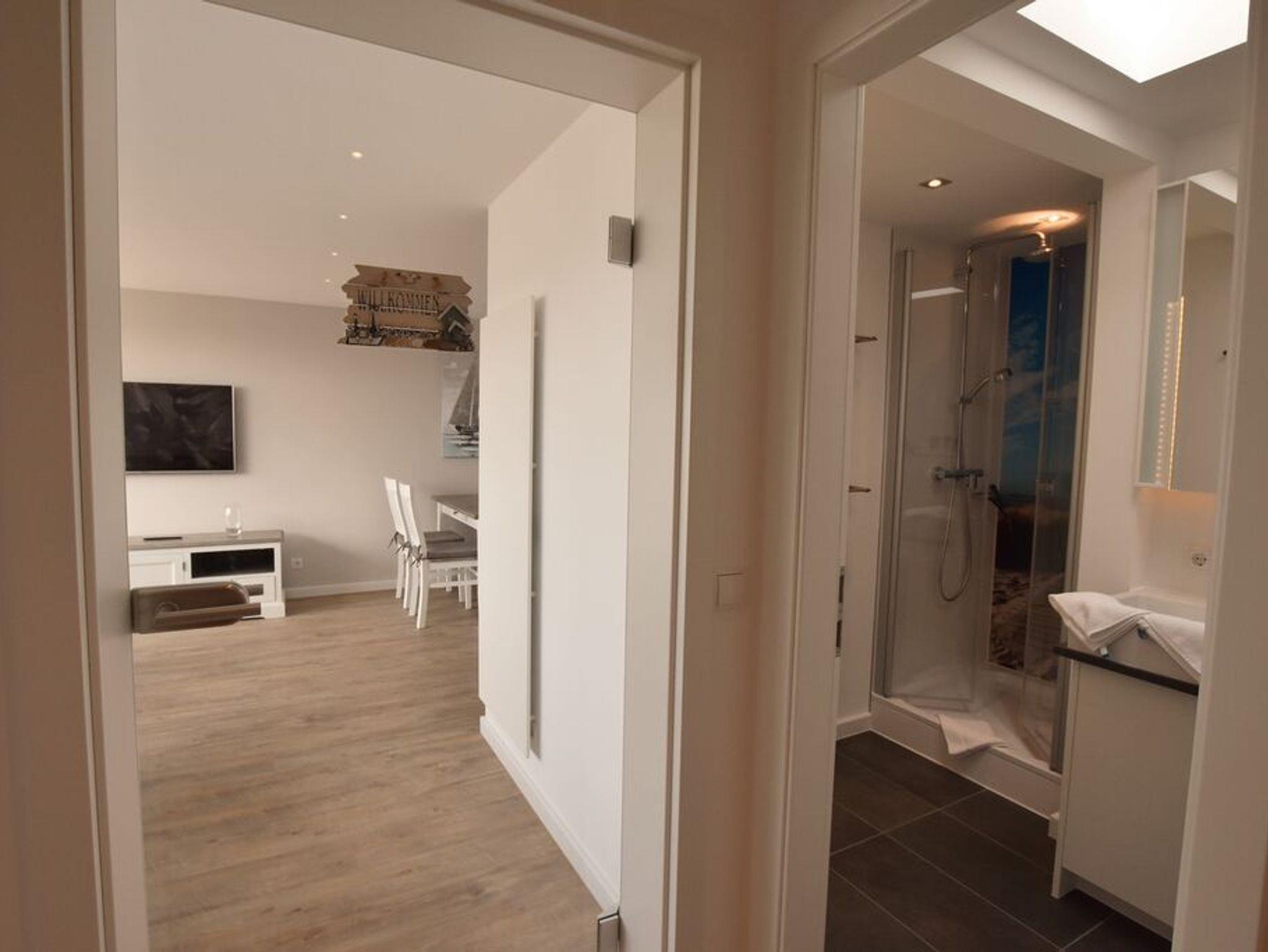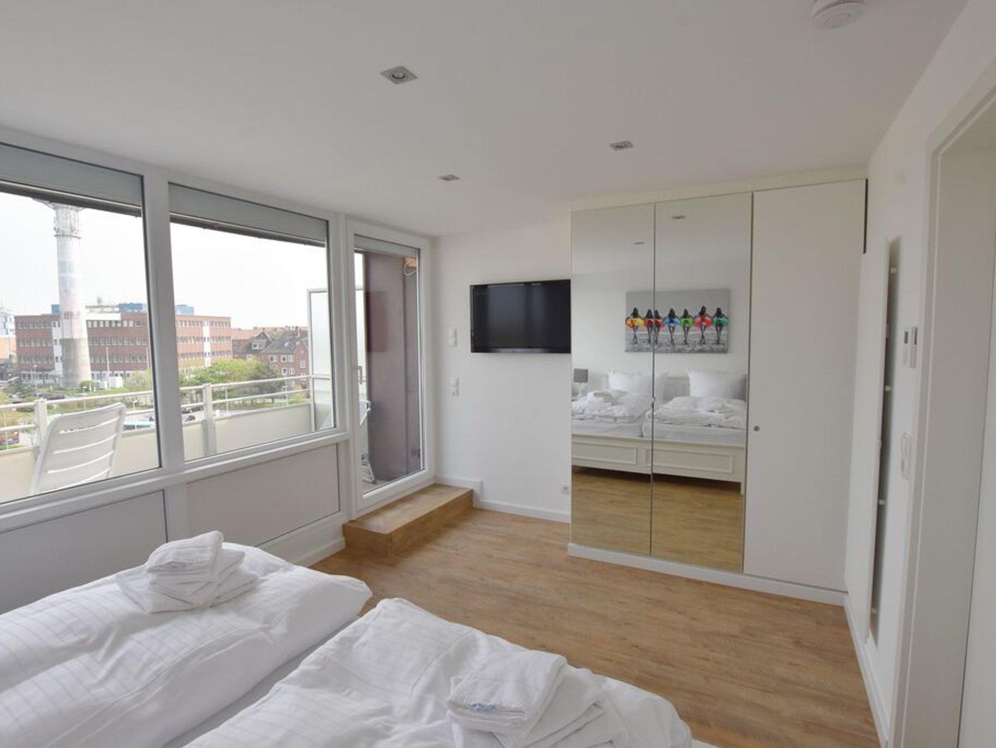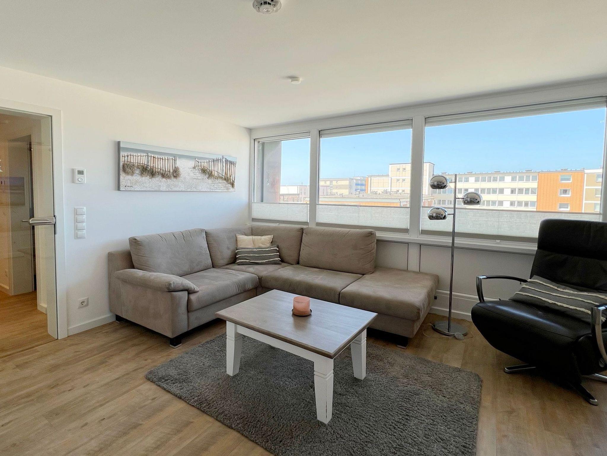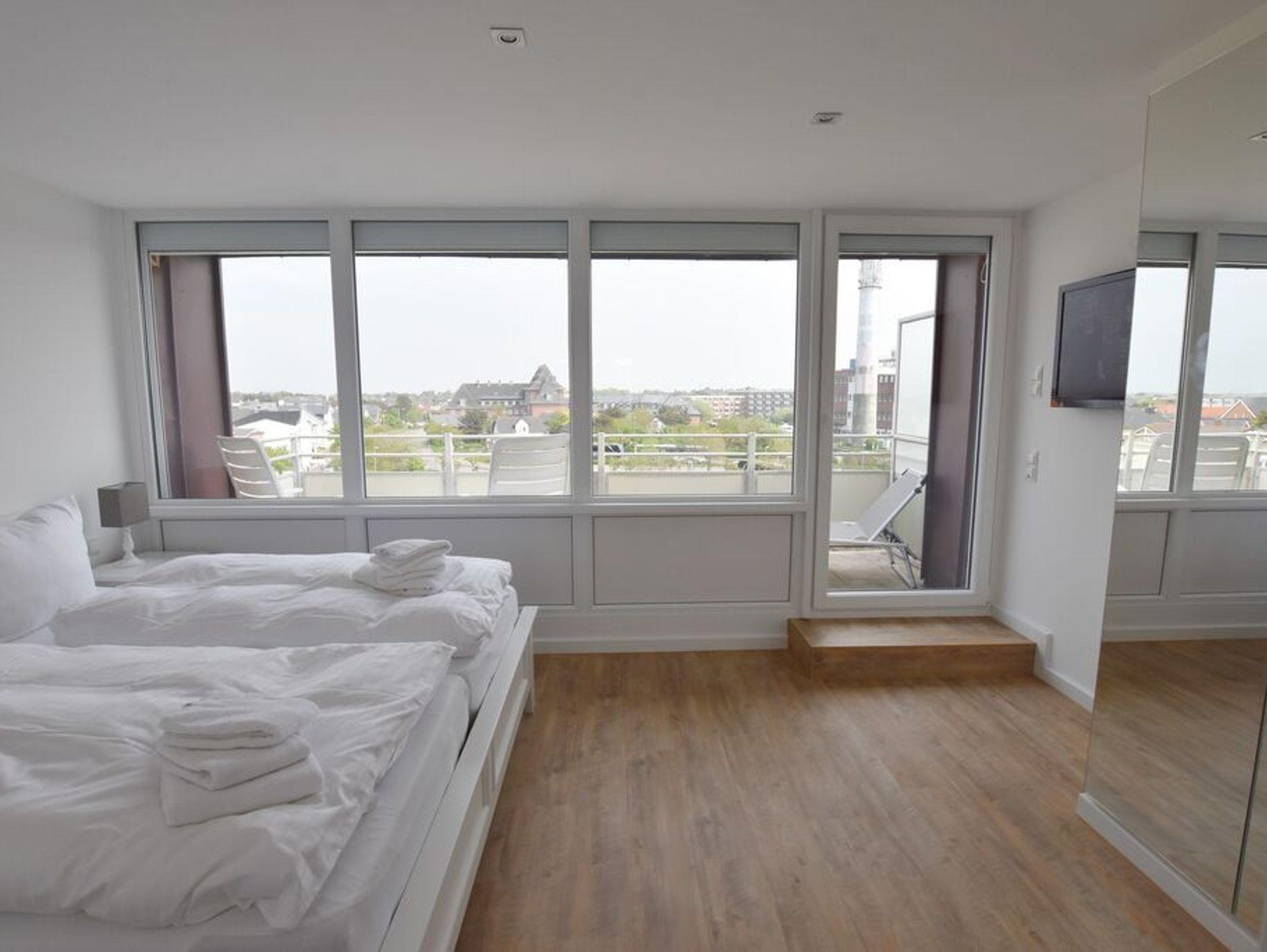 Penthouse-Ferienwohnung im Haus Germania. Modernes Wohnzimmer mit offener Küchezeile, Essecke, Couch zum Relaxen und West-Balkon mit kleinem Meerblick. Schlafzimmer mit Doppelbett und zweitem Balkon nach Osten. Zweites Schlafzimmer mit 2 Einzelbetten, Flur und Duschbad ( mit Oberlicht ) mit WC und Waschbecken. Alle Räume befinden sich auf einer Ebene. Es steht Ihnen ein Fahrstuhl und ein eigener PKW-Stellplatz ( Nr. 35 ) zur Verfügung.