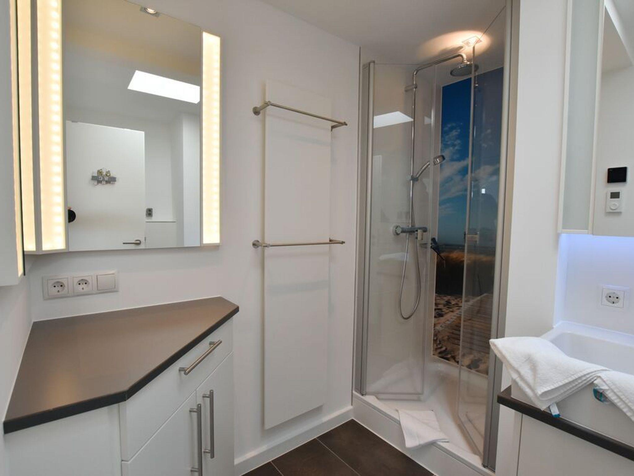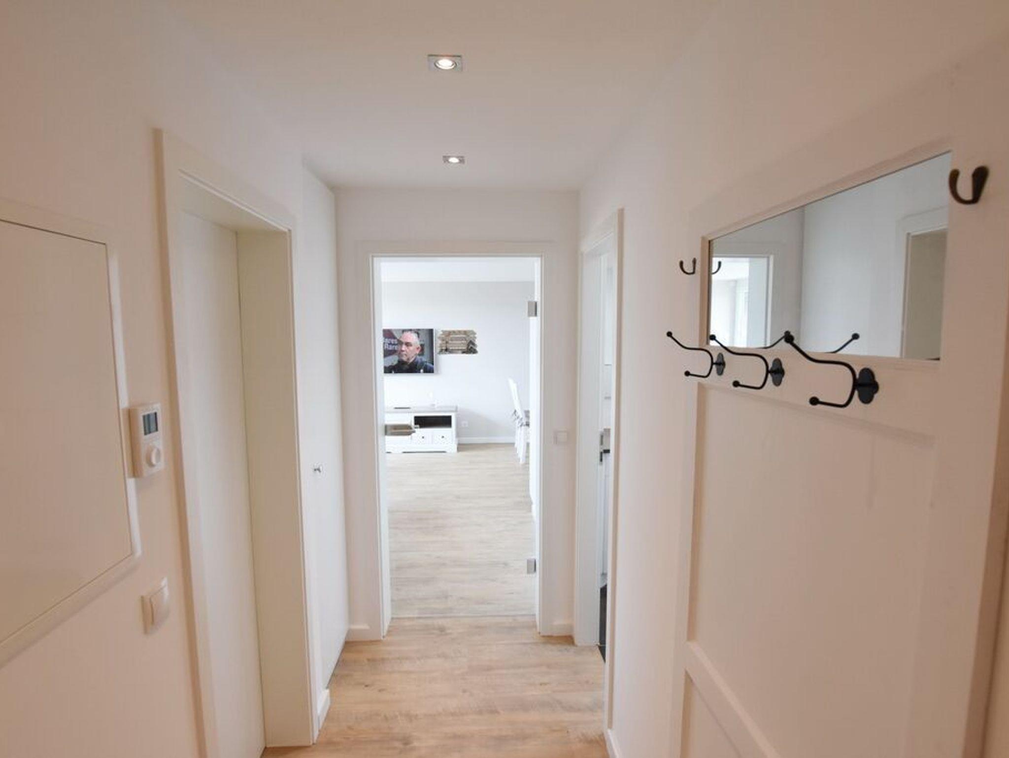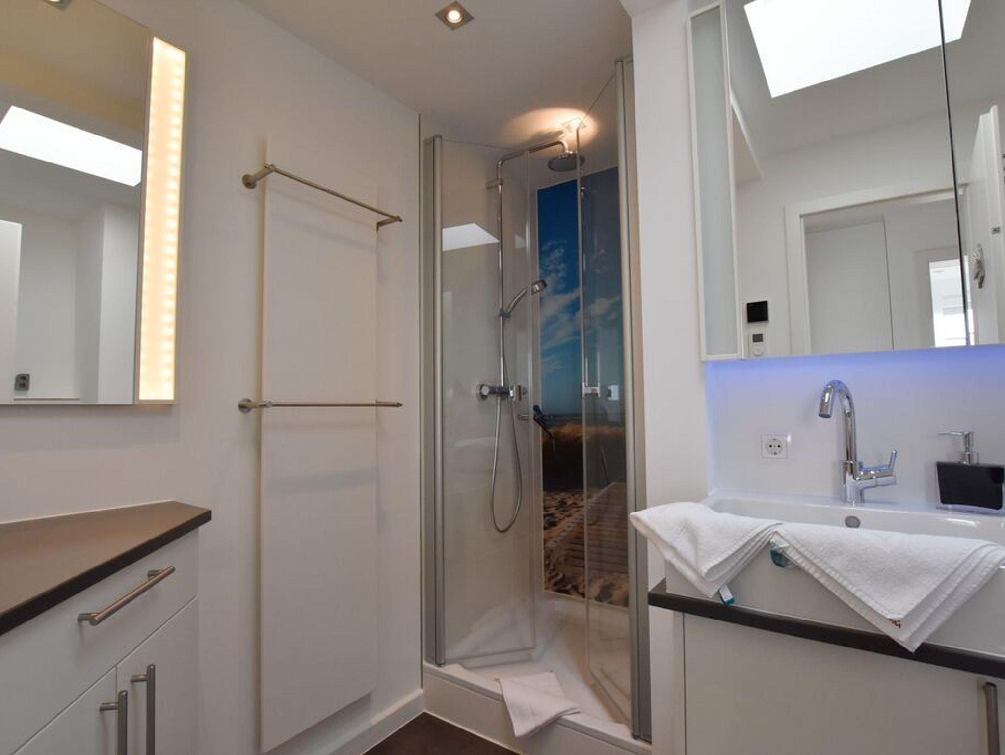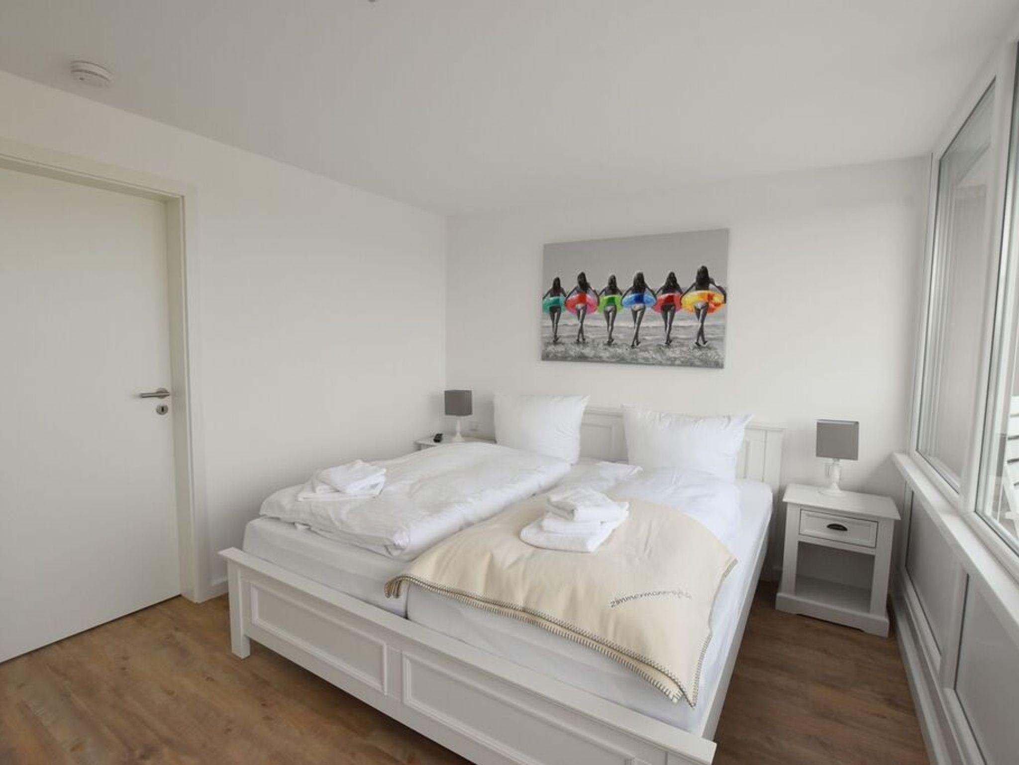 Penthouse-Ferienwohnung im Haus Germania. Modernes Wohnzimmer mit offener Küchezeile, Essecke, Couch zum Relaxen und West-Balkon mit kleinem Meerblick. Schlafzimmer mit Doppelbett und zweitem Balkon nach Osten. Zweites Schlafzimmer mit 2 Einzelbetten, Flur und Duschbad ( mit Oberlicht ) mit WC und Waschbecken. Alle Räume befinden sich auf einer Ebene. Es steht Ihnen ein Fahrstuhl und ein eigener PKW-Stellplatz ( Nr. 35 ) zur Verfügung.