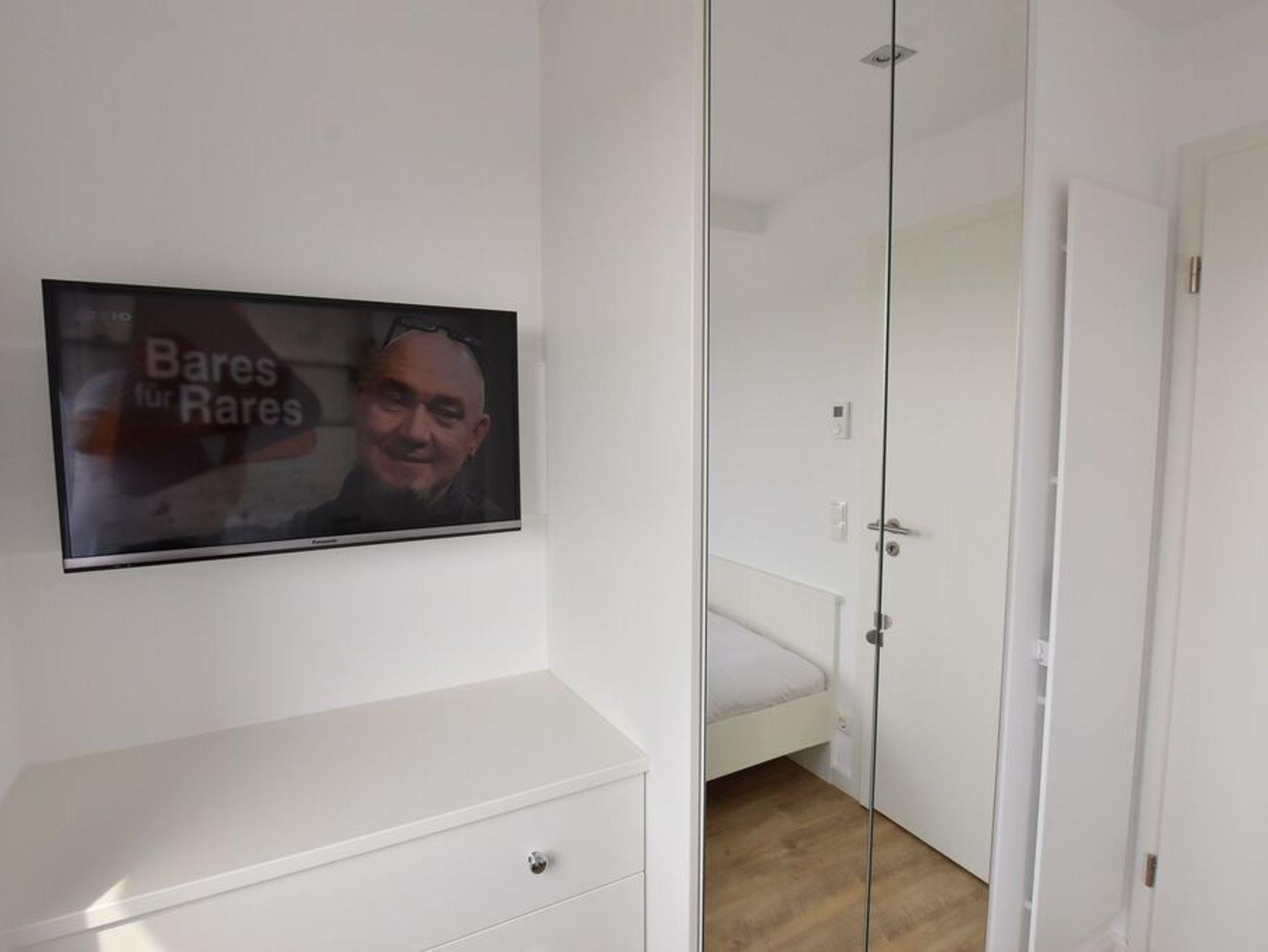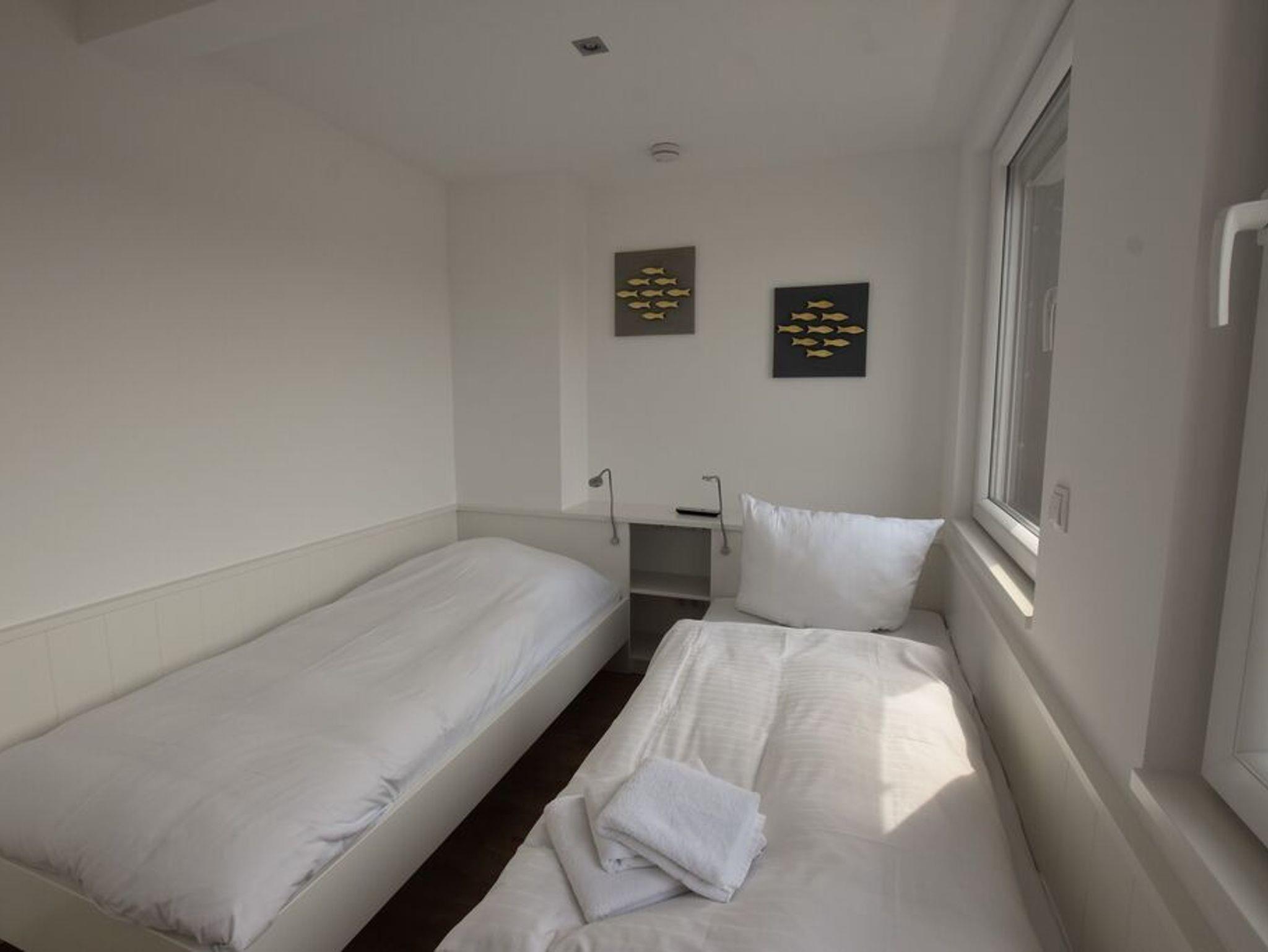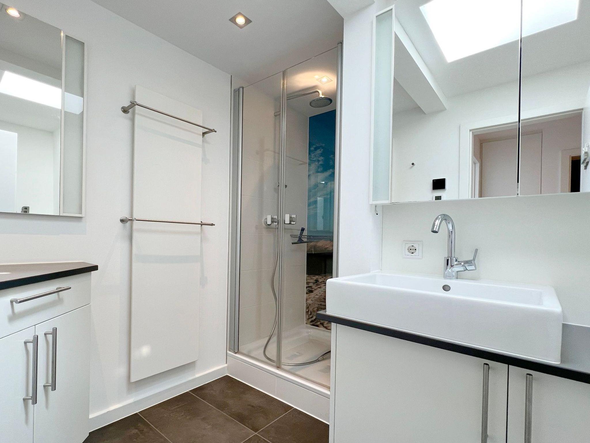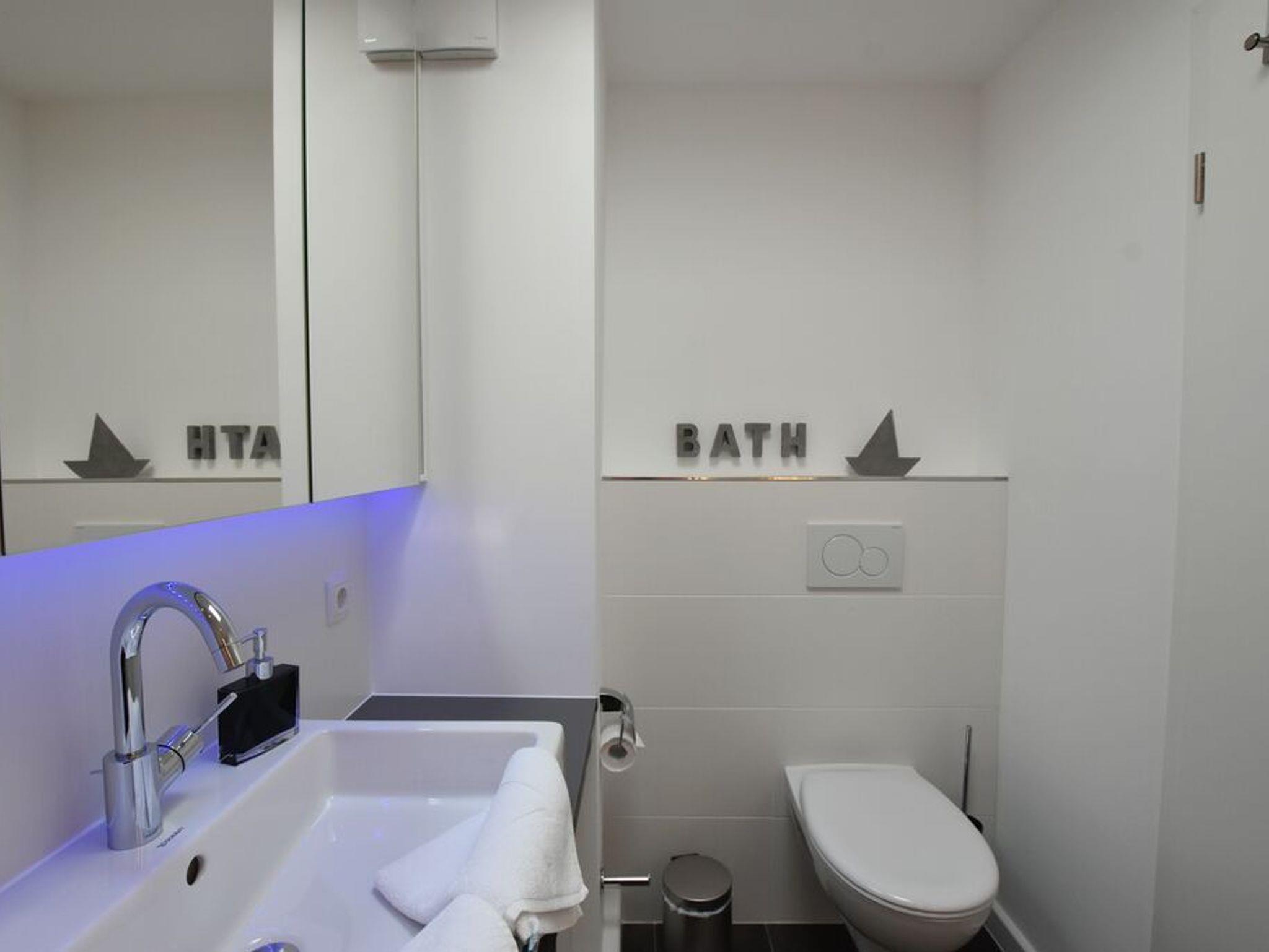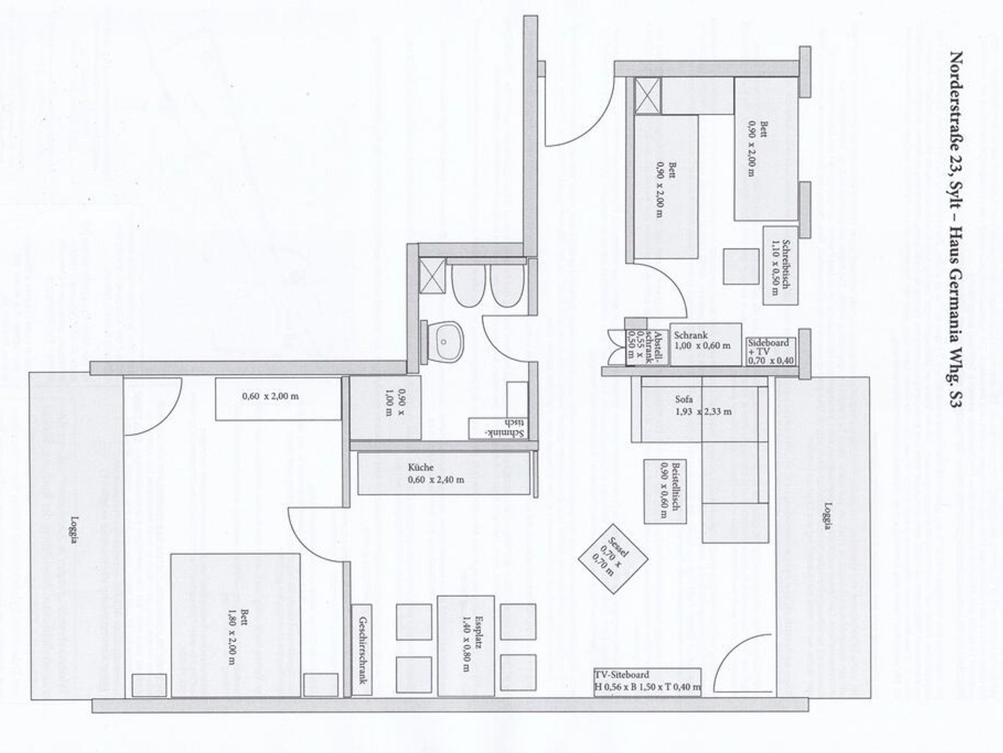 Penthouse-Ferienwohnung im Haus Germania. Modernes Wohnzimmer mit offener Küchezeile, Essecke, Couch zum Relaxen und West-Balkon mit kleinem Meerblick. Schlafzimmer mit Doppelbett und zweitem Balkon nach Osten. Zweites Schlafzimmer mit 2 Einzelbetten, Flur und Duschbad ( mit Oberlicht ) mit WC und Waschbecken. Alle Räume befinden sich auf einer Ebene. Es steht Ihnen ein Fahrstuhl und ein eigener PKW-Stellplatz ( Nr. 35 ) zur Verfügung.
