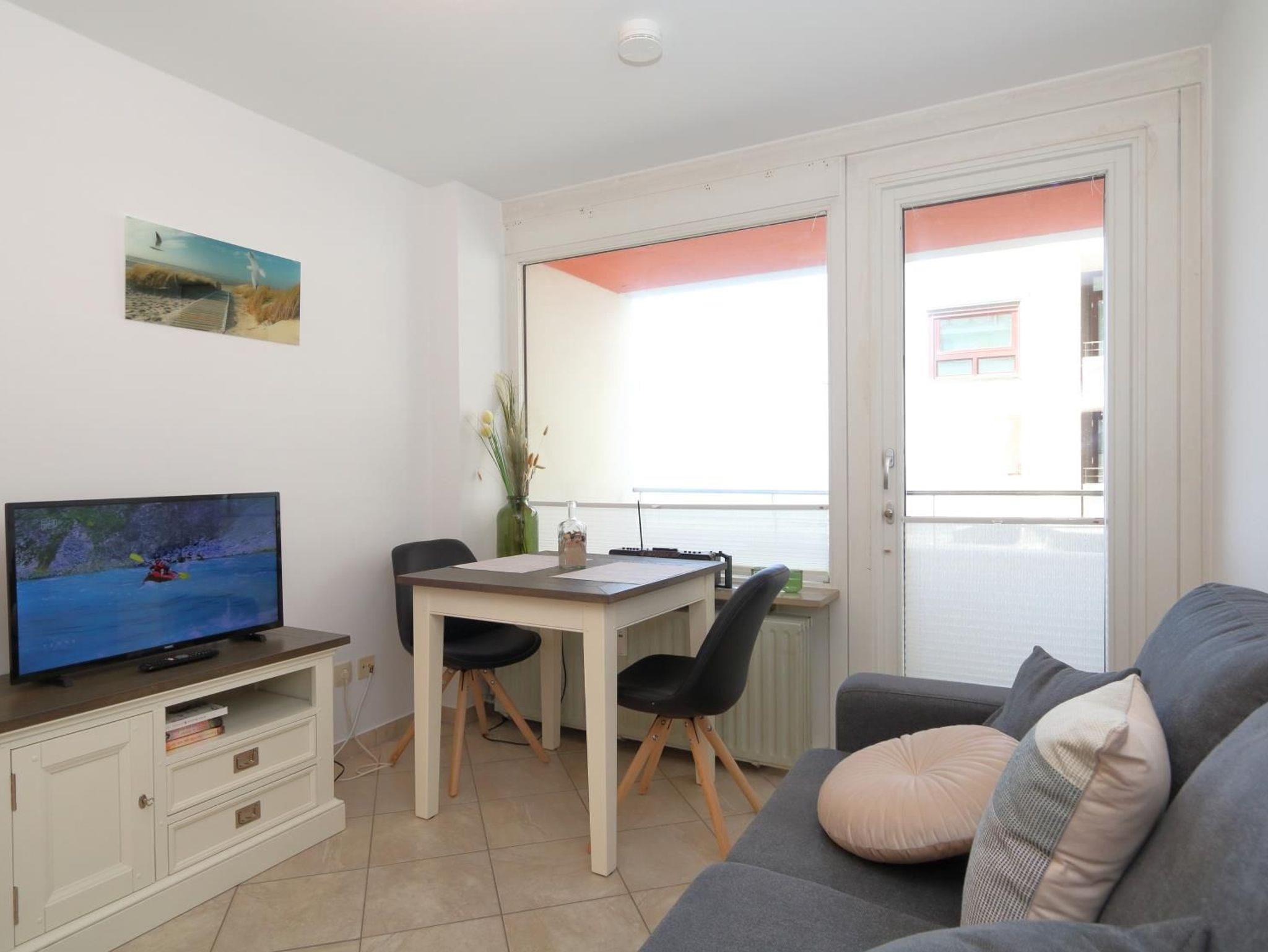 Wohn-/Schlafzimmer mit TV SAT/Kabel, W'Lan, Sofa, Eßtisch sowie Zugang zum Balkon.