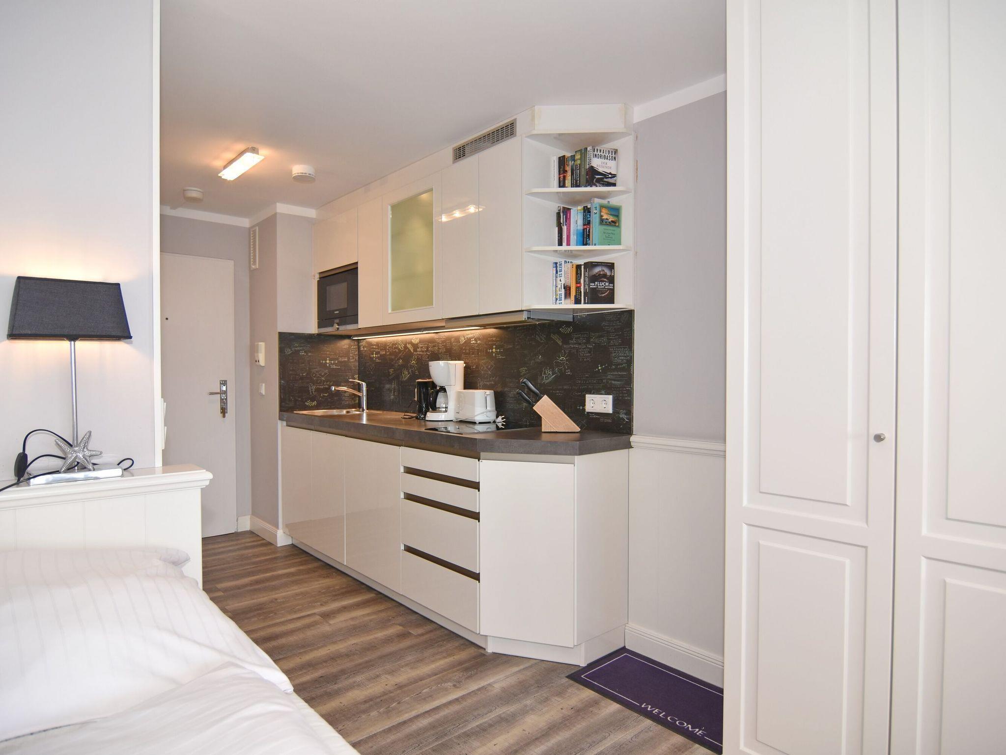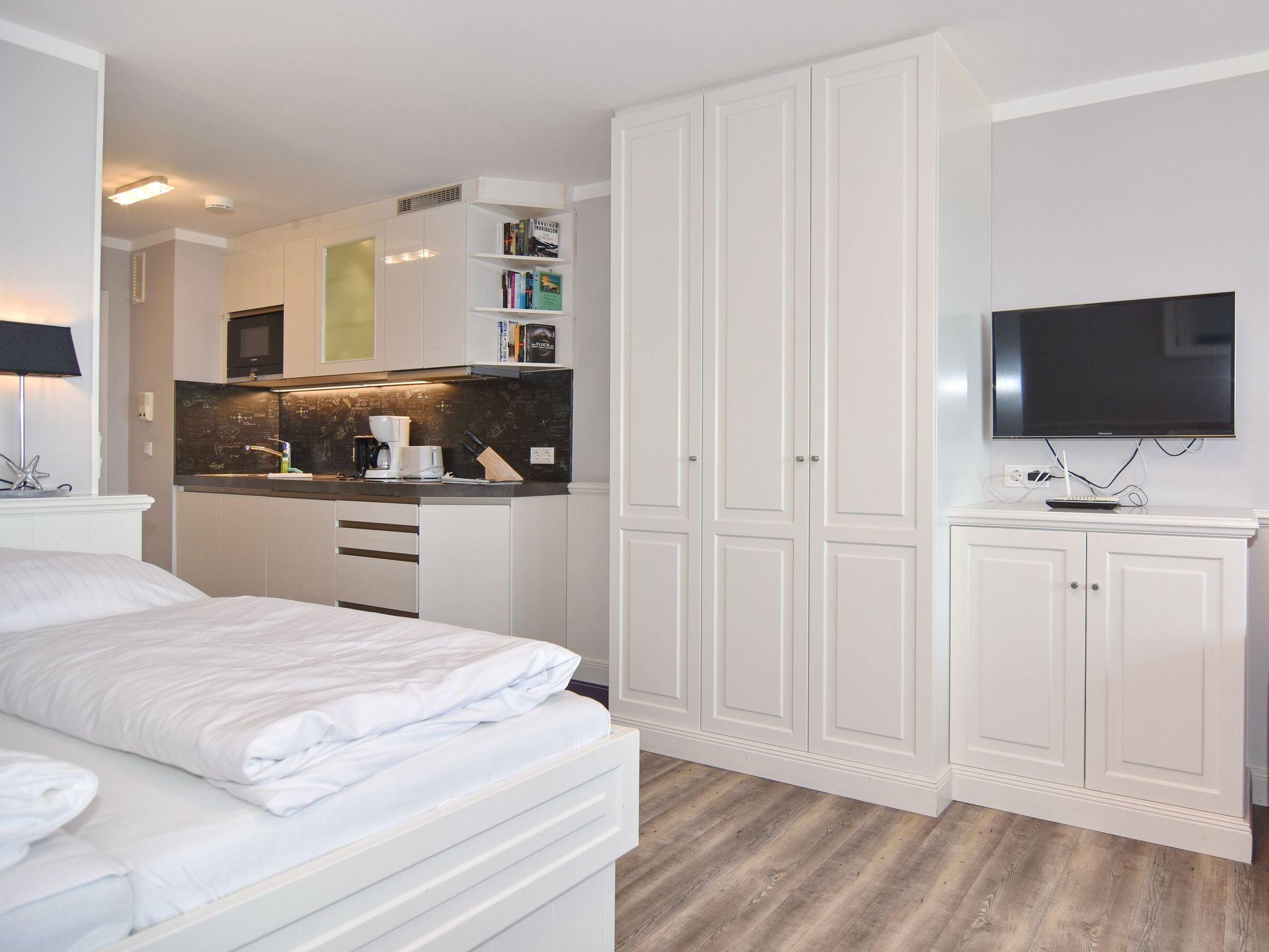Wunderschöne 1-Zimmer-Ferienwohnung zur Seeseite im Haus Metropol, 6.OG, 34m². Die Nichtraucher-Wohnung verfügt über einen Wohn-/Schlafraum mit Doppelbett (1,60 x 2,0 m), Eßplatz am Fenster und 2-Sitzer-Couch, Flat-TV, Radio, W-Lan (ohne Gewähr), offene Küchenzeile im Flurbereich mit Geschirrspüler und Mikrowelle, Duschbad/WC. Geniessen Sie den atemberaubenden Meerblick vom möblierten Westbalkon. Tierhaltung ist nicht gestattet. Bettwäsche und Handtücher sind zur Anreise aufgezogen. Ein PKW-Stellplatz kann kostenpflichtig zugebucht werden.