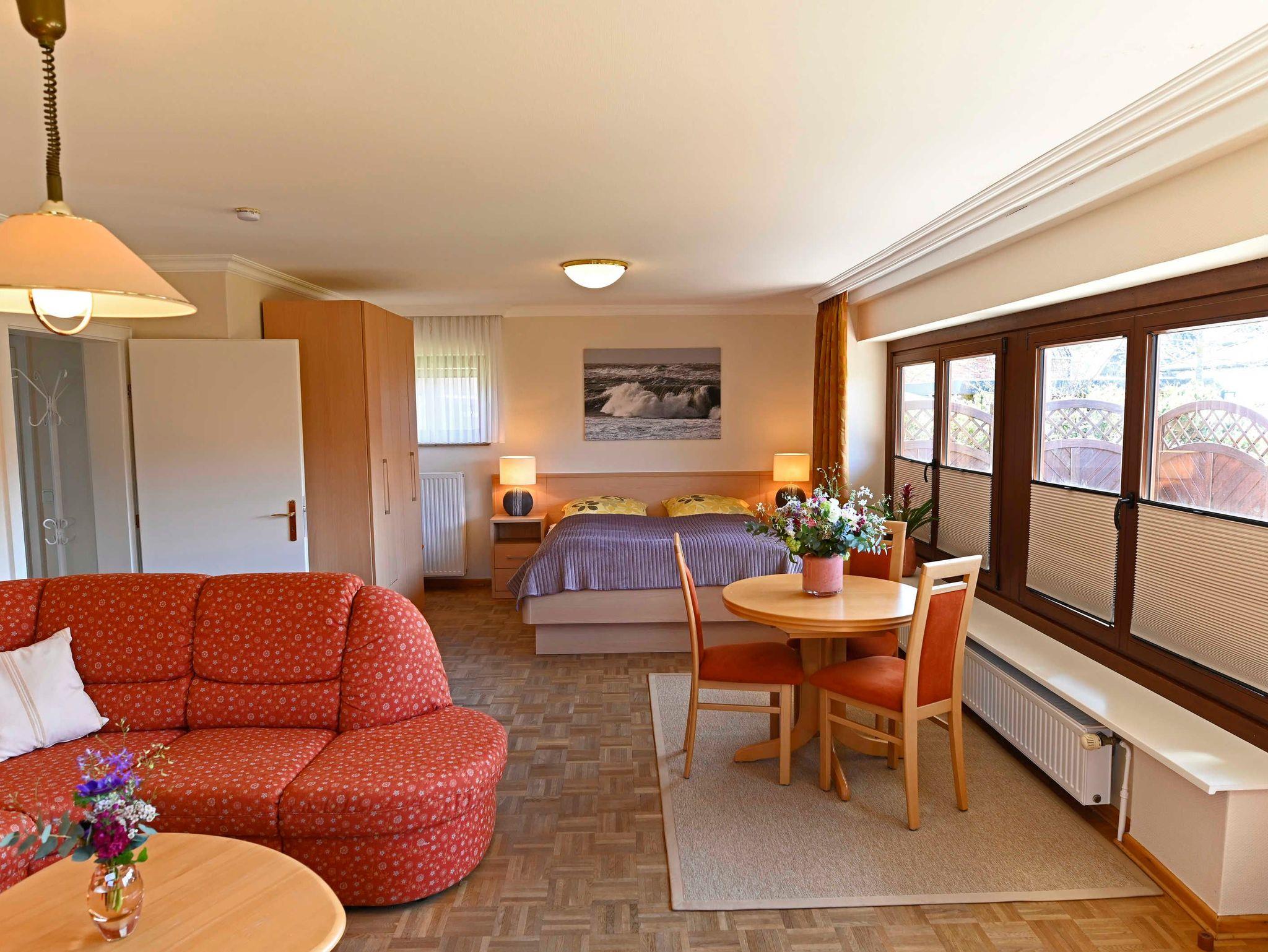 Ein schöner Wohn/ Schlafraum mit Sitzgarnitur, Flachbild-TV, Essecke und Doppelbett ist der Mittelpunkt der Wohnung.