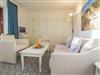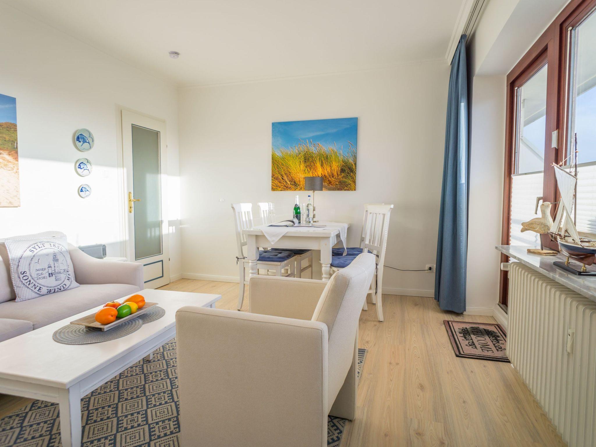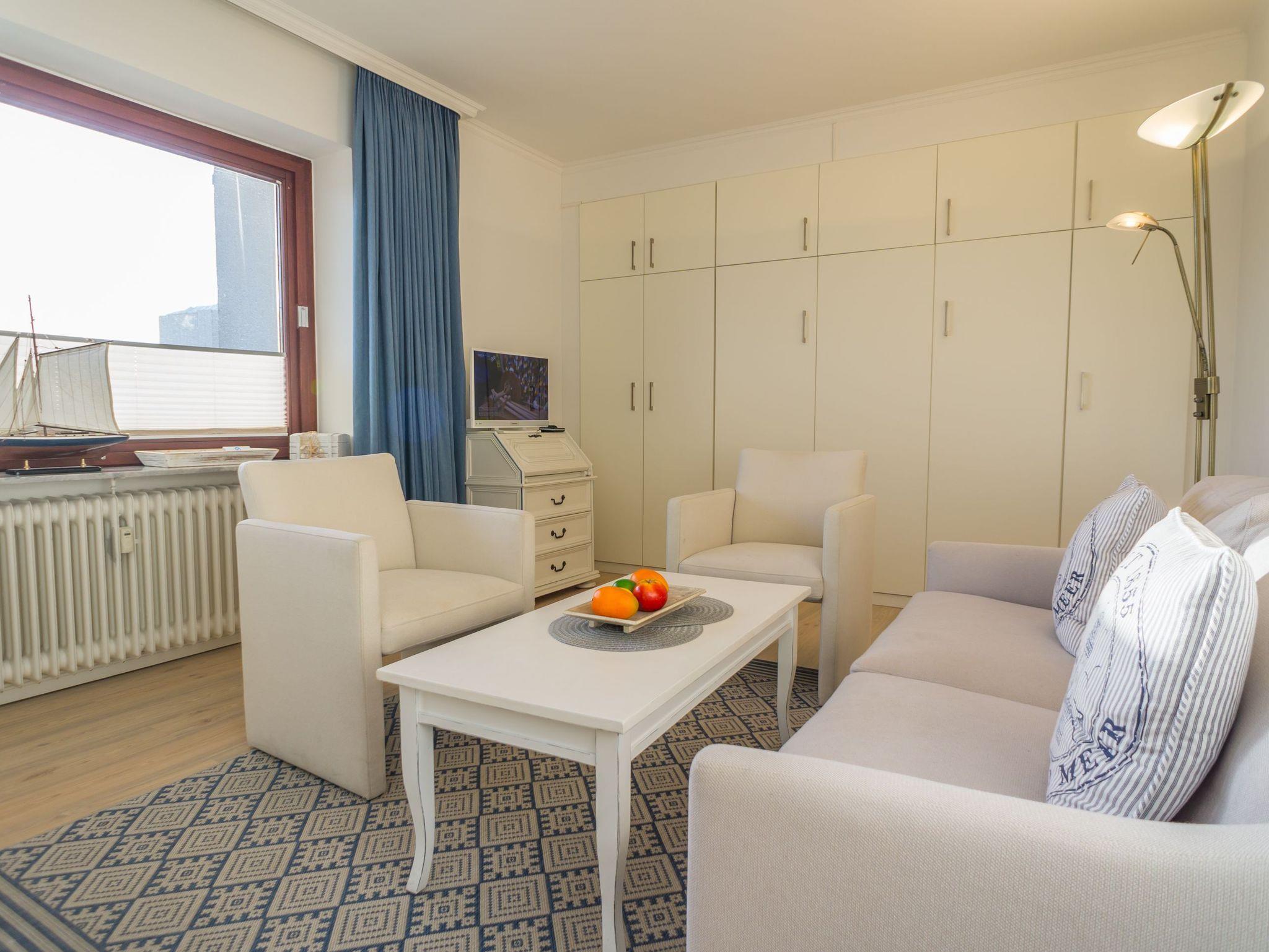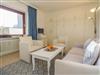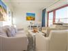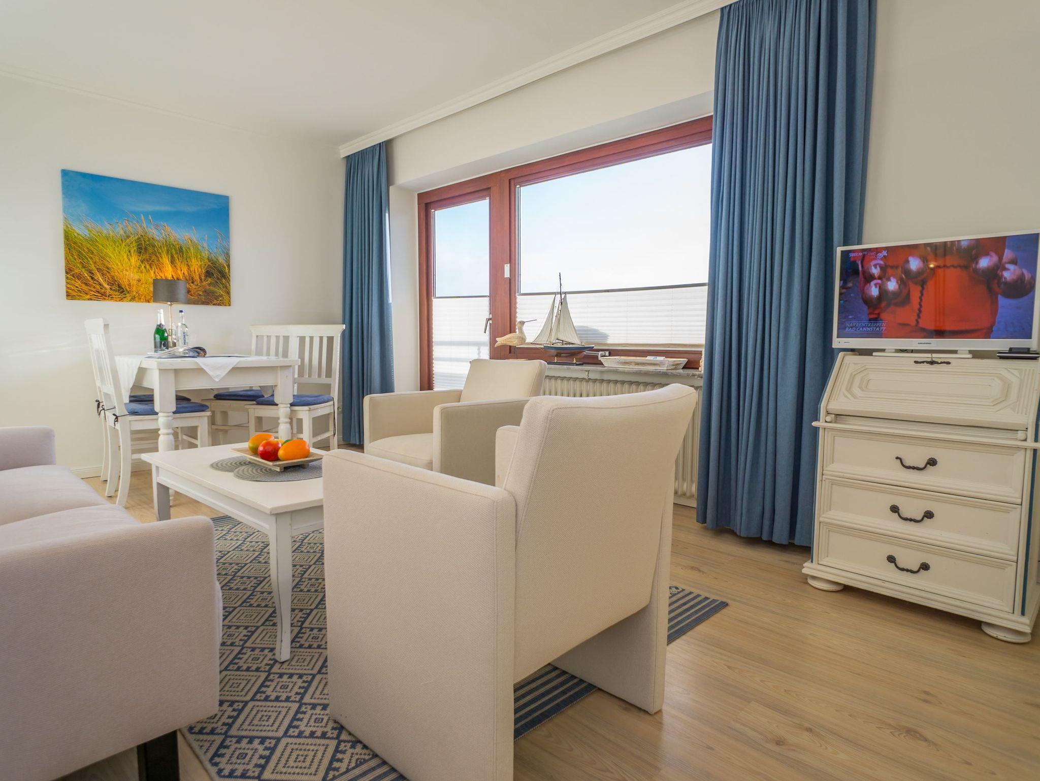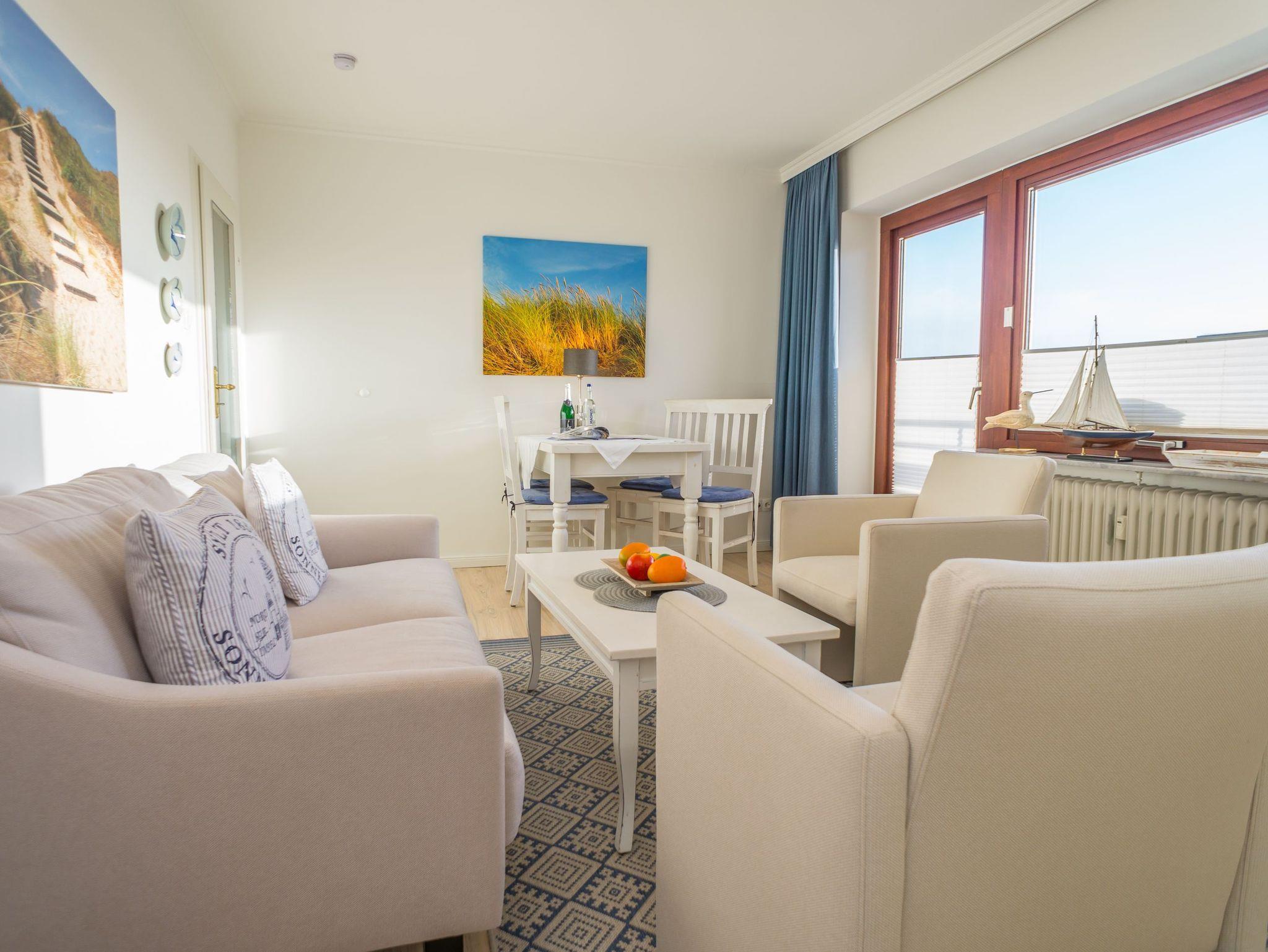 Das gut ausgestattete Wohnzimmer mit Austritt zur Südloggia hat eine bequeme 2-Sitzer-Couch mit Sessel, mit Schrankbetten, einen separaten Essplatz, einen Flatscreen-TV, Radio und Telefon.