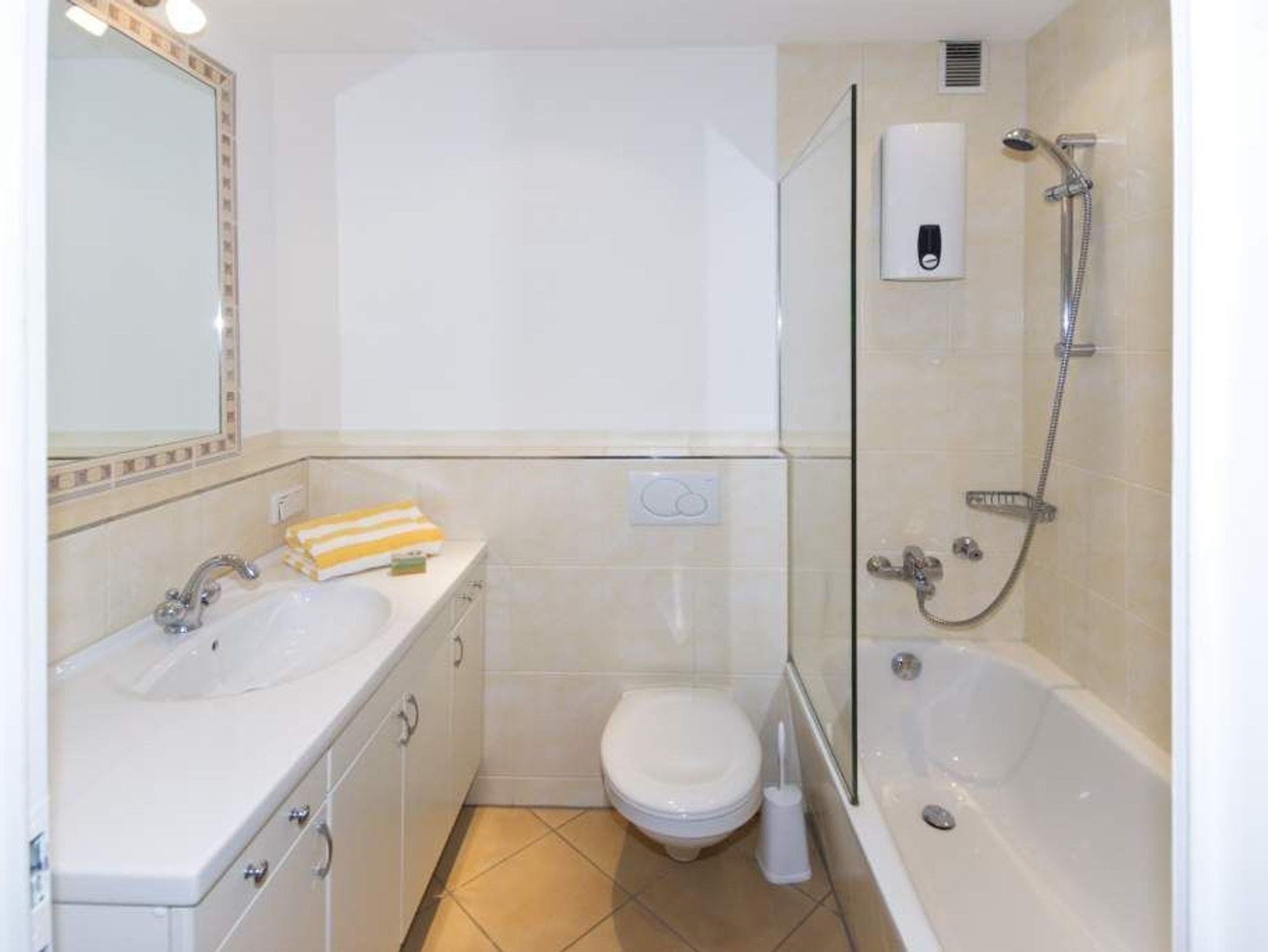 Das Badezimmer/WC besteht aus Badewanne mit Duschwand, Waschtisch und einen Handtuchtrockner.