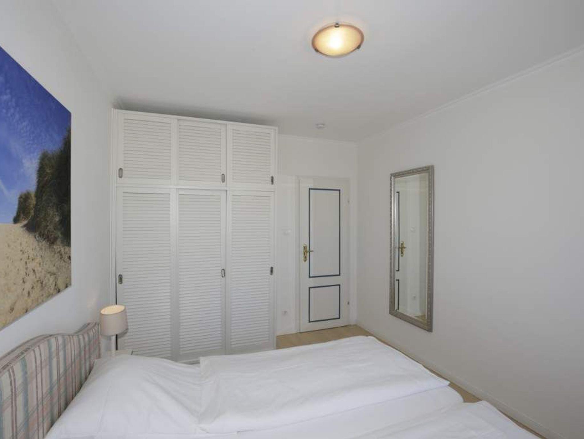 Das in Westlage ausgerichtete Schlafzimmer mit Blick Richtung Nordsee hat ein Doppelbett, einen Fernseher, Nachttische und einen Kleiderschrank.