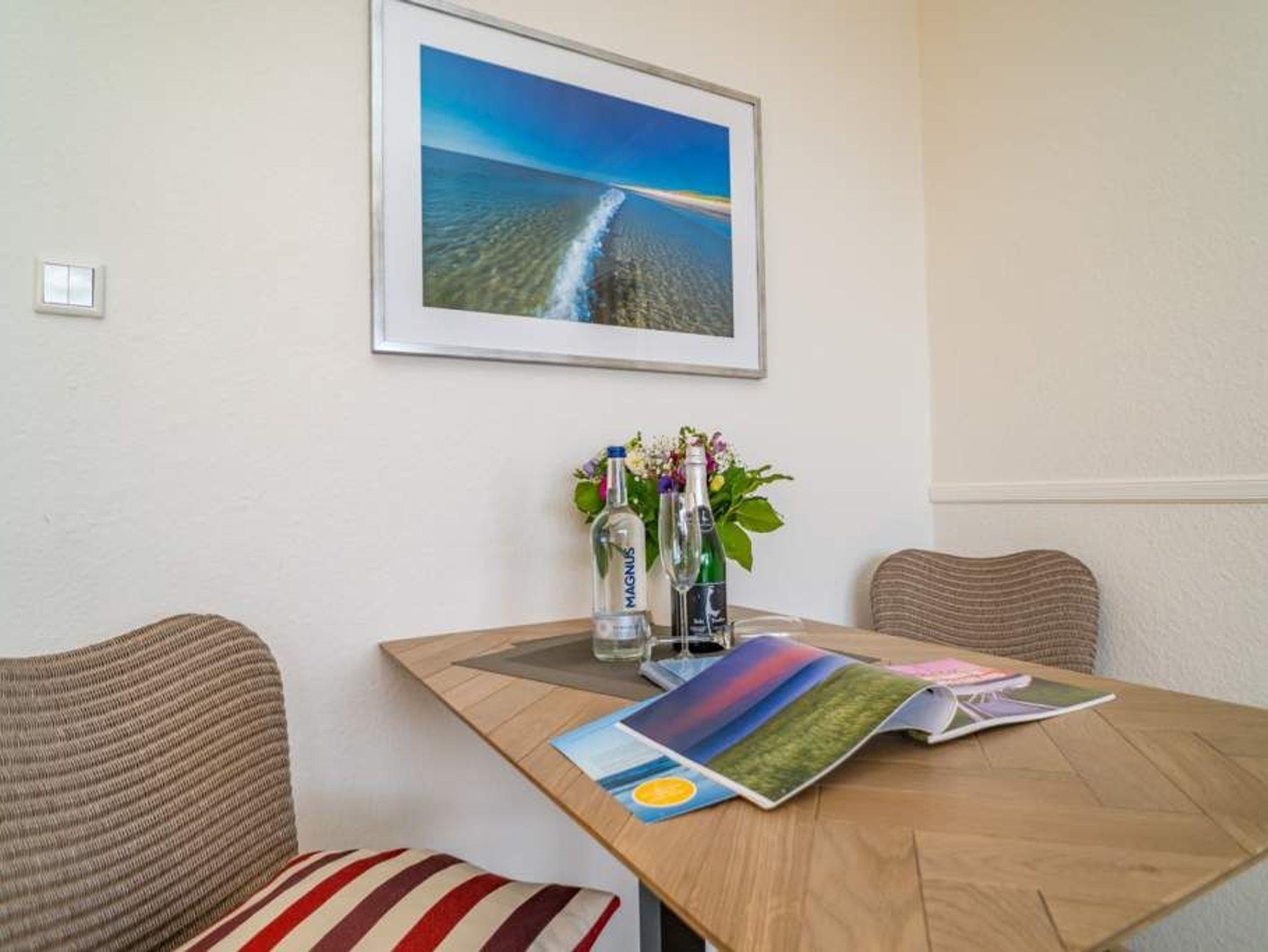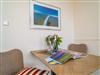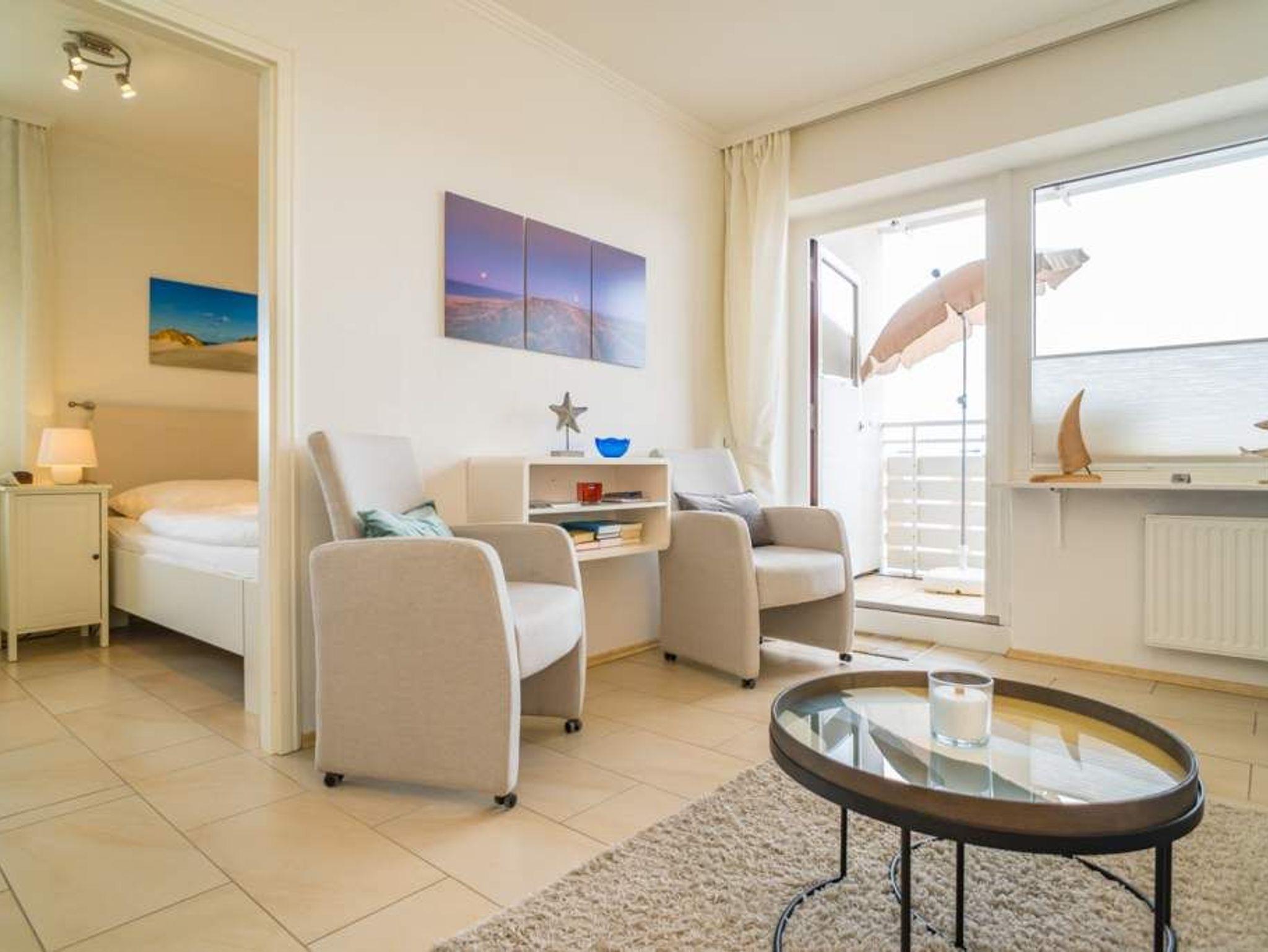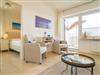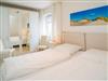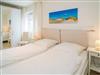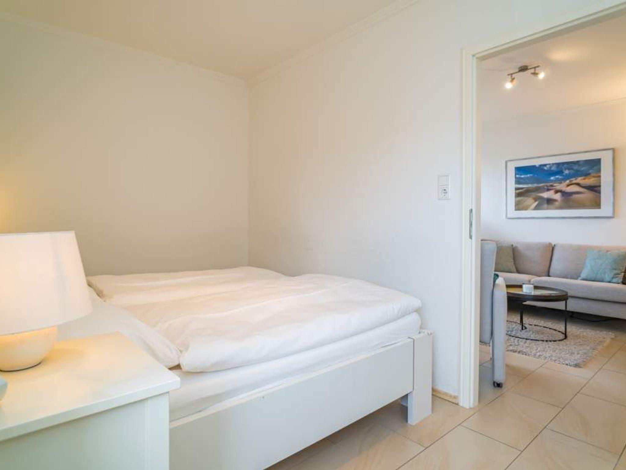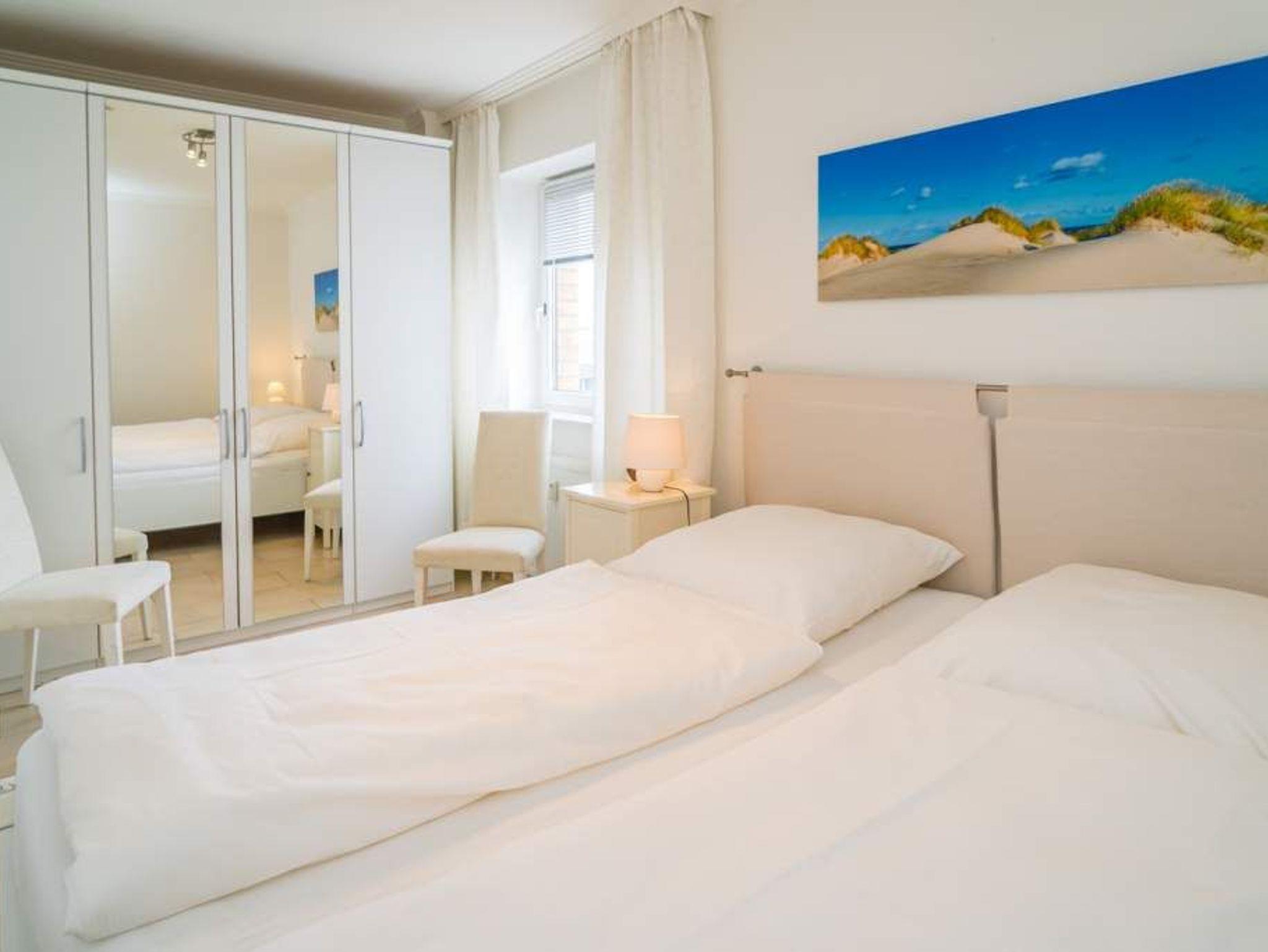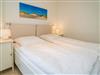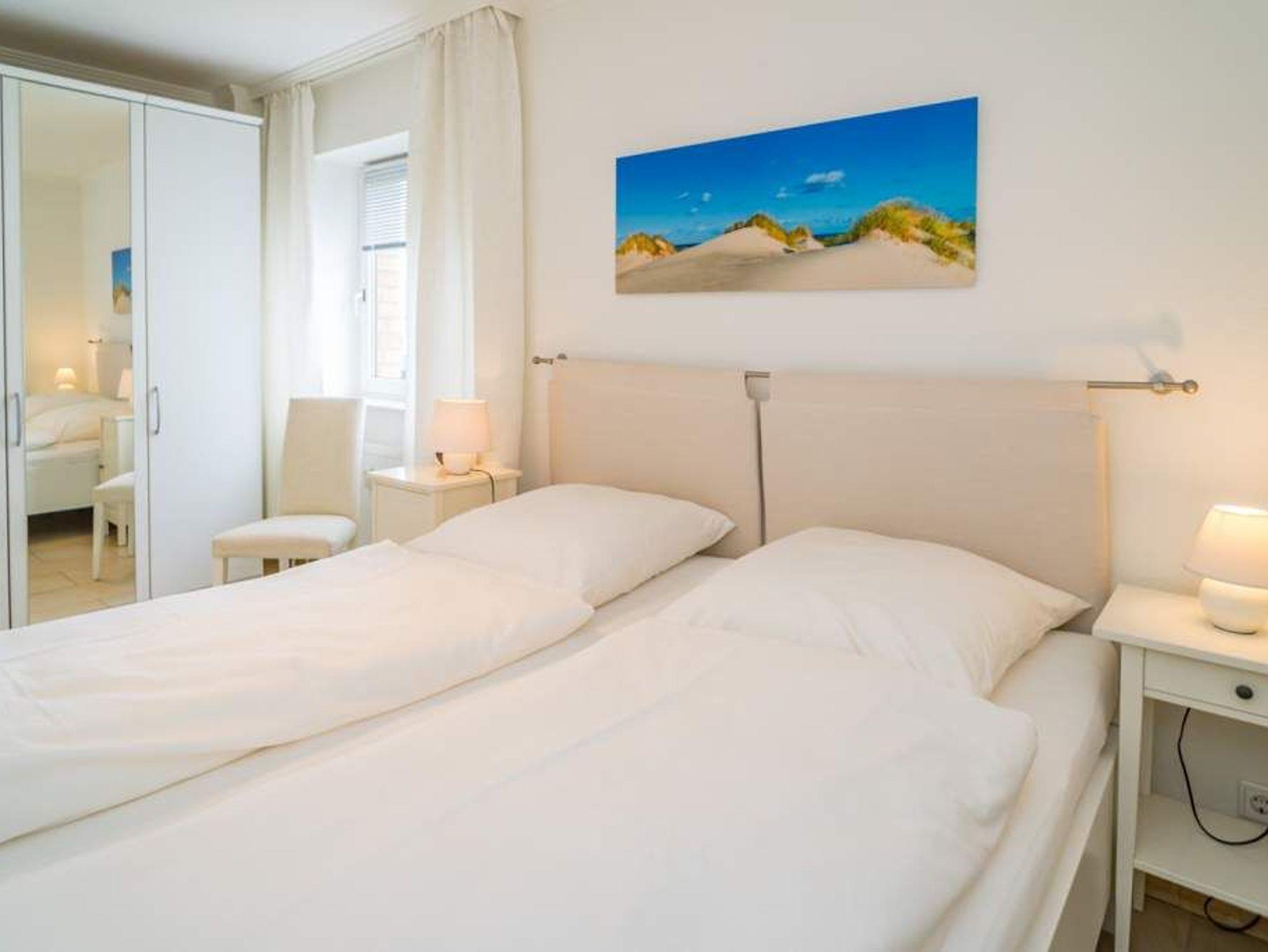 Das separate Schlafzimmer mit kleinem Meerblick nach Nordwesten bietet ein bequemes Doppelbett (Liegefläche 1,80 x 2,00 mit 2 Einzelmatratzen, Einstieg nur von einer Seite aus möglich) für guten Schlafkomfort.