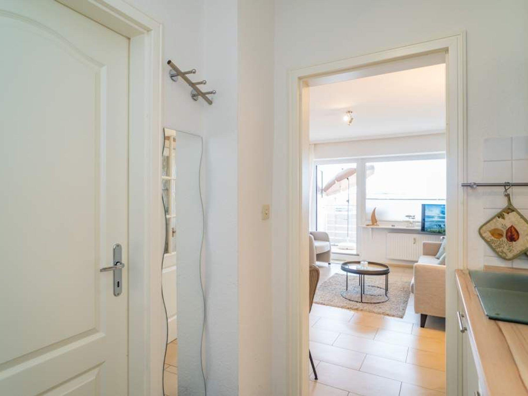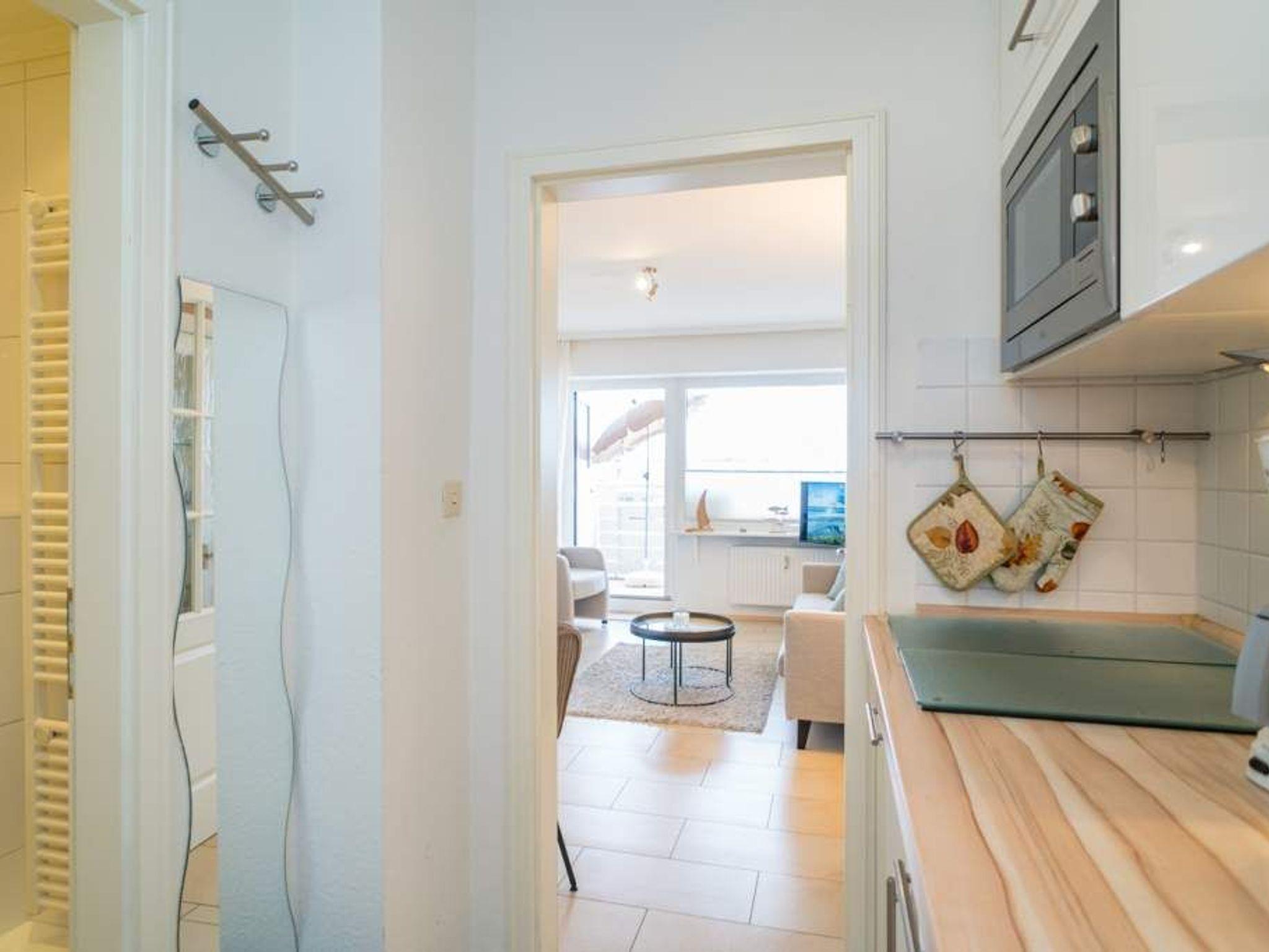 Vom Vorflur mit neuer Einbau-Küchenzeile gelangt man in das Wohnzimmer (mit Austritt zur Loggia) und in das neue Duschbad/WC.