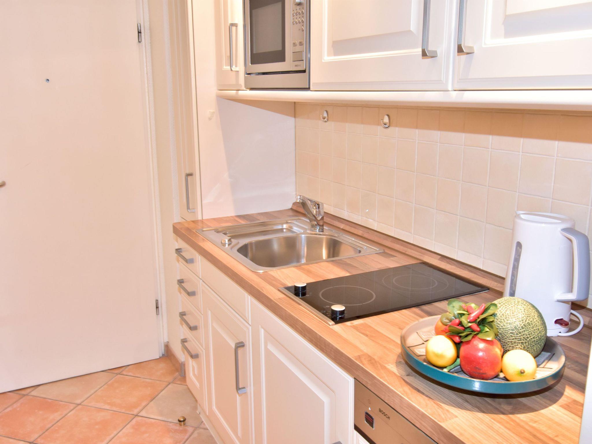 Die Küchenzeile hat einen Geschirrspüler, ein Cerankochfeld, eine Mikrowelle und einen Kühlschrank mit 3*-Gefrierfach. Kaffeemaschine, Wasserkocher und Toaster gehören zur Grundausstattung.