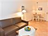 Der Wohn-/Schlafraum besteht aus einem Sofa, einem Essplatz, Doppelschrankbetten, Kabel-Flachbild-TV.