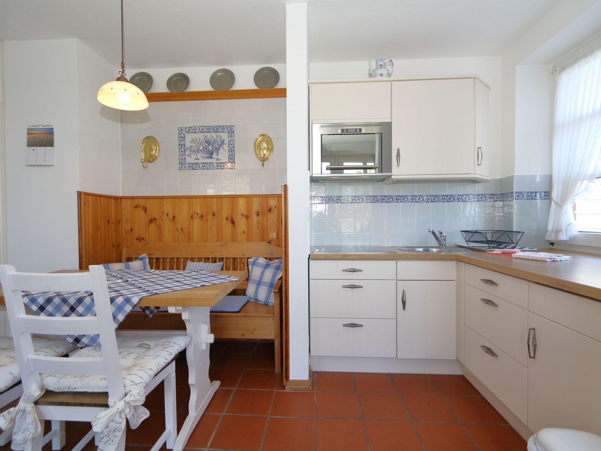 Die niedliche und gut aufgeteilte Ferienwohnung verfügt über einen großzügigen Wohn-und Essbereich, eine Küche und über ein schönes Badezimmer mit einer modernen Dusche (Föhn vorhanden) und einem Velux-Fenster. Es befindet sich unter der Treppe, die nach oben ins Schlafzimmer führt, eine Abstellkammer. Ein Balkon nach Osten ist ebenfalls vorhanden.