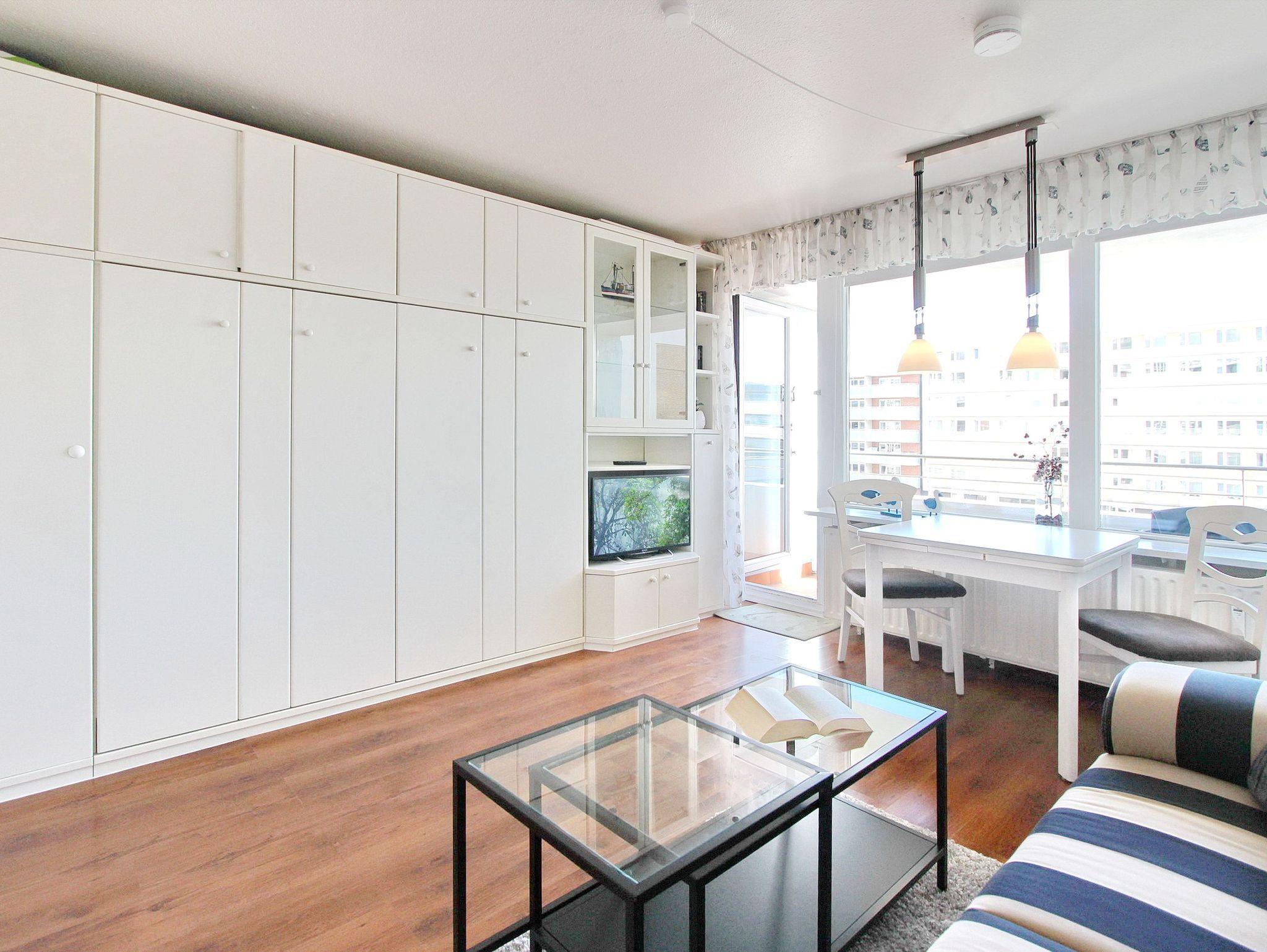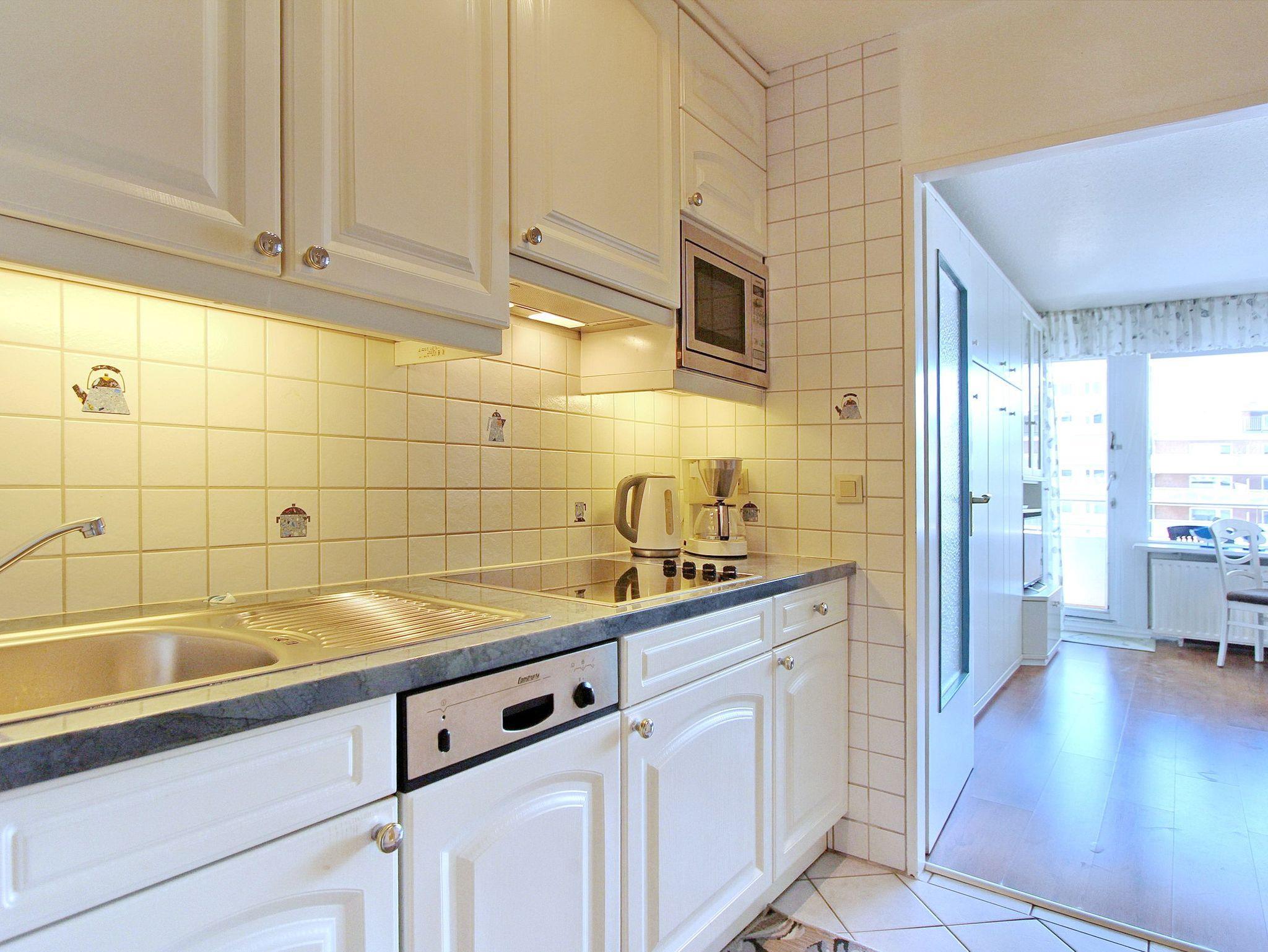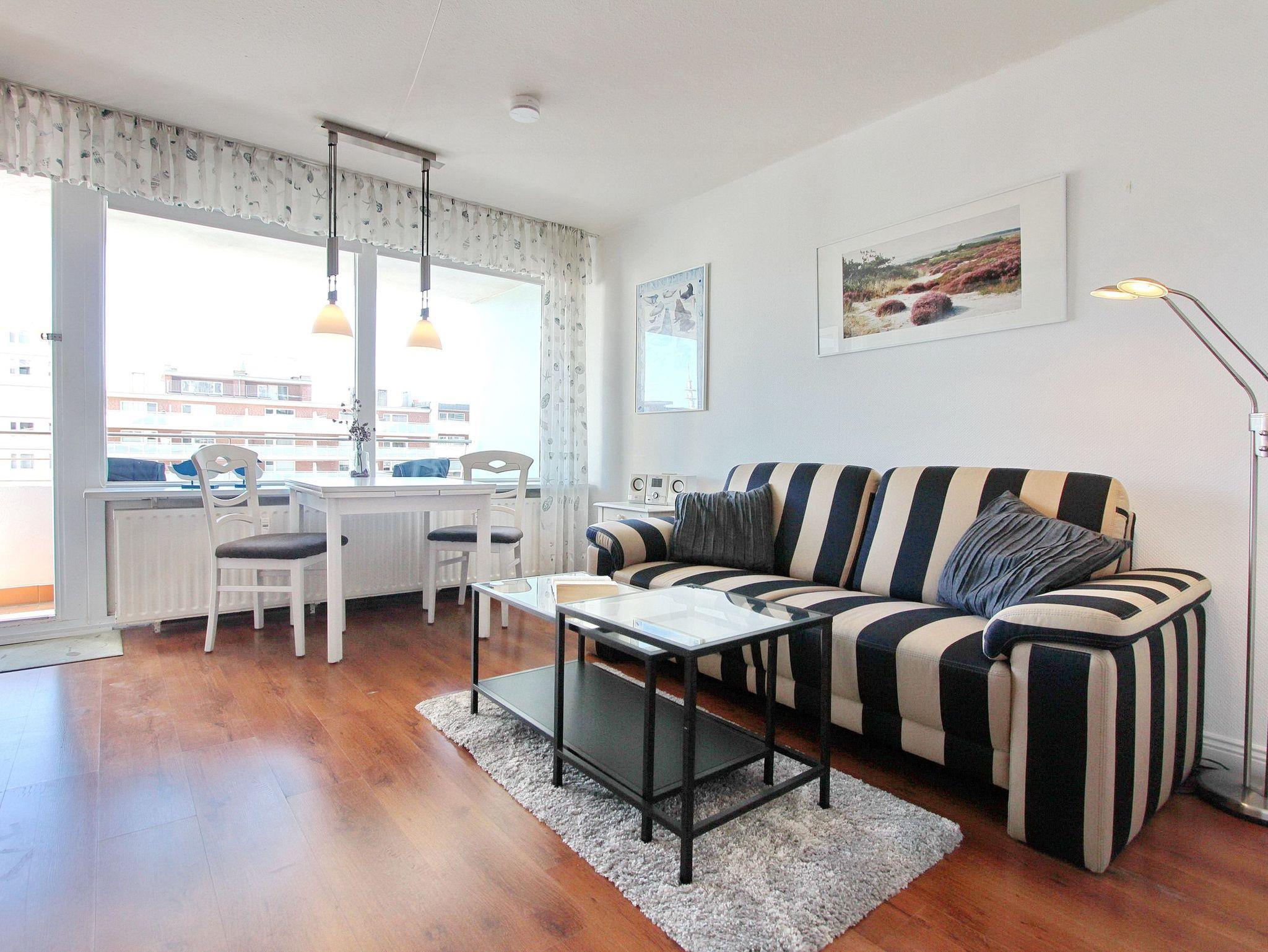 Diese hell und freundlich eingerichtete Nichtraucherwohnung befindet sich in der 1. Etage des Haus Metropol. Der kombinierte Wohn-/Schlafraum hat einen Ostbalkon mit Balkonmöbeln und Sitzauflagen. Sie können hier schon in den Morgenstunden die Sonne genießen. Das Appartement ist mit Einzelschrankbetten, einem Essplatz mit 2 Stühlen und einer Couch ausgestattet. Der Laminatfußboden verleiht dem Raum Wärme und Gemütlichkeit und macht die Wohnung auch für Allergiker geeignet. Das helle Badezimmer hat eine Dusche mit flachem Einstieg. In der Einbauküche mit Geschirrspüler und Mikrowelle können sie bequem kleine Mahlzeiten zubereiten. Zur technischen Ausstattung der Wohnung gehört: ein Flachbildfernseher von Sony, ein Radio mit CD Player sowie ein freier Zugang zum WLAN Netzwerk des Hauses (WEG Haus Metropol - Passwortfrei - ohne Gewähr). Wohnungsgröße: ca.30 m².