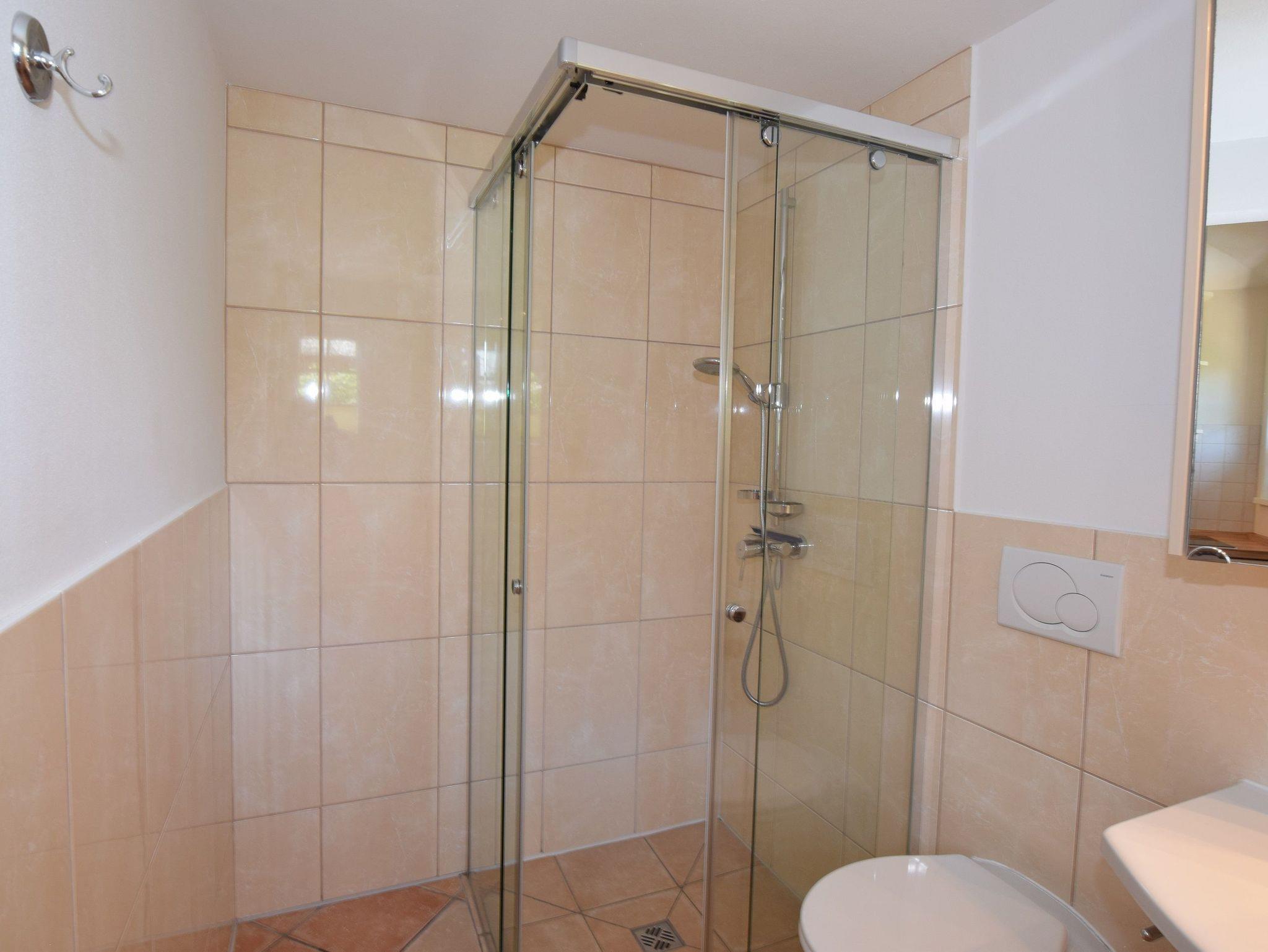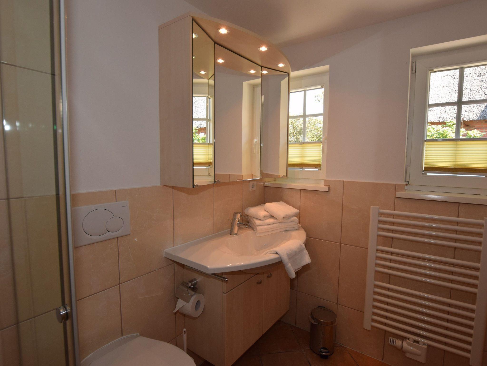 Das helle Badezimmer verfügt über eine ebenerdige Dusche, ein Fenster, einen Handtuchtrockner sowie einen Waschtisch mit Föhn.