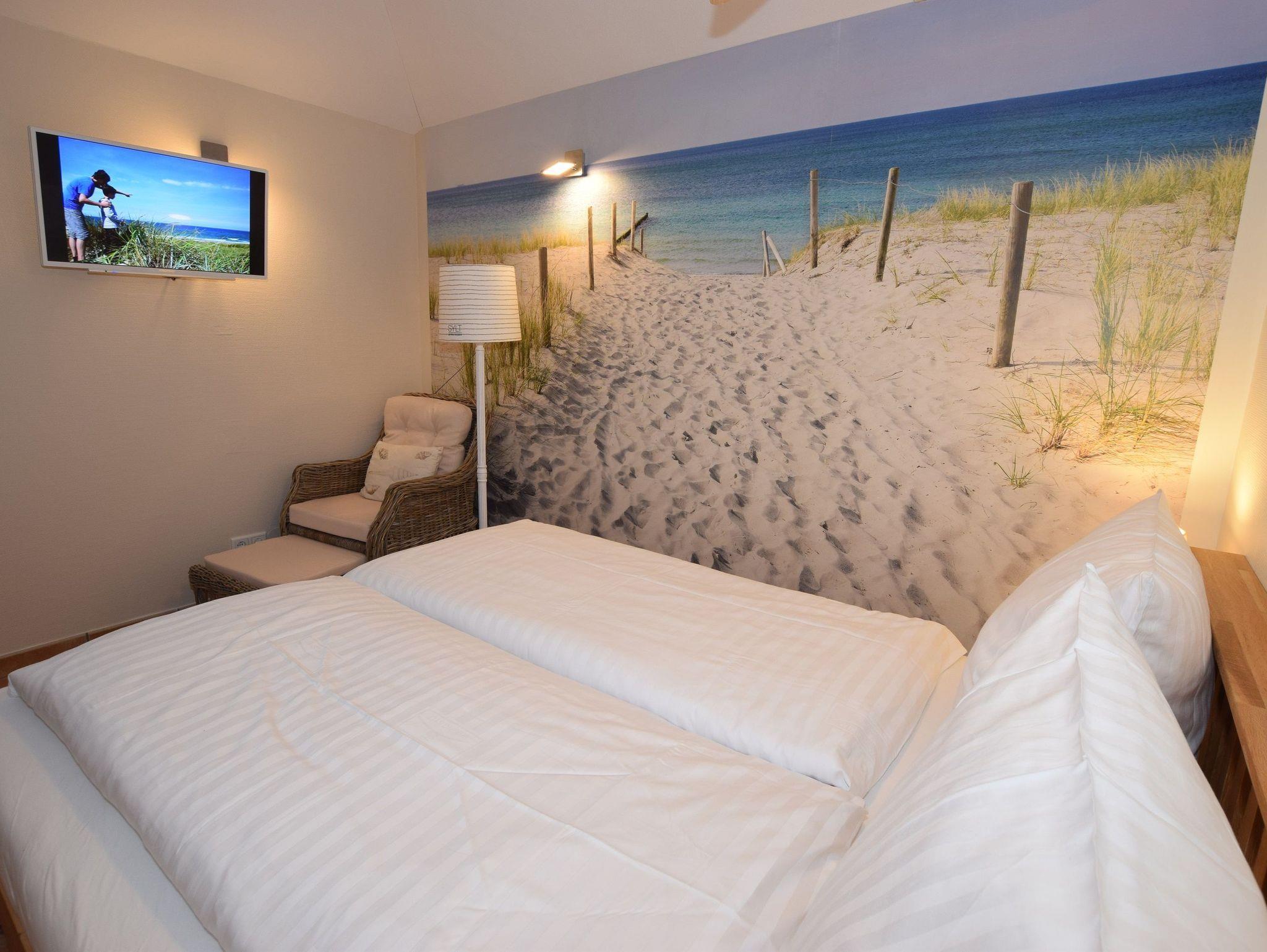 Der Wohn- und Schlafbereich ist durchdacht gestaltet: Ein komfortables Doppelbett (1,60 m x 2,00 m) mit zwei Einzelmatratzen und Bettdecken in Übergröße sorgt für erholsamen Schlaf. Ein an der Wand montierter Flachbild-TV (Kabelanschluss) sowie kostenfreies WLAN stehen für entspannte Stunden bereit.
