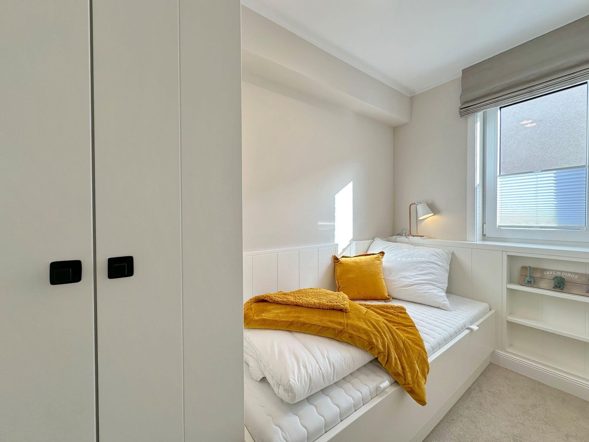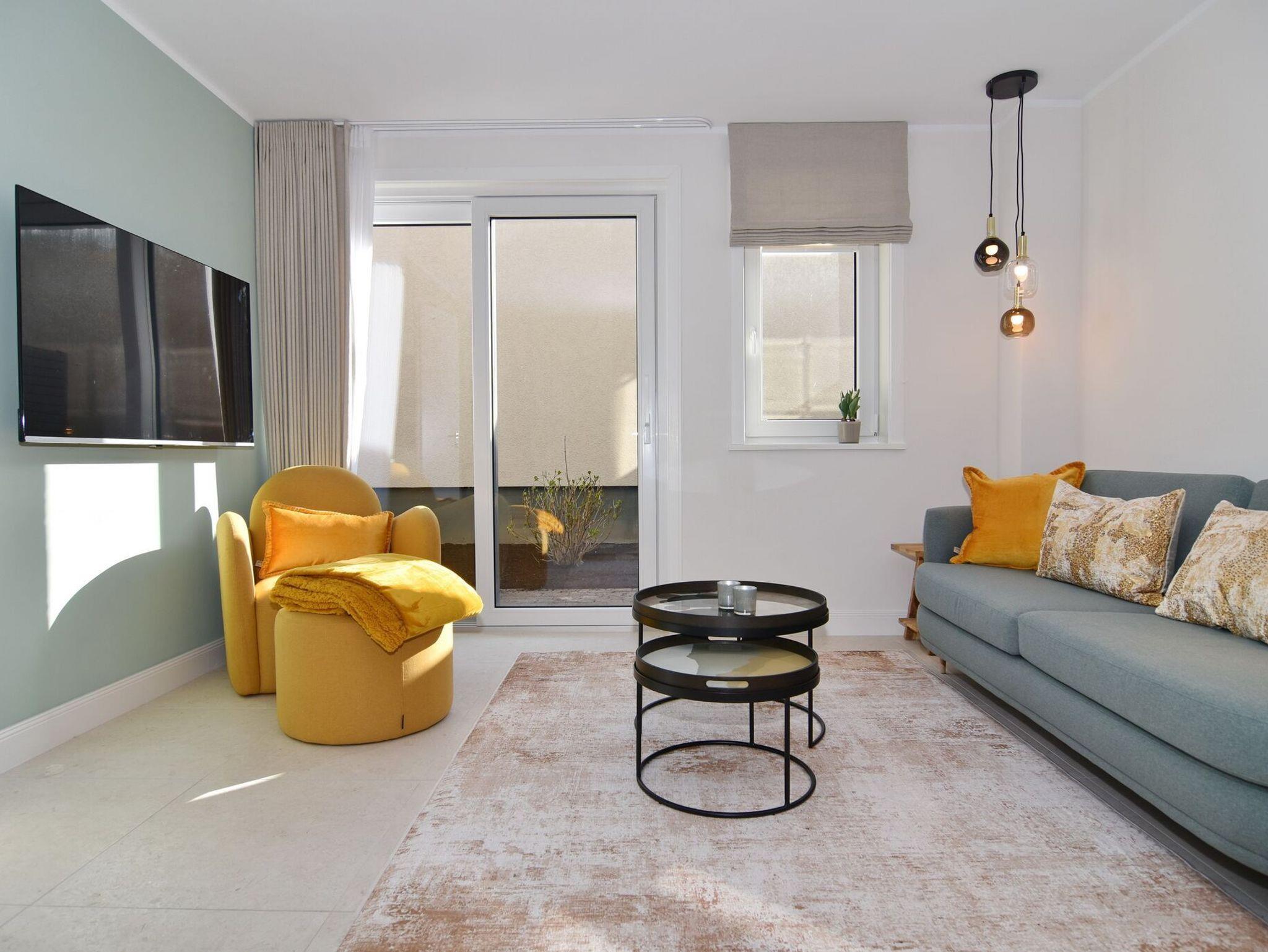 Die hochwertige 3-Zimmer-Erdgeschosswohnung mit ca. 60 qm ist für maximal 3 Personen ausgestattet. Vom geräumigen Flur mit Garderobe gelangen Sie in das Wohnzimmer mit offener Küche und möblierter Südterrasse. Die hochwertige Küche bietet neben Induktionsherd auch Geschirrspüler, Kühlschrank mit Gefrierfach und Backofen mit integrierter Mikrowelle. Die Wohnung bietet Ihnen zwei Schlafräume und ein Duschbad /WC mit Haar- und Handtuchtrockner. Das große Schlafzimmer ist mit einem Boxspringbett (200x200) der Marke FBF, Flat-TV und Einbauschrank ausgestattet (1 Kinderbett zubuchbar), das kleine Schlafzimmer hat ein vom Tischler eingebautes Einzelbett (90x200) und einen kleinen Einbauschrank.