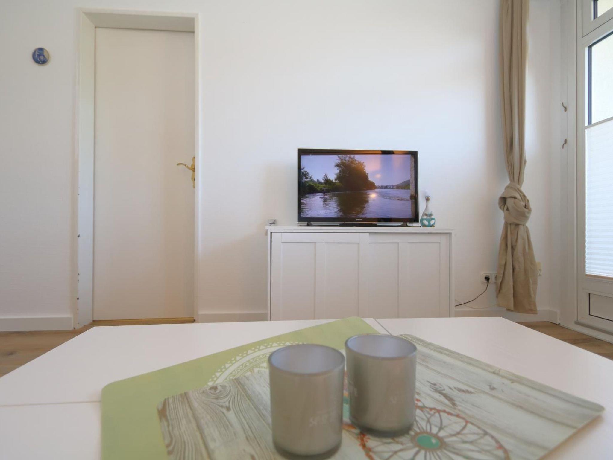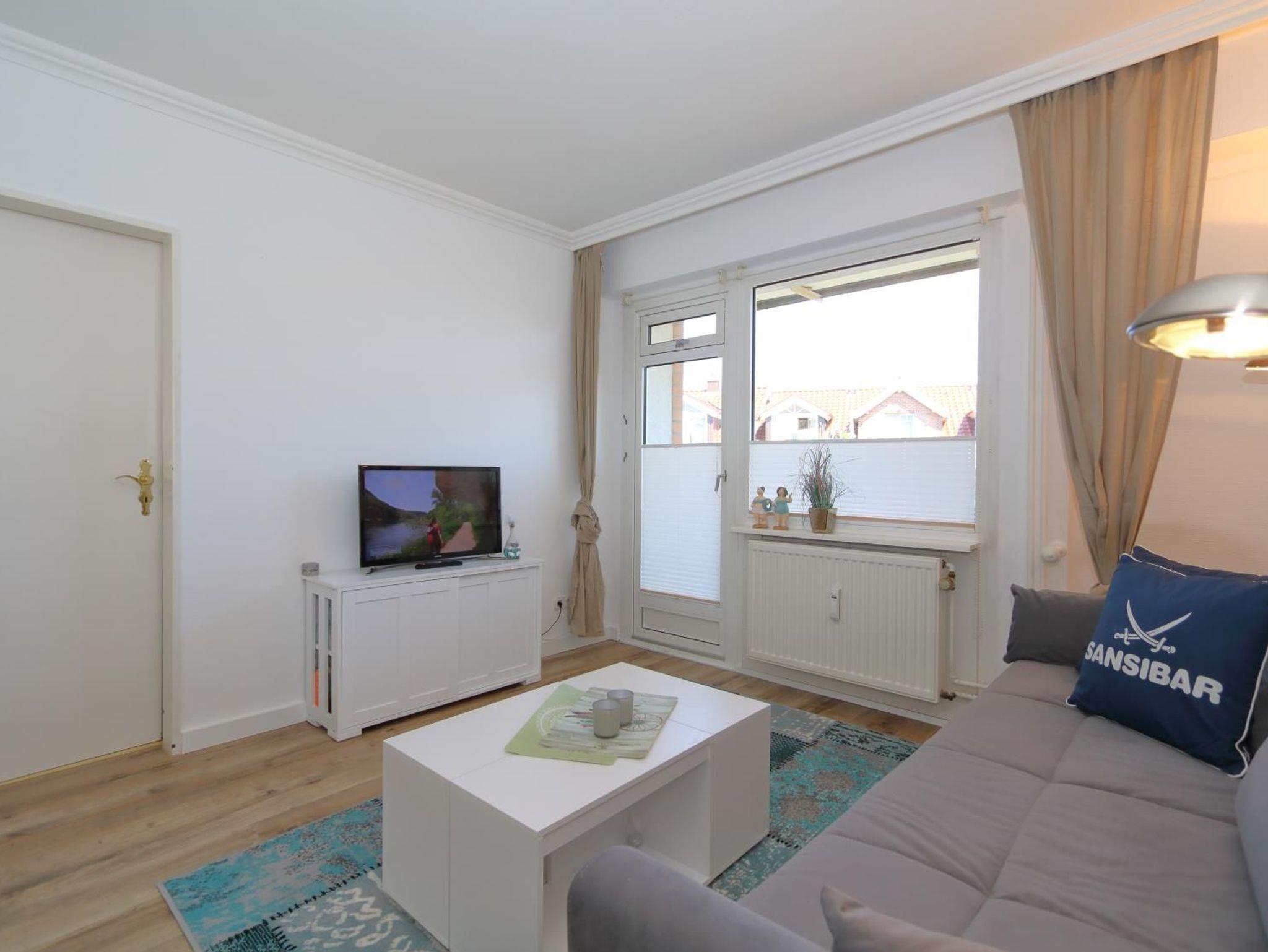 Der Wohnraum ist hell und gemütlich ausgestattet und dekoriert.