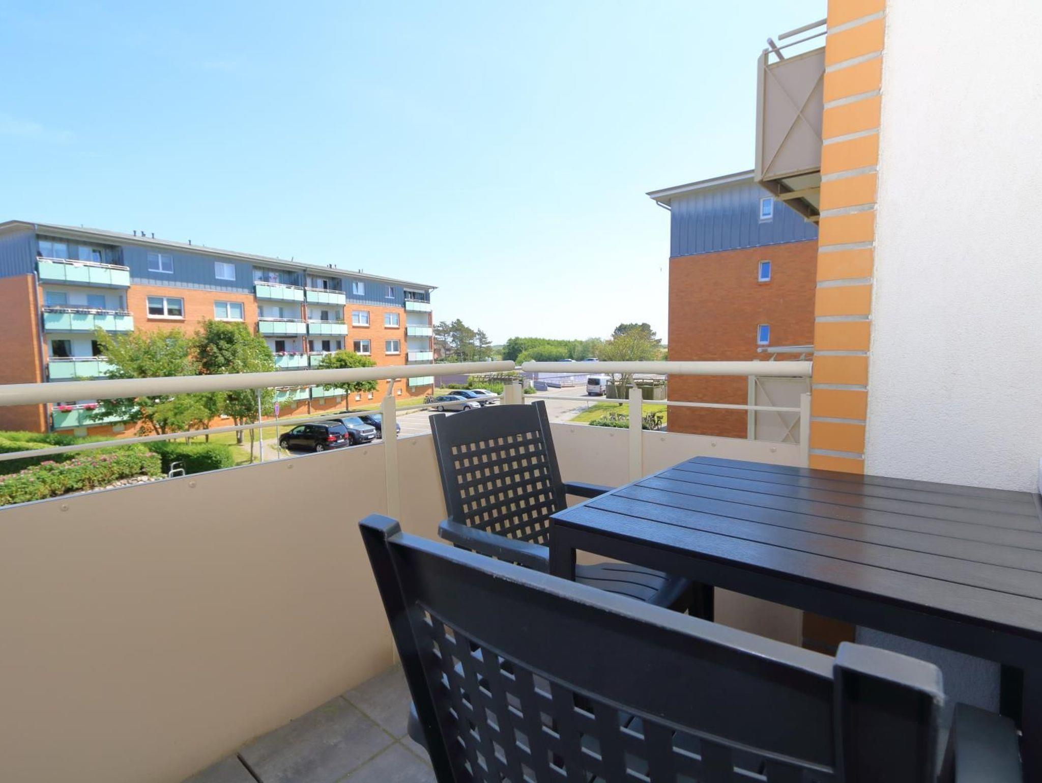 Der sonnige Balkon ist mit Stühlen und Tisch ausgestattet.