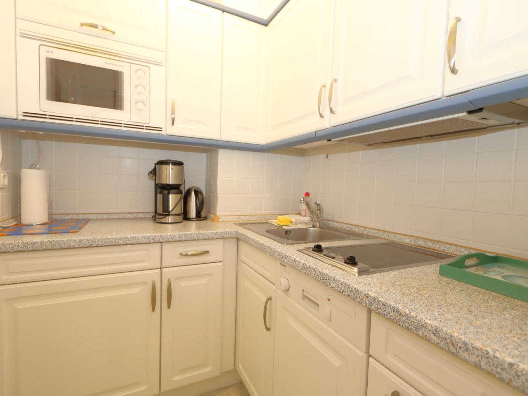 Die separate Küche mit Spülmaschine ist komplett ausgestattet. Kaffeemaschine, Wasserkocher und Toaster sind vorhanden.