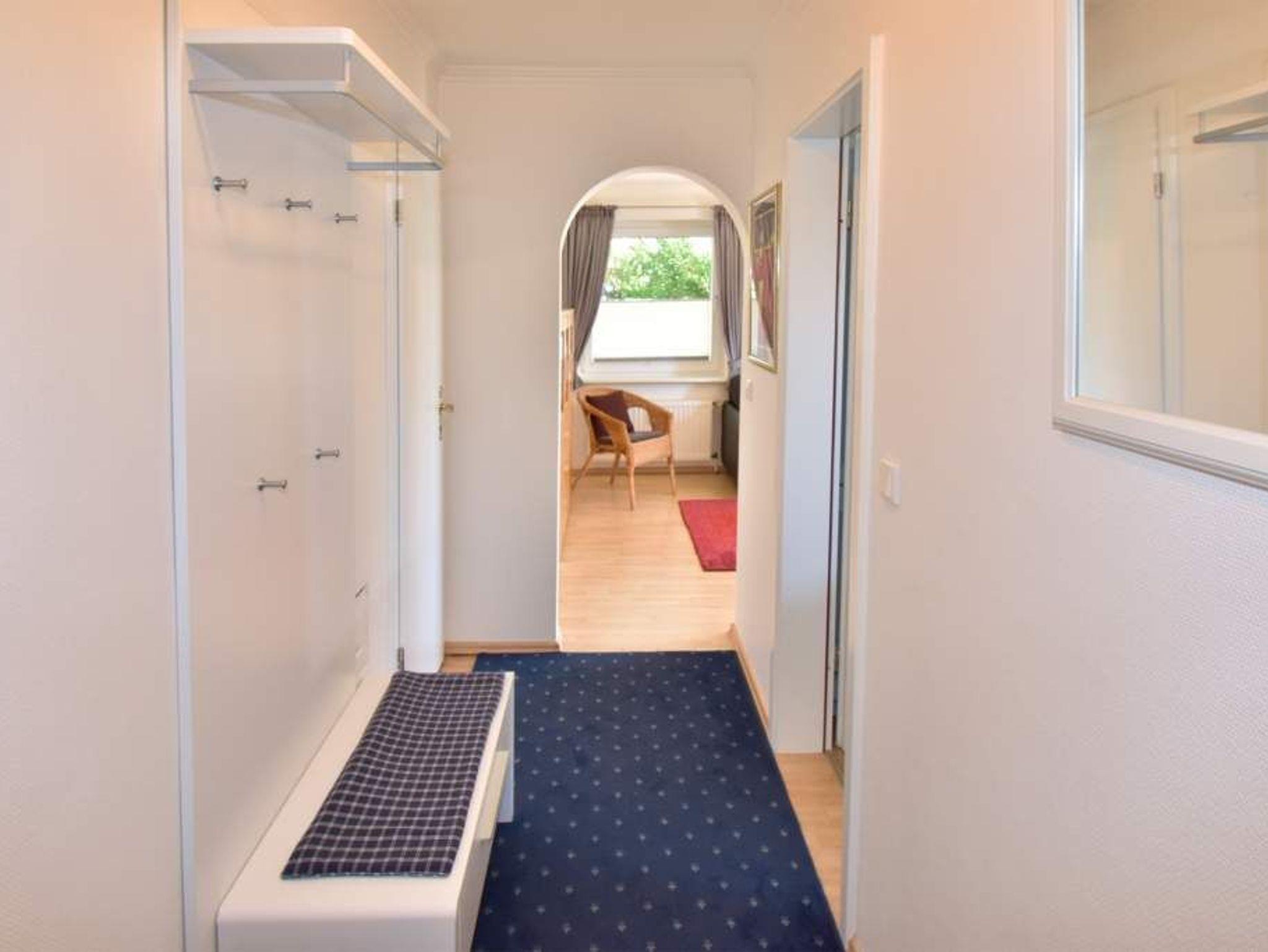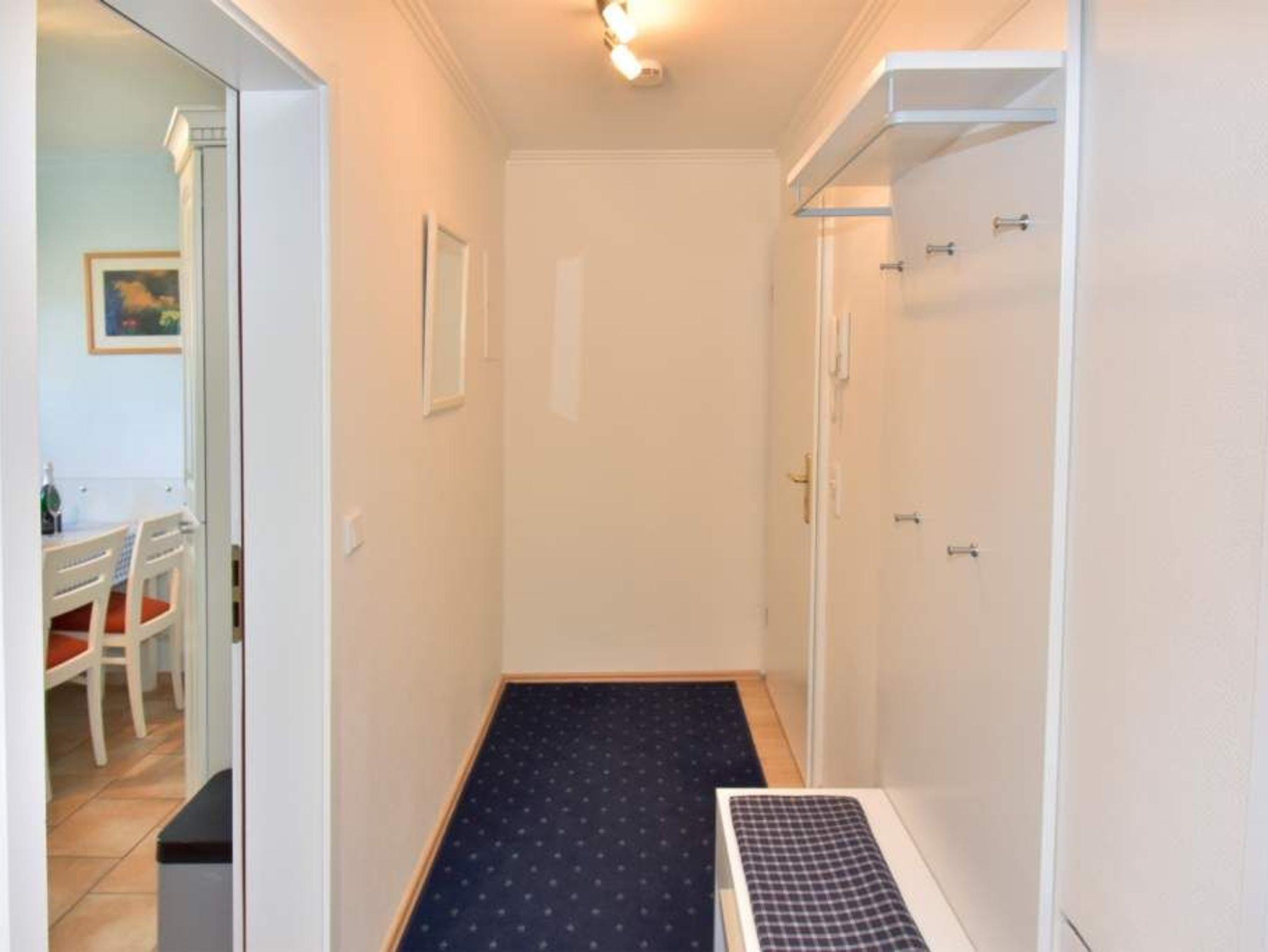 Im Eingangsbereich befindet sich der Flur mit Garderobe. Von dort gelangt man in das helle Wohnzimmer mit Zugang zur windgeschützten Terrasse, die Küche, das Schlafzimmer und das Duschbad/WC.