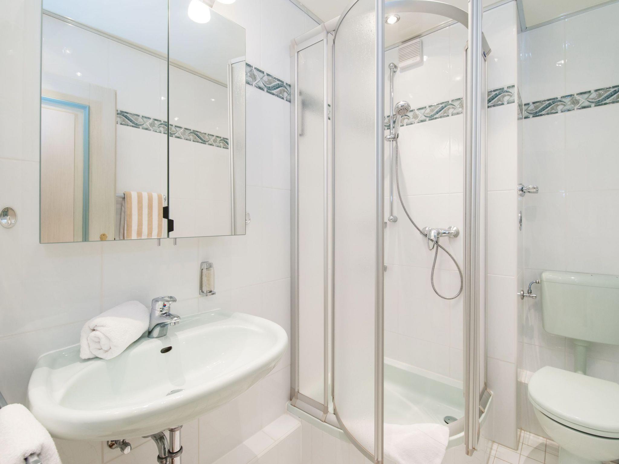 Im Bad befinden sich eine Dusche, ein WC und ein Waschtisch.