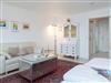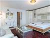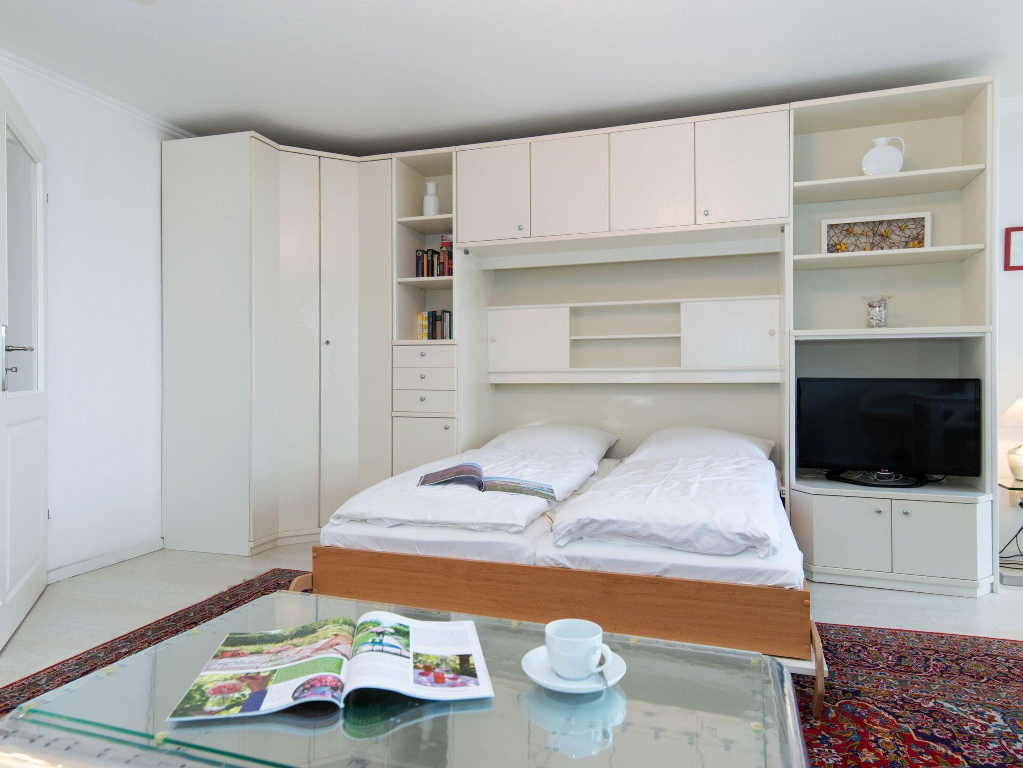 Der kombinierte Wohn-/Schlafraum besteht aus einer gemütlichen Sitzgarnitur (2-Sitzer-Couch), Doppelschrankbett (mit getrennten Matratzen, im Ganzen klappbar), Essplatz, Kabel-Flachbild-TV.
