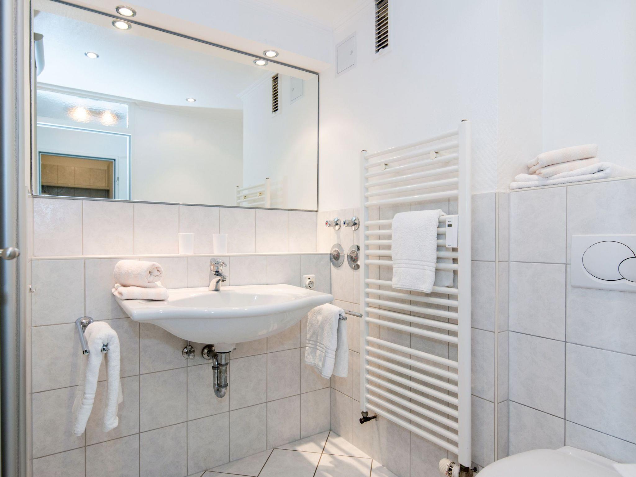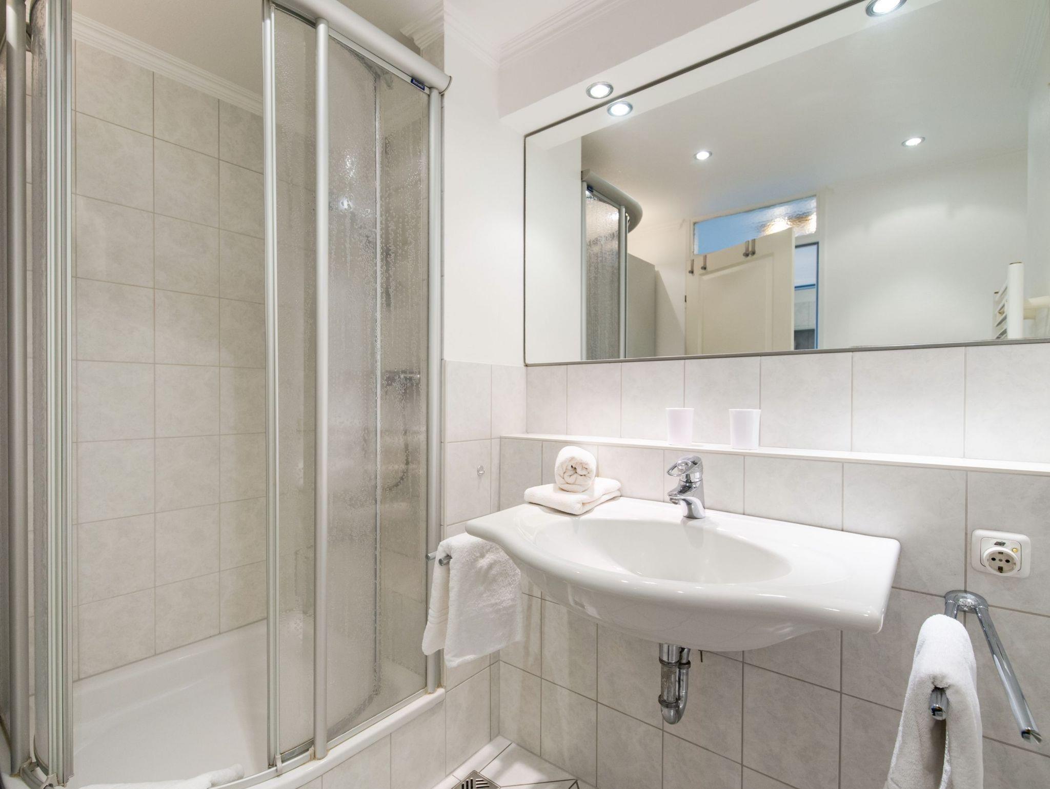 Das Bad hat eine Dusche, ein WC und ein Waschtisch.