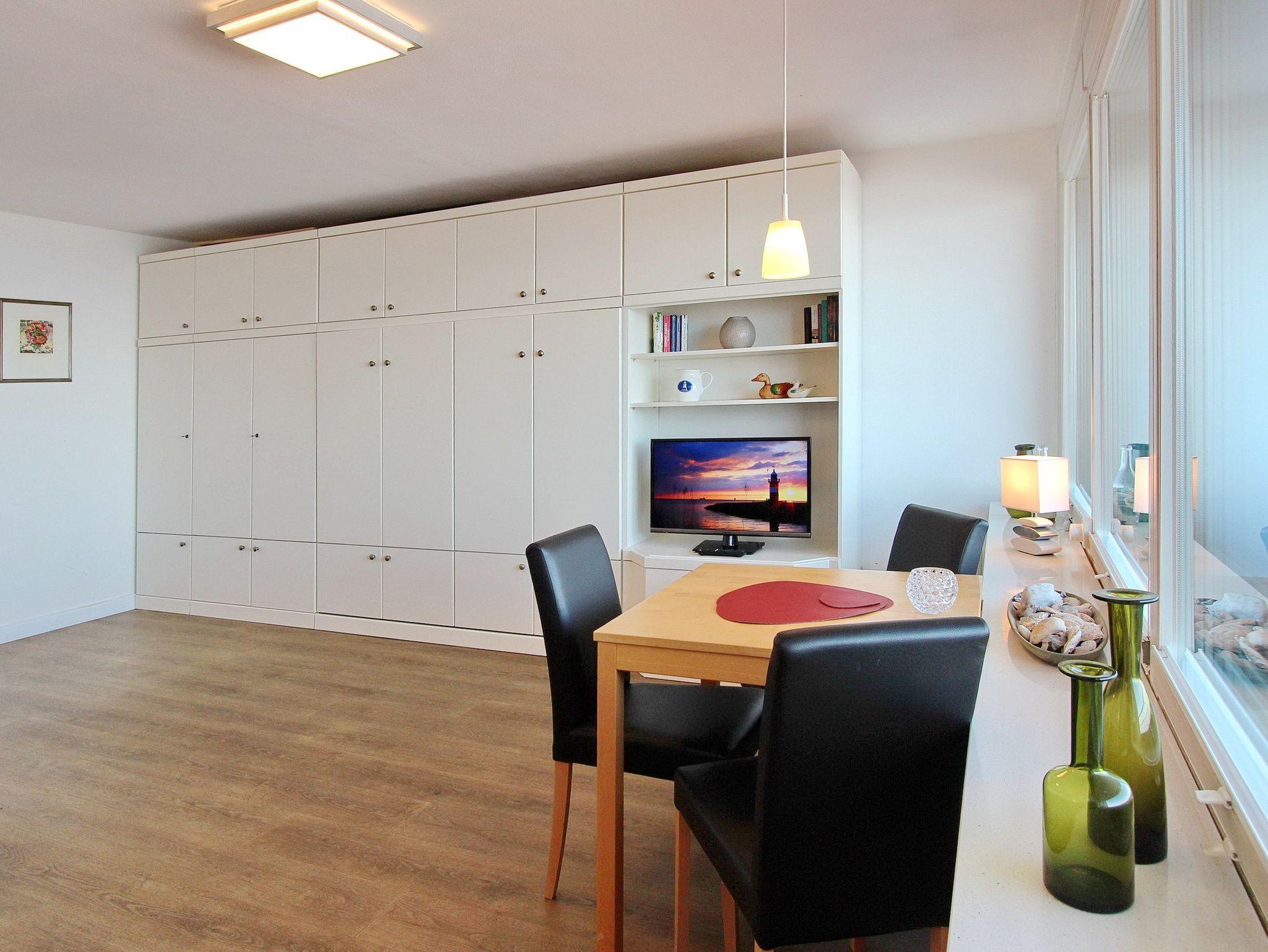 Einzimmerwohnung in der 8. Etage im Haus Metropol mit herrlichem Blick über den Strand und das Meer. Der kombinierte Wohn-/Schlafraum mit vorgelagertem Westbalkon (inkl. Loungemöbeln) verfügt über ein Doppelschrankbett, einen Essplatz am Fenster mit 3 Stühlen sowie ein bequemes, großes Sofa und einen Fernsehsessel. Laminatboden wurde in der ganzen Wohnung verlegt. Das Badezimmer mit Dusche hat einen beheizten Handtuchtrockner und vor allem viel Stauraum und Abstellfläche für ihre persönlichen Dinge. In der separaten Küche mit Geschirrspüler, Cerankochfeld, Mikrowelle und Backofen können sie sich selbst verpflegen. Zur technischen Ausstattung dieser Nichtraucherwohnung gehört: ein Flachbildfernseher, eine Sony Bluetoothanlage mit CD Player. Ein freies WLAN Netzwerk (WEG Haus Metropol - Passwortfrei - ohne Gewähr) steht ihnen kostenfrei zur Verfügung. Wohnungsgröße: ca. 42 m².