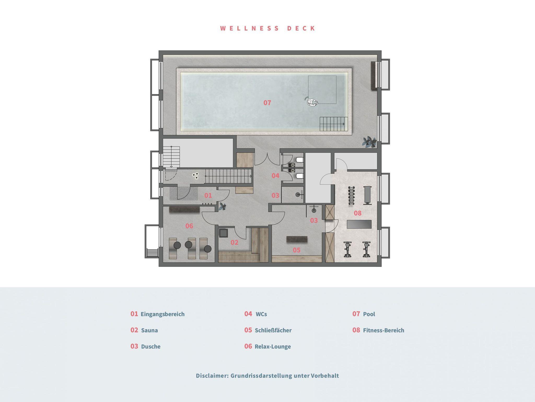 Sie sind ein Sport- und Wellness-Fan? Dann besuchen Sie unseren 200 qm großen gemeinschaftlichen Pool- und Saunabereich in Dock 6d, der von Ihnen als Gast kostenfrei genutzt werden kann. Ein paar Bahnen ziehen im 12 x 4 m großen Pool, einfach auf einer der Liegen relaxen oder doch lieber ein Workout? Im Fitnessraum warten 1 Laufband, 1 Rudergerät, 1 Bike sowie verschiedene Gewichte auf Ihre Gesellschaft. Danach empfehlen wir Ihnen zum Entspannen einen ausgiebigen Saunagang.