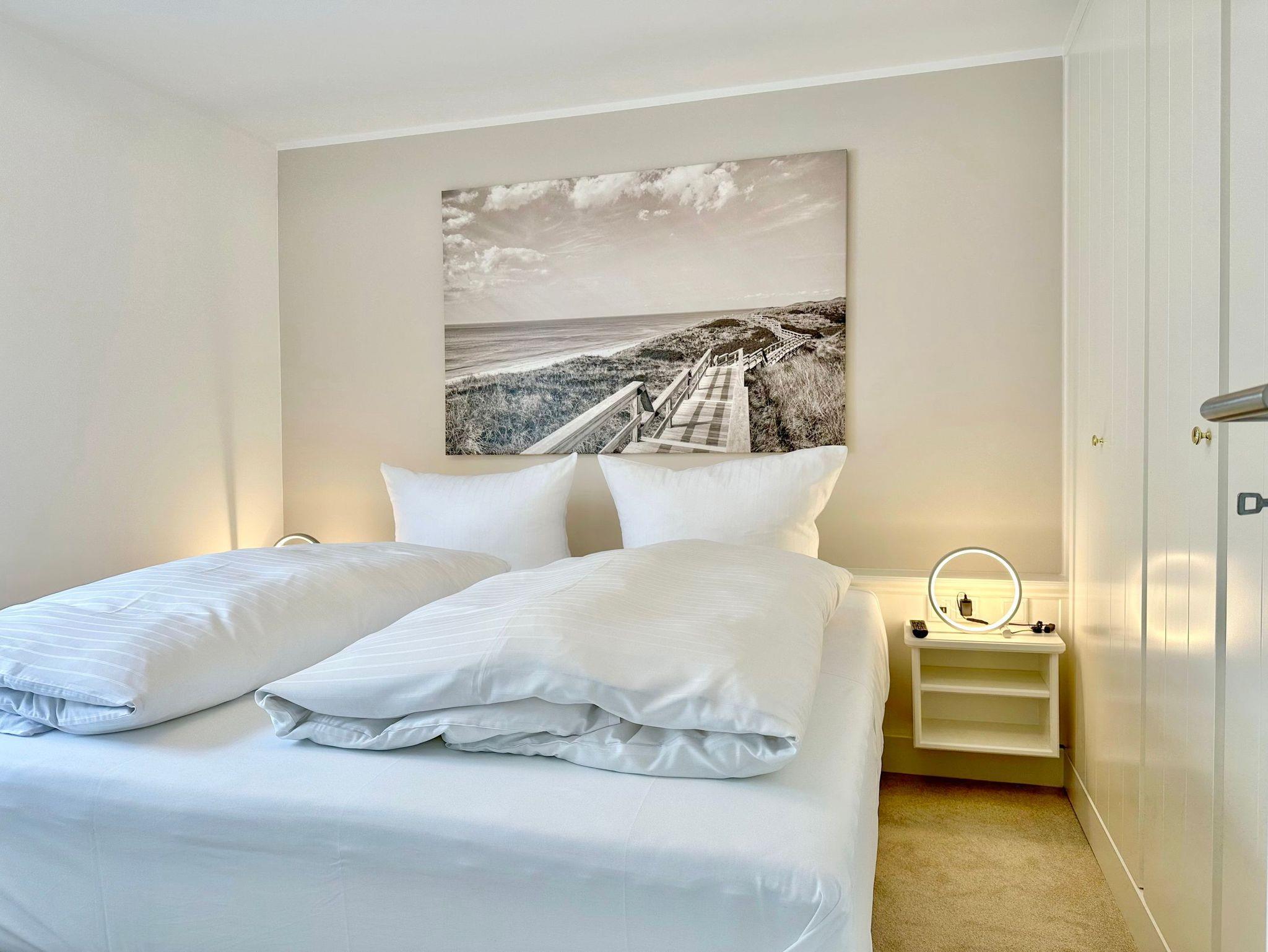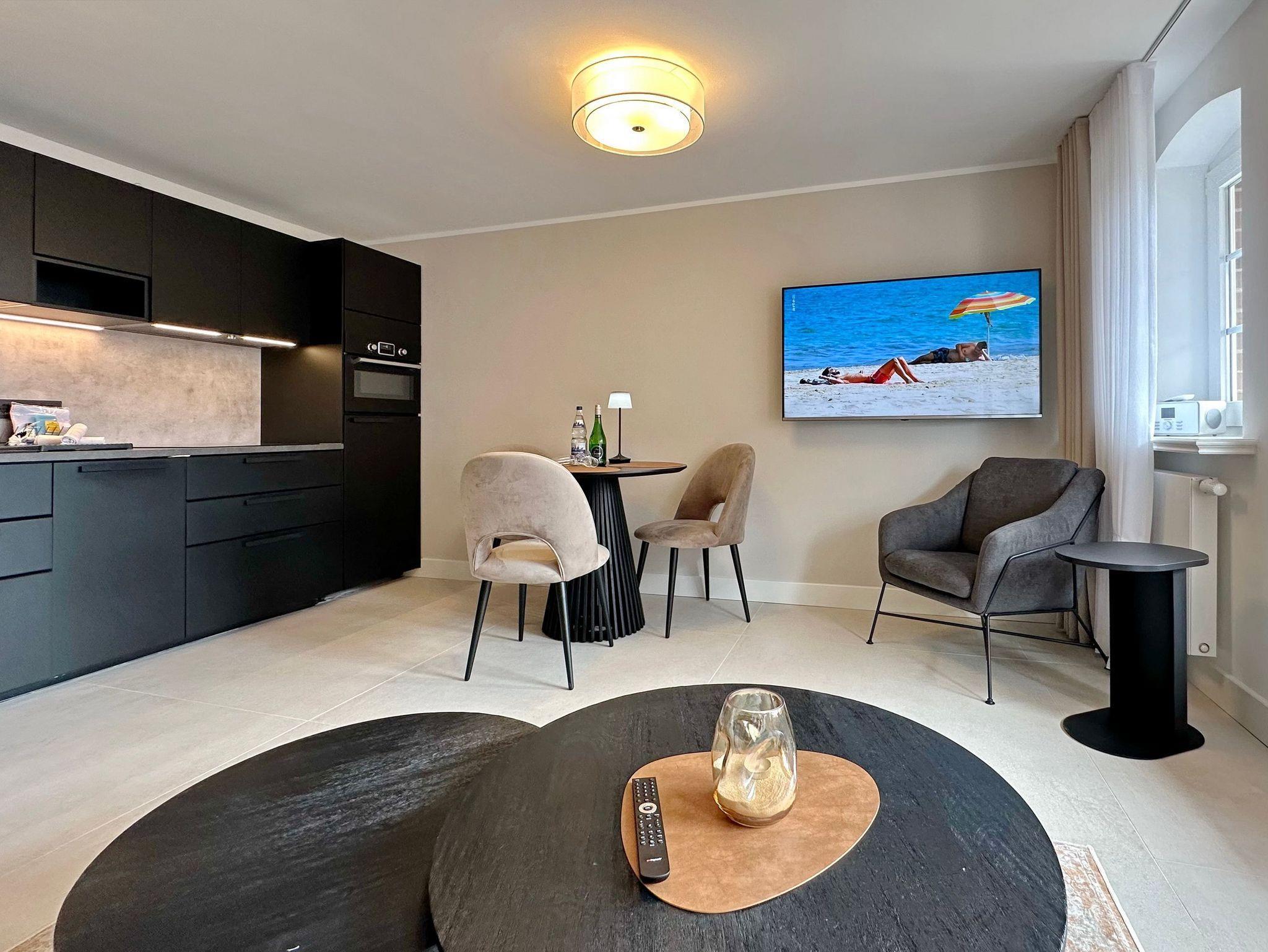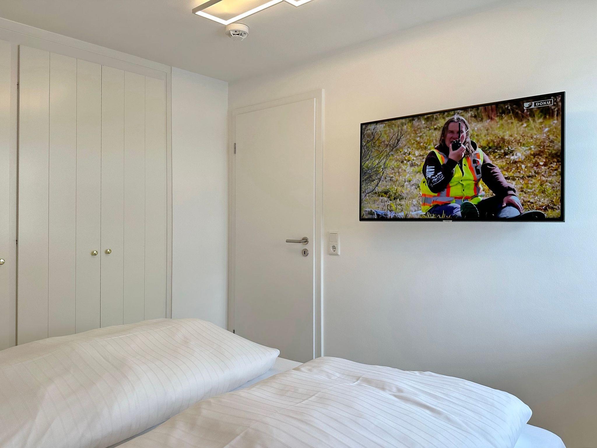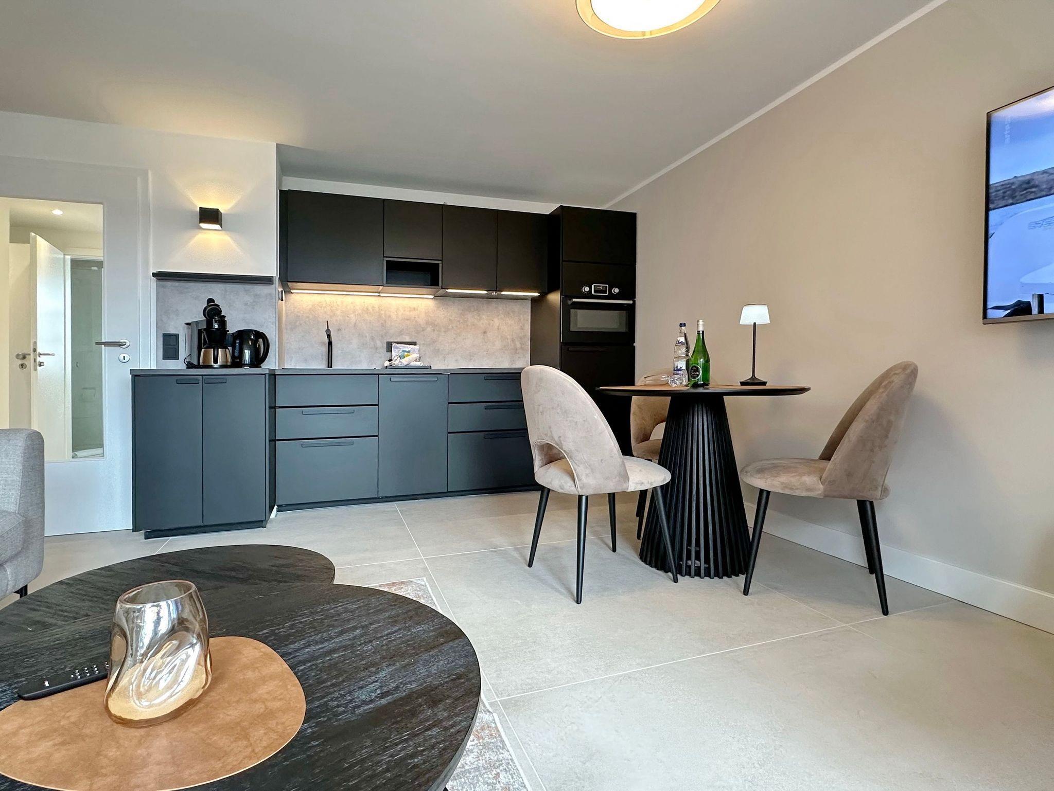 Geschmackvoll eingerichtete 2-Zimmer-Ferienwohnung im Haus Olympia 2 mit Südbalkon. Nichtraucherwohnung. Ca. 43m² im 1. Obergeschoß. Wohnzimmer mit offener Küche mit Induktionsherd, Geschirrspüler und Mikrowelle-Backofen-Kombination, Essplatz, 2-Sitzer-Couch, Korbsessel und Hocker, Flat-TV und Radio. Schlafzimmer mit Doppelbett, Einbauschrank und TV, Duschbad/WC, Flur. Tierhaltung nicht gestattet. Unter Haus 4 befindet sich das Schwimmbad mit Finnischer Sauna. Unter Haus 2 befindet sich ein separater Wellnessbereich mit Dampfsauna, Finnischer Sauna und Ruhebereich. Eine Waschküche mit Gemeinschaftswaschmaschine/Trockner ist vorhanden. Offenes W-LAN-Netzwerk steht zur Verfügung (ohne Gewähr). Bettwäsche und Handtücher sind zur Anreise aufgezogen. Ein Garagenstellplatz kann kostenpflichtig gebucht werden!