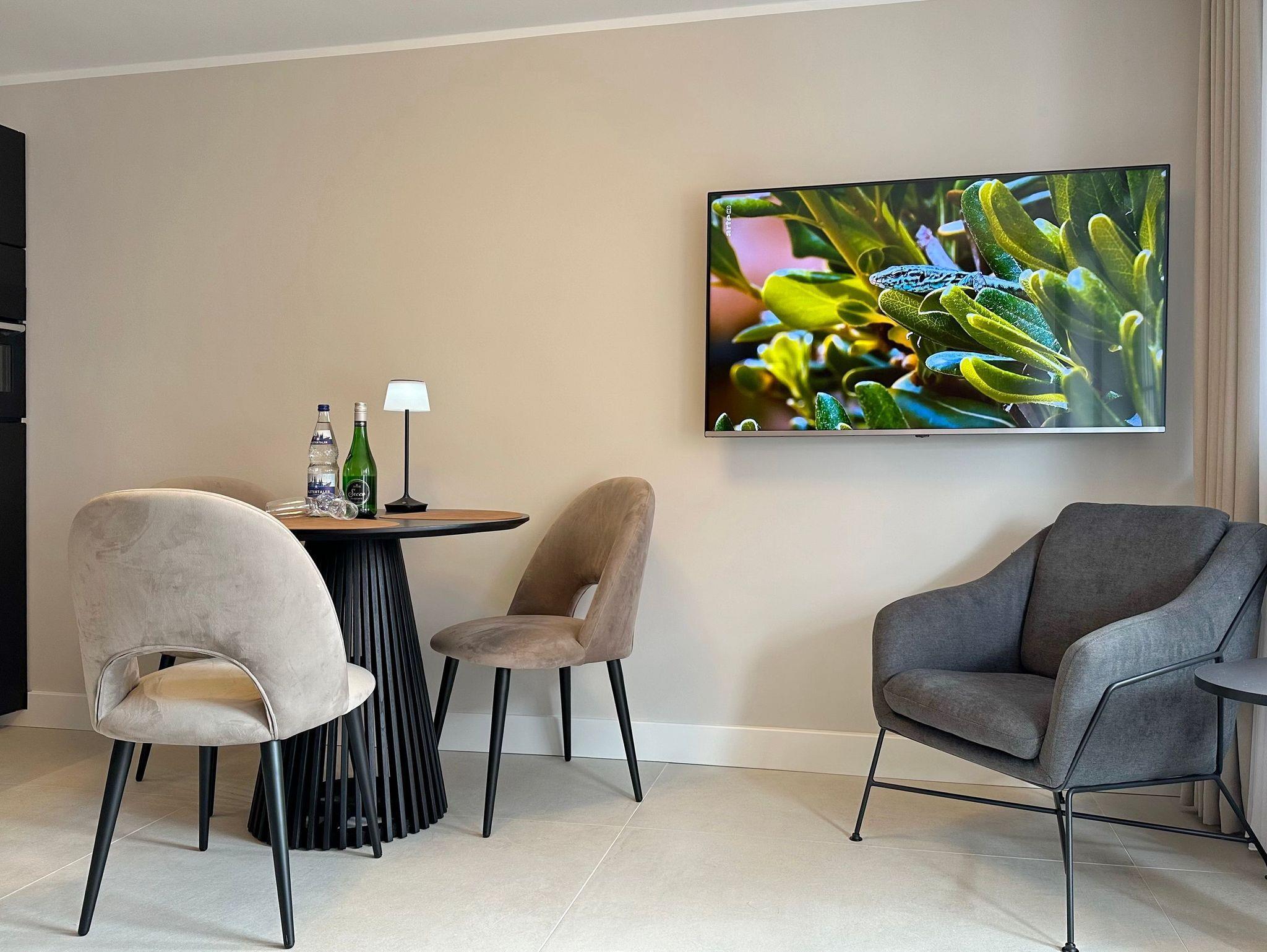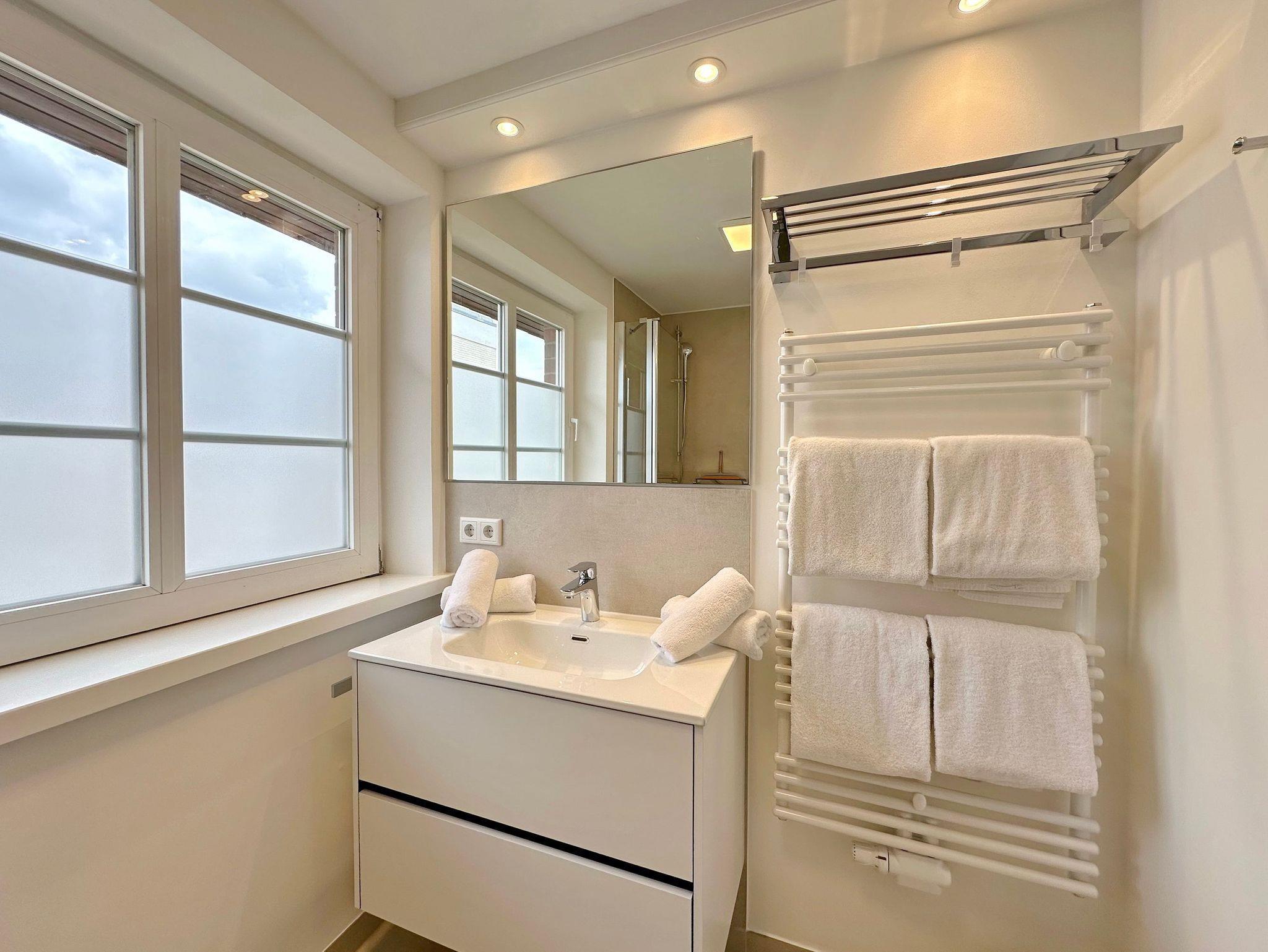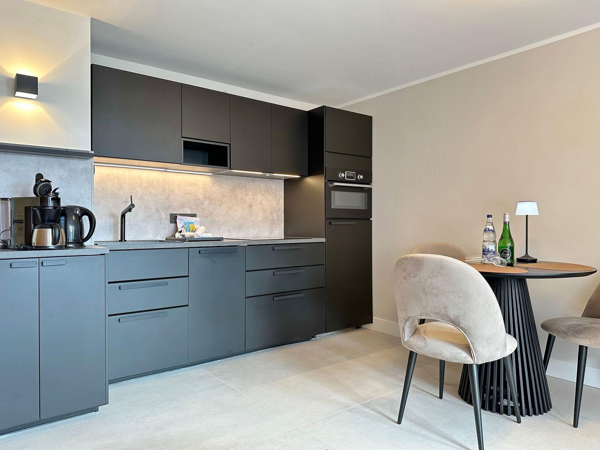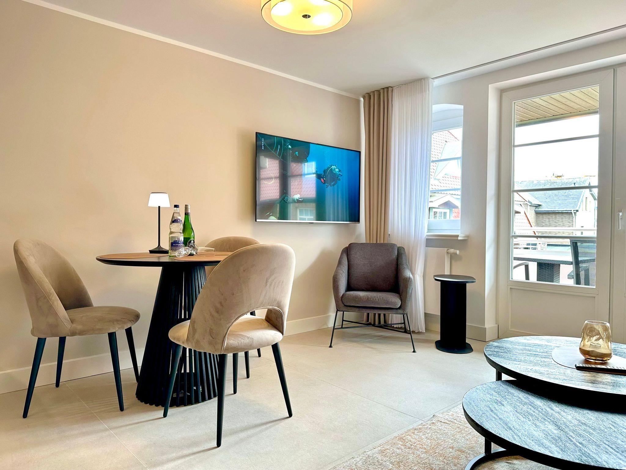 Geschmackvoll eingerichtete 2-Zimmer-Ferienwohnung im Haus Olympia 2 mit Südbalkon. Nichtraucherwohnung. Ca. 43m² im 1. Obergeschoß. Wohnzimmer mit offener Küche mit Induktionsherd, Geschirrspüler und Mikrowelle-Backofen-Kombination, Essplatz, 2-Sitzer-Couch, Korbsessel und Hocker, Flat-TV und Radio. Schlafzimmer mit Doppelbett, Einbauschrank und TV, Duschbad/WC, Flur. Tierhaltung nicht gestattet. Unter Haus 4 befindet sich das Schwimmbad mit Finnischer Sauna. Unter Haus 2 befindet sich ein separater Wellnessbereich mit Dampfsauna, Finnischer Sauna und Ruhebereich. Eine Waschküche mit Gemeinschaftswaschmaschine/Trockner ist vorhanden. Offenes W-LAN-Netzwerk steht zur Verfügung (ohne Gewähr). Bettwäsche und Handtücher sind zur Anreise aufgezogen. Ein Garagenstellplatz kann kostenpflichtig gebucht werden!