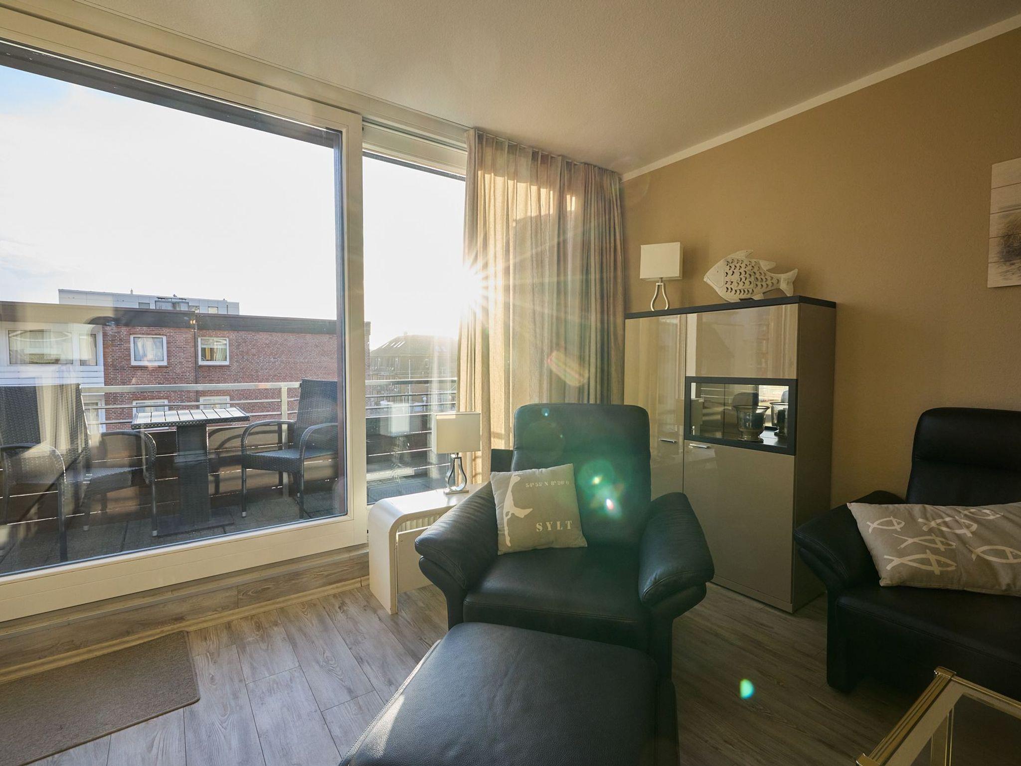 Vor Ihnen liegt nun direkt der helle Wohnbereich mit Lederausstattung und direktem Zugang zum Balkon. Durch die Lage zur Südseite ist die Wohnung, trotz direkter City-Lage, sehr ruhig gelegen. Der Balkon hat Option auf ganztägige Sonne. Ebenfalls im Raum finden Sie eine voll ausgestattete Küchenecke mit einem Essbereich.