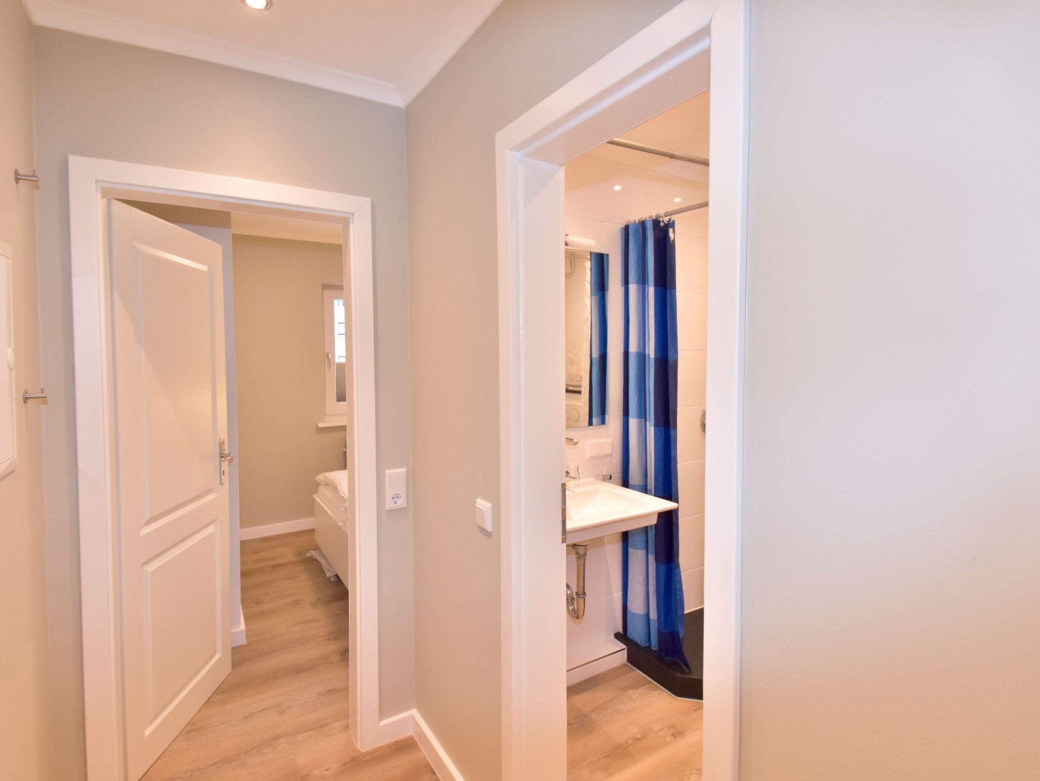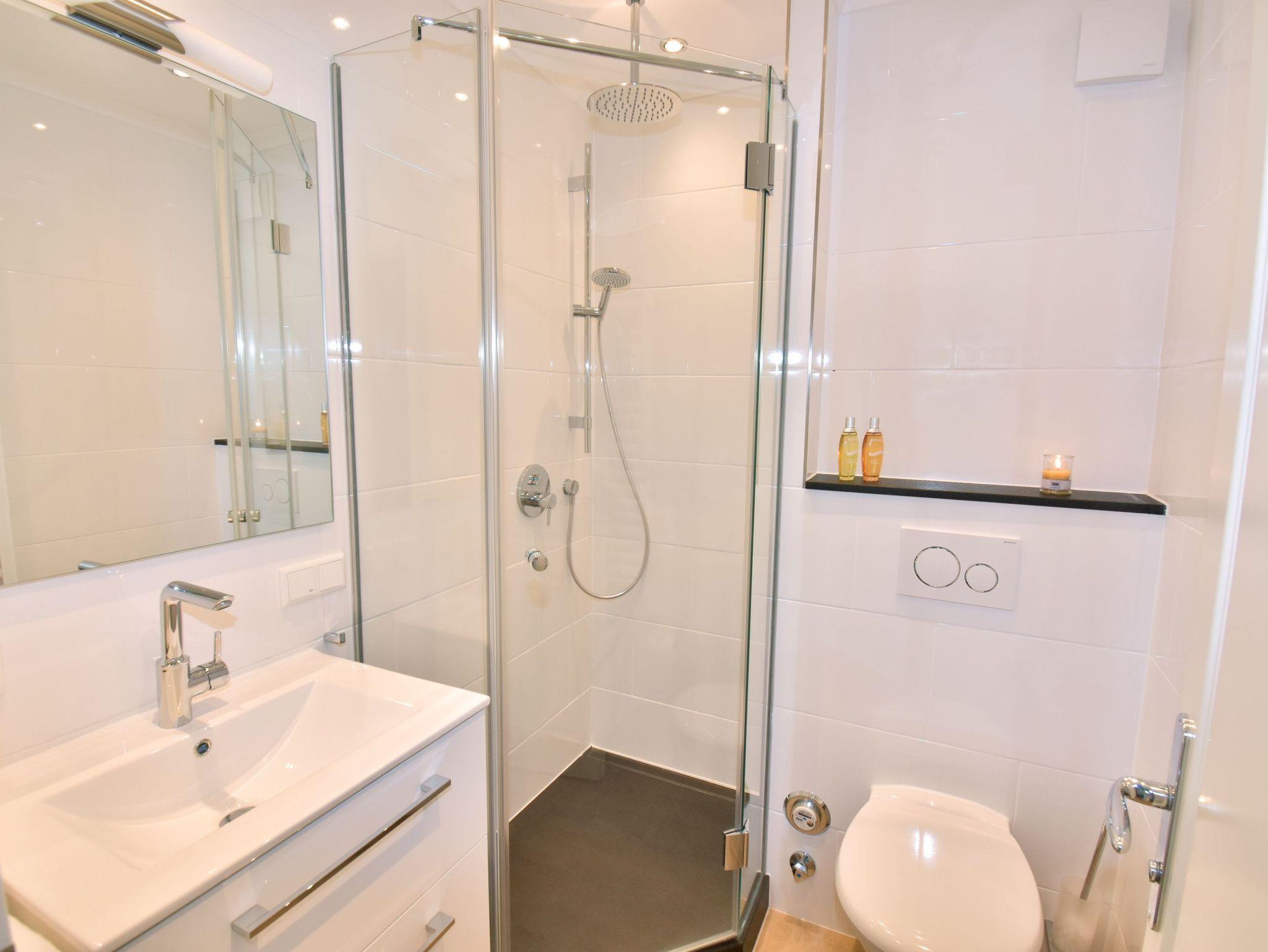 Das moderne neue Badezimmer bietet eine Dusche mit extraflachem Einstieg, einen Handtuchheizkörper, einen Waschtisch, Fön und WC und ist perfekt für den Start in einen entspannten Urlaubstag.