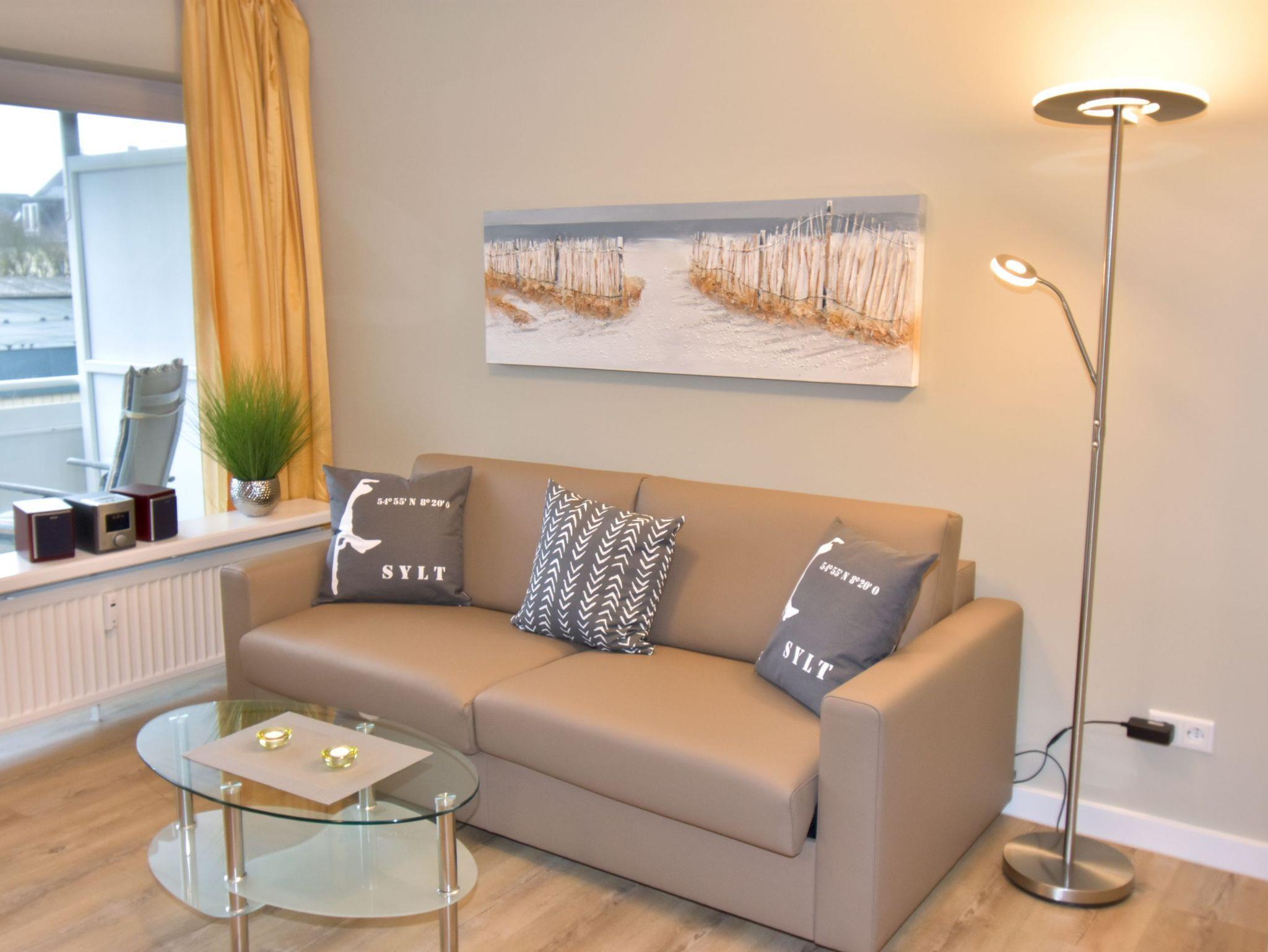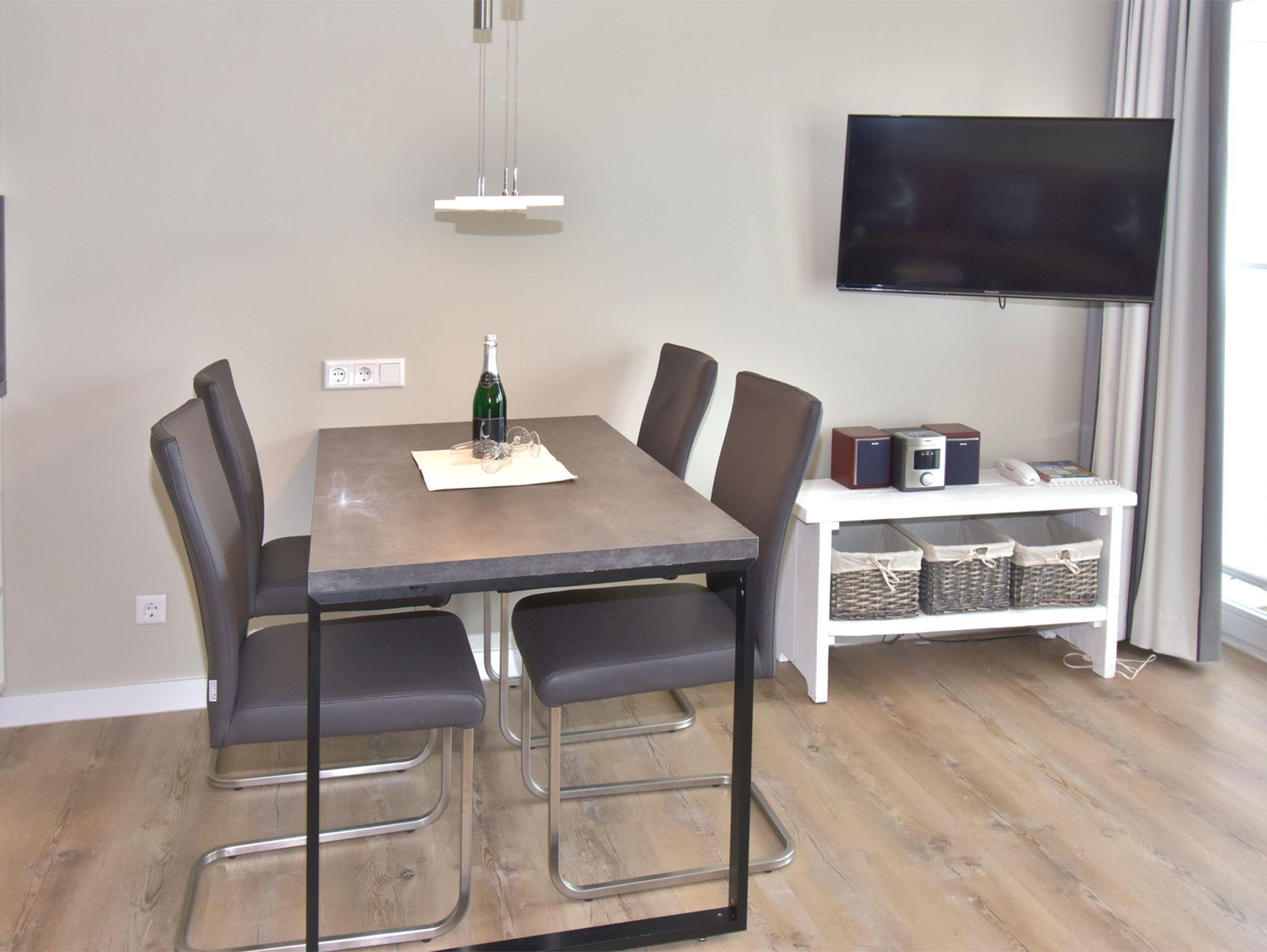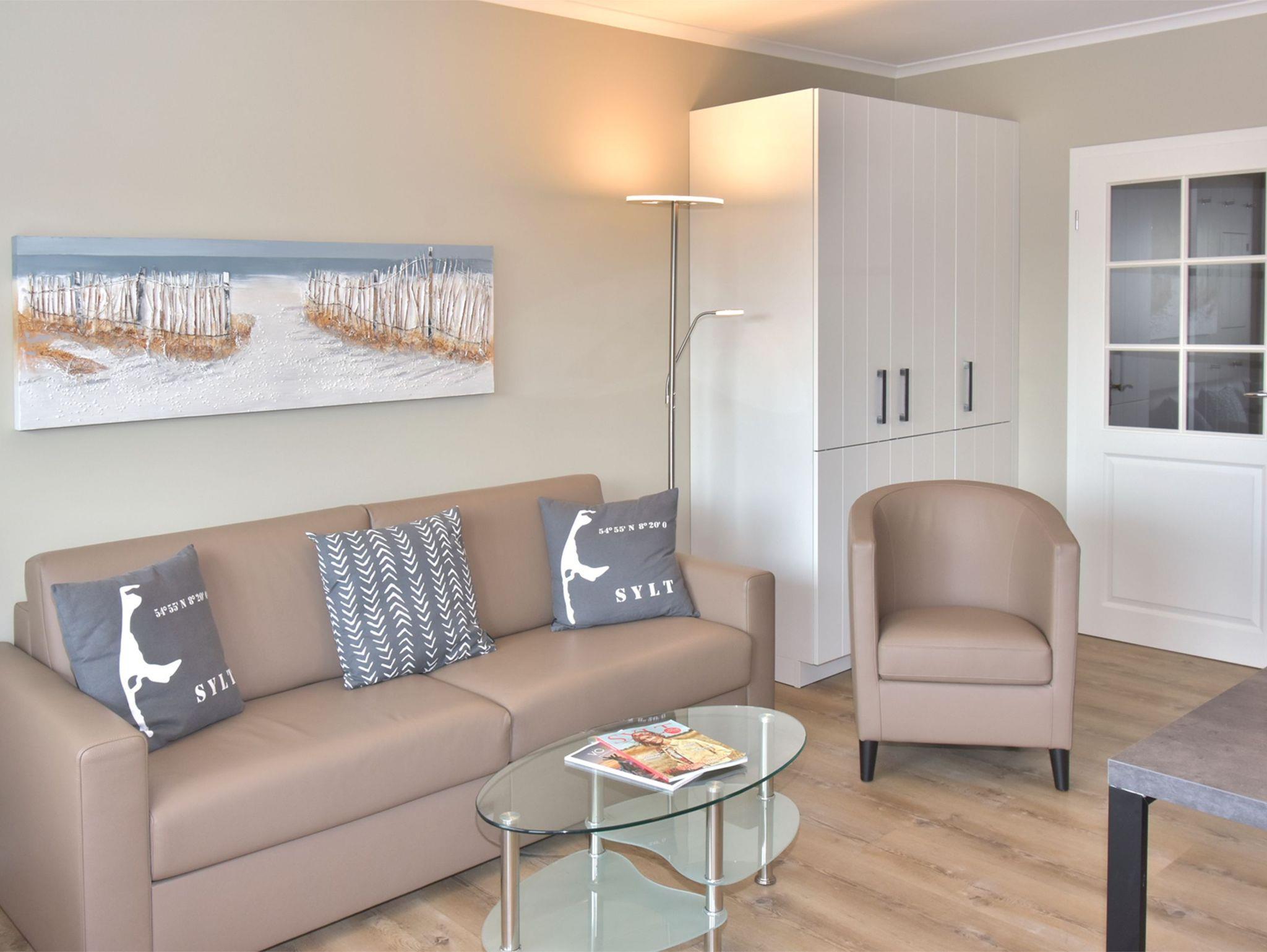 Im Wohnraum lässt die Ausstattung mit einem 49-Zoll-Flachbild-TV keine Wünsche offen. Des weiteren sorgt eine hochwertige Schlafcouch von Bielefelder Werkstätten mit einer Liegefläche von 1,40 x 1,98 m in Komforthöhe für optimalen Schlafkomfort. Ein gemütlicher Cocktailsessel lädt zum relaxen ein.