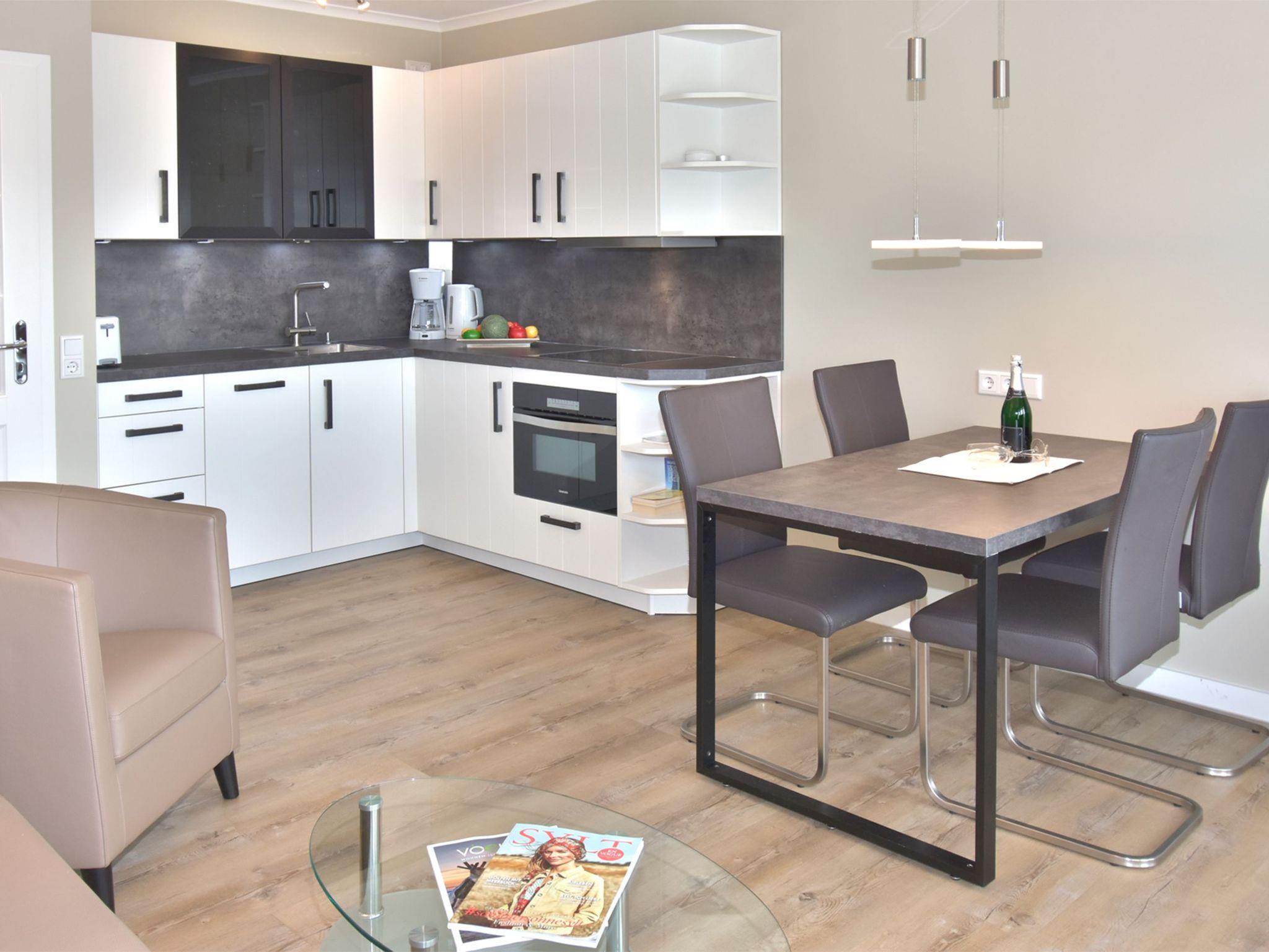 Die hochwertige, offene neue Küche ist mit Cerankochfeld (4Kochfelder), Nespresso-Maschine, Mikrowelle mit Backofenfunktion und Geschirrspüler voll ausgestattet. Wasserkocher, Kaffeemaschine und Kühlschrank mit 3-Sterne-Gefrierfach gehören zur Grundausstattung.